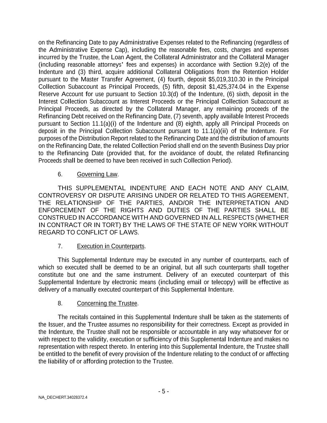 - 5 - NA_DECHERT.34028372.4 on the Refinancing Date to pay Administrative Expenses related to the Refinancing (regardless of the Administrative Expense Cap), including the reasonable fees, costs, charges and expenses incurred by the Trustee, the Loan Agent, the Collateral Administrator and the Collateral Manager (including reasonable attorneys’ fees and expenses) in accordance with Section 9.2(e) of the Indenture and (3) third, acquire additional Collateral Obligations from the Retention Holder pursuant to the Master Transfer Agreement, (4) fourth, deposit $5,019,310.30 in the Principal Collection Subaccount as Principal Proceeds, (5) fifth, deposit $1,425,374.04 in the Expense Reserve Account for use pursuant to Section 10.3(d) of the Indenture, (6) sixth, deposit in the Interest Collection Subaccount as Interest Proceeds or the Principal Collection Subaccount as Principal Proceeds, as directed by the Collateral Manager, any remaining proceeds of the Refinancing Debt received on the Refinancing Date, (7) seventh, apply available Interest Proceeds pursuant to Section 11.1(a)(i) of the Indenture and (8) eighth, apply all Principal Proceeds on deposit in the Principal Collection Subaccount pursuant to 11.1(a)(ii) of the Indenture. For purposes of the Distribution Report related to the Refinancing Date and the distribution of amounts on the Refinancing Date, the related Collection Period shall end on the seventh Business Day prior to the Refinancing Date (provided that, for the avoidance of doubt, the related Refinancing Proceeds shall be deemed to have been received in such Collection Period). 6. Governing Law. THIS SUPPLEMENTAL INDENTURE AND EACH NOTE AND ANY CLAIM, CONTROVERSY OR DISPUTE ARISING UNDER OR RELATED TO THIS AGREEMENT, THE RELATIONSHIP OF THE PARTIES, AND/OR THE INTERPRETATION AND ENFORCEMENT OF THE RIGHTS AND DUTIES OF THE PARTIES SHALL BE CONSTRUED IN ACCORDANCE WITH AND GOVERNED IN ALL RESPECTS (WHETHER IN CONTRACT OR IN TORT) BY THE LAWS OF THE STATE OF NEW YORK WITHOUT REGARD TO CONFLICT OF LAWS. 7. Execution in Counterparts. This Supplemental Indenture may be executed in any number of counterparts, each of which so executed shall be deemed to be an original, but all such counterparts shall together constitute but one and the same instrument. Delivery of an executed counterpart of this Supplemental Indenture by electronic means (including email or telecopy) will be effective as delivery of a manually executed counterpart of this Supplemental Indenture. 8. Concerning the Trustee. The recitals contained in this Supplemental Indenture shall be taken as the statements of the Issuer, and the Trustee assumes no responsibility for their correctness. Except as provided in the Indenture, the Trustee shall not be responsible or accountable in any way whatsoever for or with respect to the validity, execution or sufficiency of this Supplemental Indenture and makes no representation with respect thereto. In entering into this Supplemental Indenture, the Trustee shall be entitled to the benefit of every provision of the Indenture relating to the conduct of or affecting the liability of or affording protection to the Trustee.