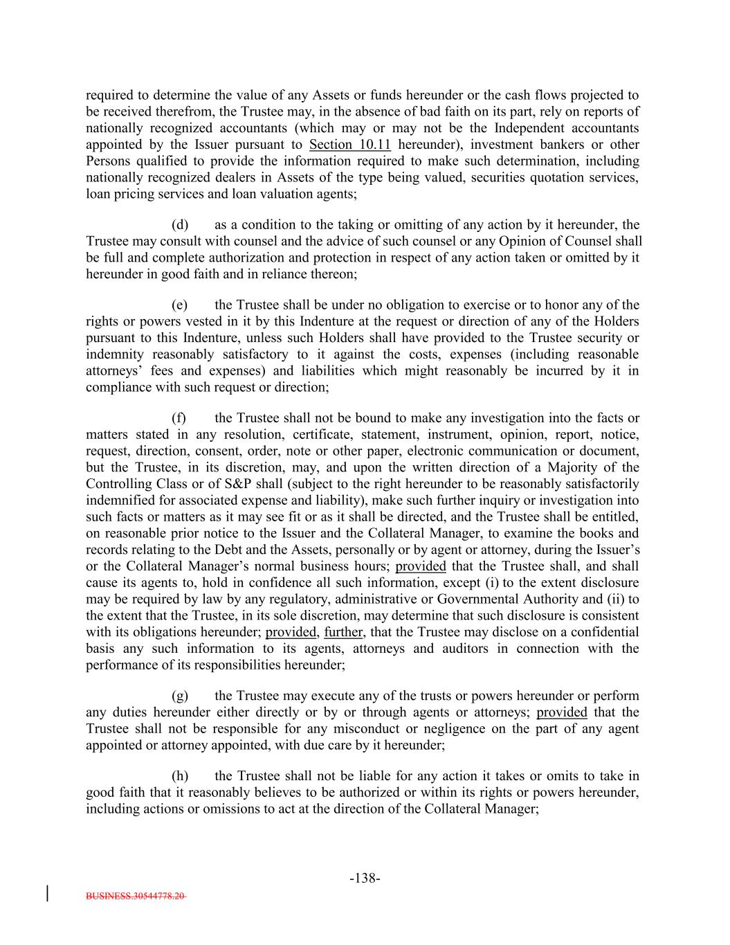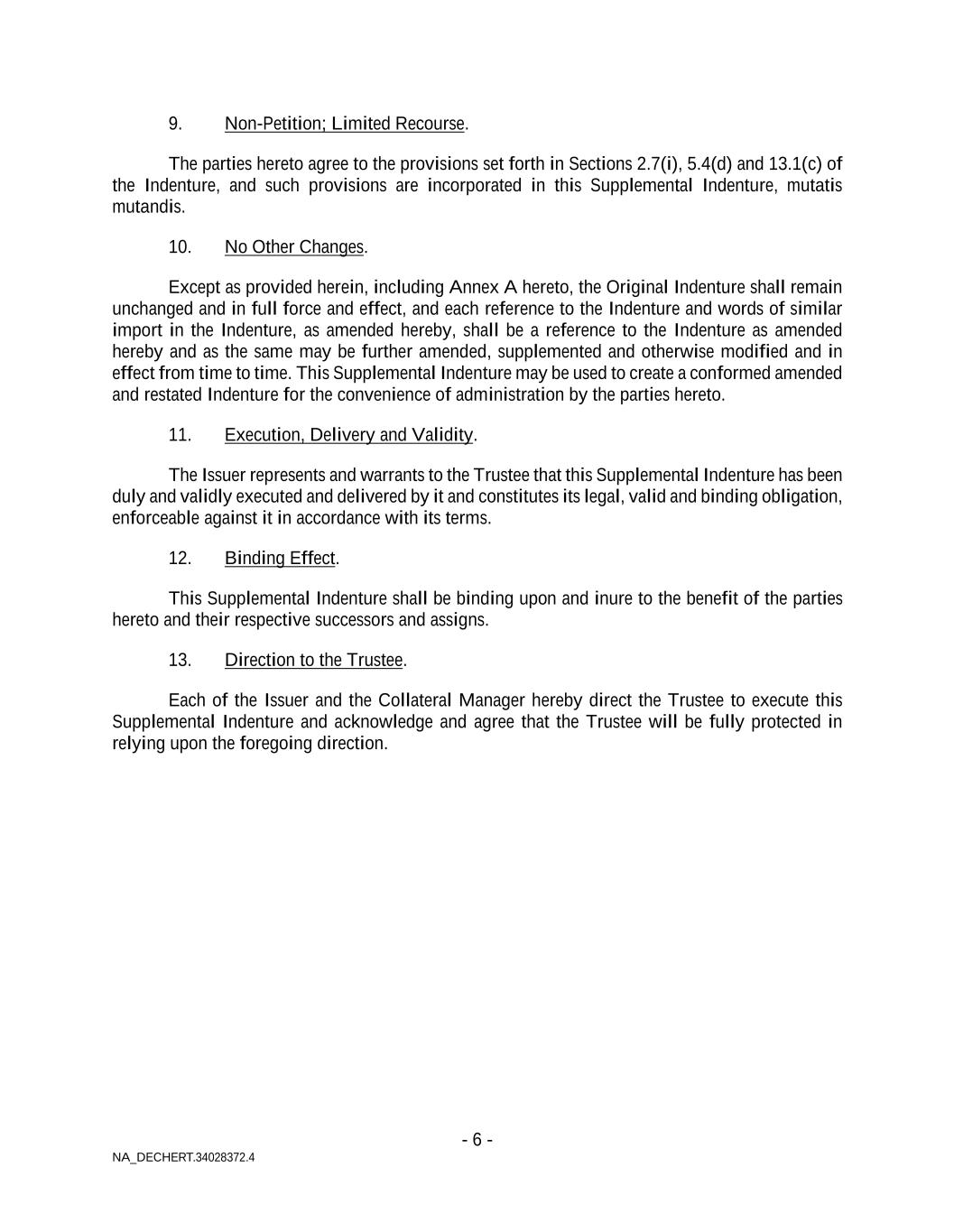 - 6 - NA_DECHERT.34028372.4 9. Non-Petition; Limited Recourse. The parties hereto agree to the provisions set forth in Sections 2.7(i), 5.4(d) and 13.1(c) of the Indenture, and such provisions are incorporated in this Supplemental Indenture, mutatis mutandis. 10. No Other Changes. Except as provided herein, including Annex A hereto, the Original Indenture shall remain unchanged and in full force and effect, and each reference to the Indenture and words of similar import in the Indenture, as amended hereby, shall be a reference to the Indenture as amended hereby and as the same may be further amended, supplemented and otherwise modified and in effect from time to time. This Supplemental Indenture may be used to create a conformed amended and restated Indenture for the convenience of administration by the parties hereto. 11. Execution, Delivery and Validity. The Issuer represents and warrants to the Trustee that this Supplemental Indenture has been duly and validly executed and delivered by it and constitutes its legal, valid and binding obligation, enforceable against it in accordance with its terms. 12. Binding Effect. This Supplemental Indenture shall be binding upon and inure to the benefit of the parties hereto and their respective successors and assigns. 13. Direction to the Trustee. Each of the Issuer and the Collateral Manager hereby direct the Trustee to execute this Supplemental Indenture and acknowledge and agree that the Trustee will be fully protected in relying upon the foregoing direction.