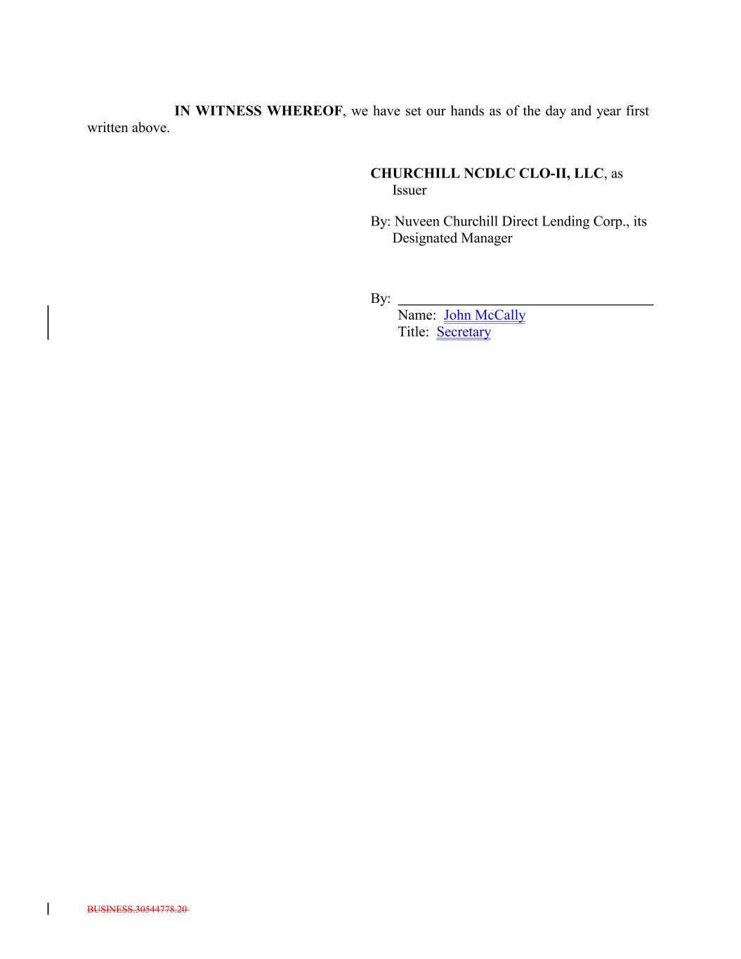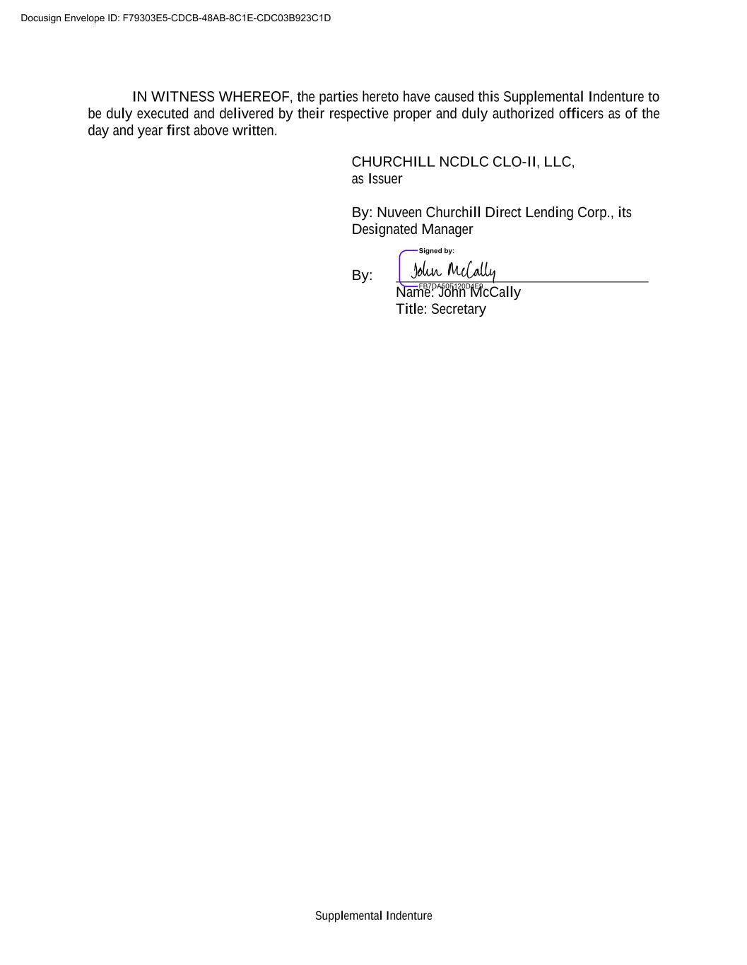 Supplemental Indenture IN WITNESS WHEREOF, the parties hereto have caused this Supplemental Indenture to be duly executed and delivered by their respective proper and duly authorized officers as of the day and year first above written. CHURCHILL NCDLC CLO-II, LLC, as Issuer By: Nuveen Churchill Direct Lending Corp., its Designated Manager By: Name: John McCally Title: Secretary Docusign Envelope ID: F79303E5-CDCB-48AB-8C1E-CDC03B923C1D