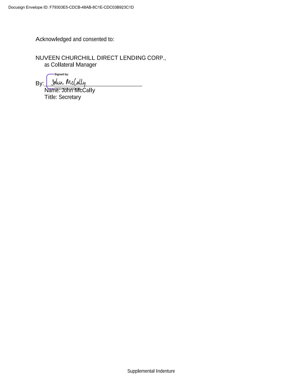 Supplemental Indenture Acknowledged and consented to: NUVEEN CHURCHILL DIRECT LENDING CORP., as Collateral Manager By: Name: John McCally Title: Secretary Docusign Envelope ID: F79303E5-CDCB-48AB-8C1E-CDC03B923C1D