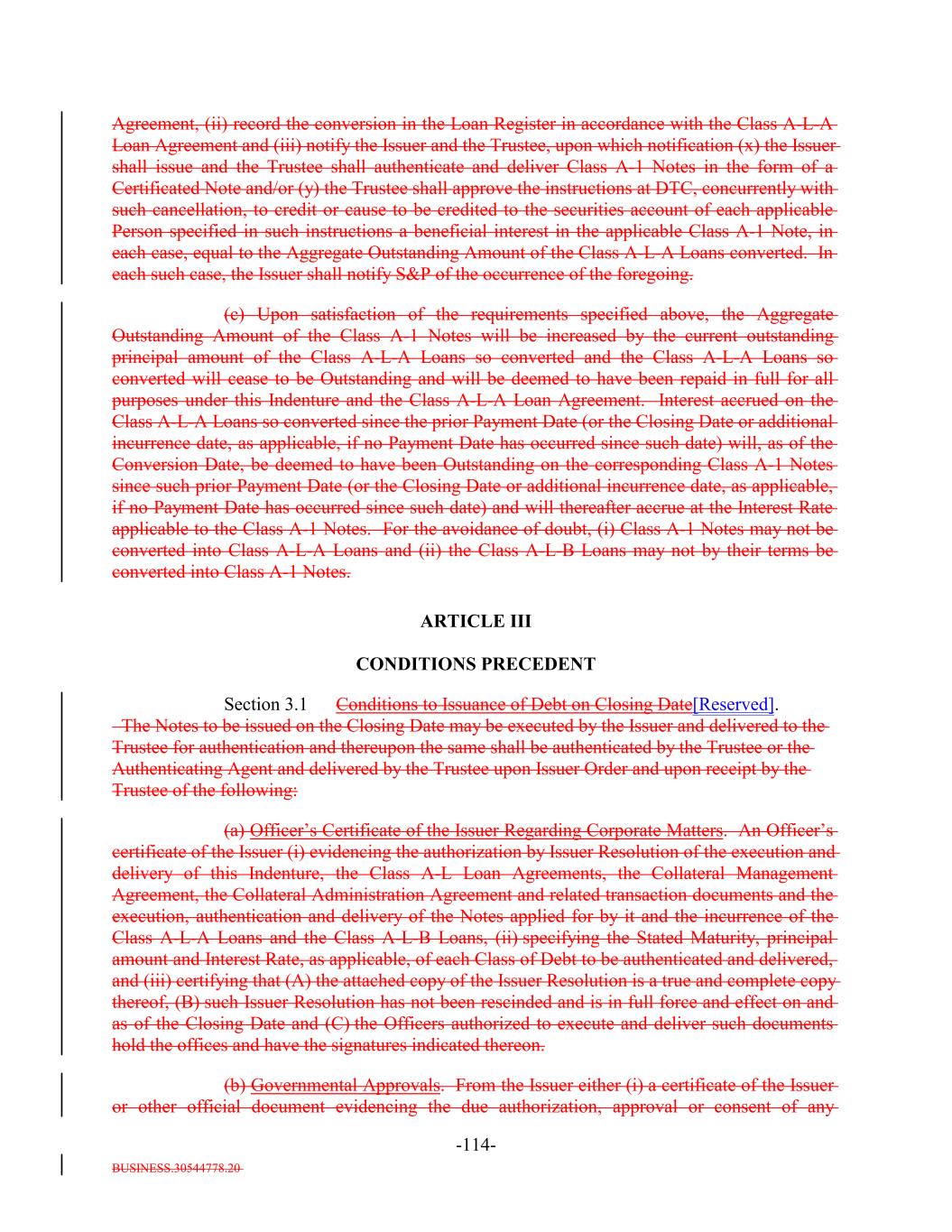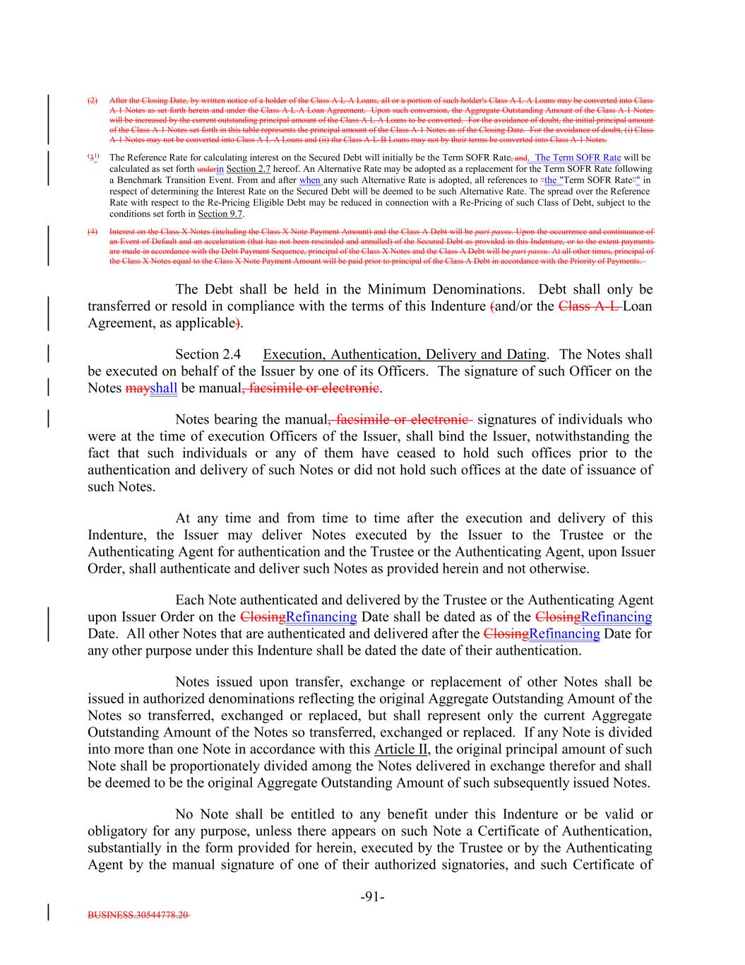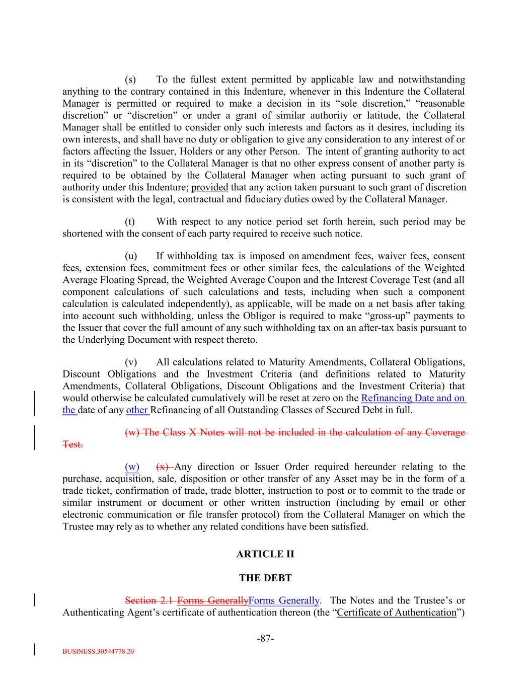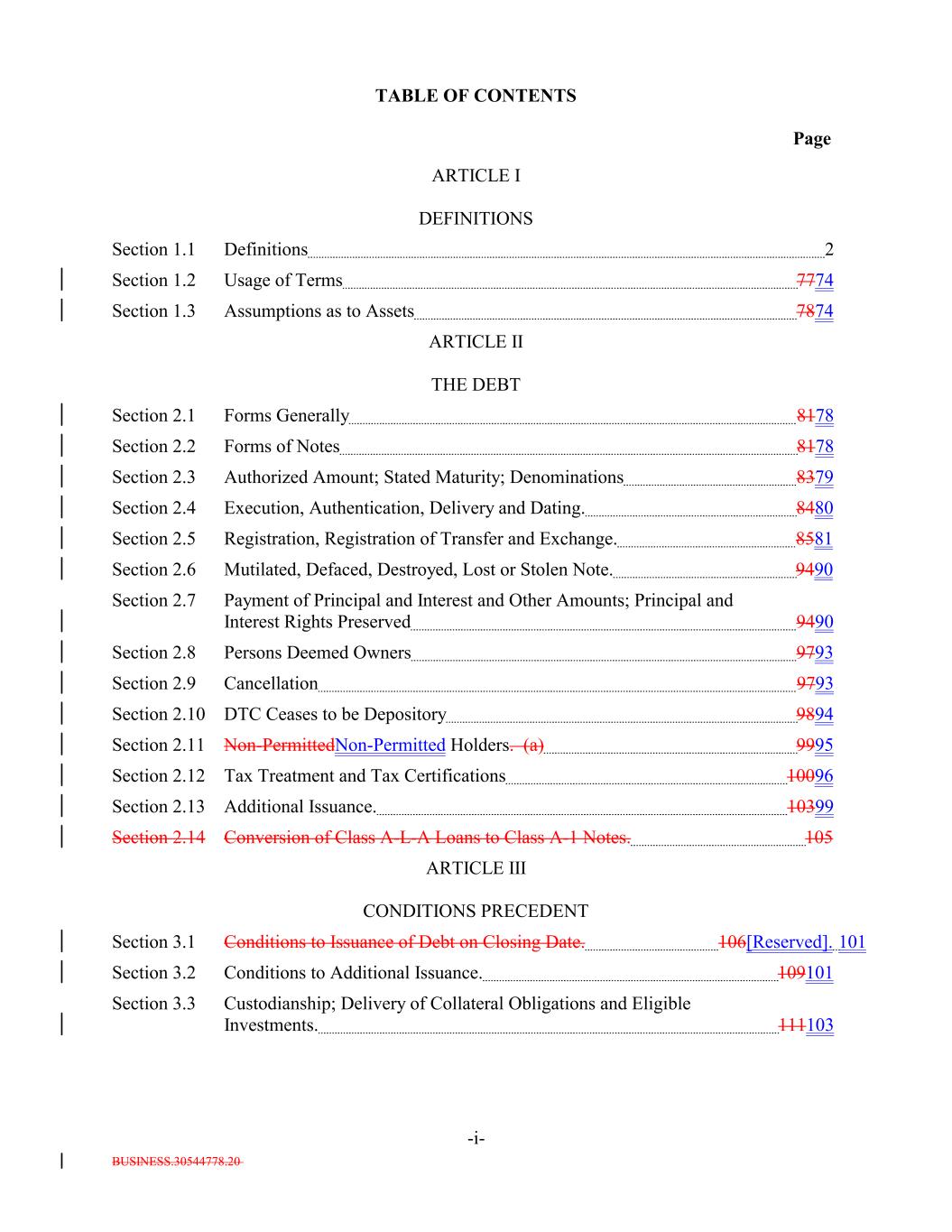 BUSINESS.30544778.20 TABLE OF CONTENTS Page -i- ARTICLE I DEFINITIONS Section 1.1 Definitions 2 Section 1.2 Usage of Terms 7774 Section 1.3 Assumptions as to Assets 7874 ARTICLE II THE DEBT Section 2.1 Forms Generally 8178 Section 2.2 Forms of Notes 8178 Section 2.3 Authorized Amount; Stated Maturity; Denominations 8379 Section 2.4 Execution, Authentication, Delivery and Dating. 8480 Section 2.5 Registration, Registration of Transfer and Exchange. 8581 Section 2.6 Mutilated, Defaced, Destroyed, Lost or Stolen Note. 9490 Section 2.7 Payment of Principal and Interest and Other Amounts; Principal and Interest Rights Preserved 9490 Section 2.8 Persons Deemed Owners 9793 Section 2.9 Cancellation 9793 Section 2.10 DTC Ceases to be Depository 9894 Section 2.11 Non-PermittedNon-Permitted Holders. (a) 9995 Section 2.12 Tax Treatment and Tax Certifications 10096 Section 2.13 Additional Issuance. 10399 Section 2.14 Conversion of Class A-L-A Loans to Class A-1 Notes. 105 ARTICLE III CONDITIONS PRECEDENT Section 3.1 Conditions to Issuance of Debt on Closing Date. 106[Reserved]. 101 Section 3.2 Conditions to Additional Issuance. 109101 Section 3.3 Custodianship; Delivery of Collateral Obligations and Eligible Investments. 111103
