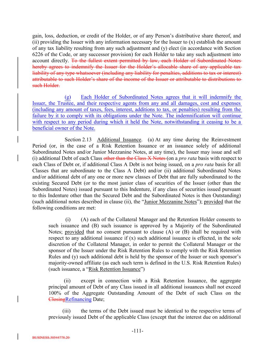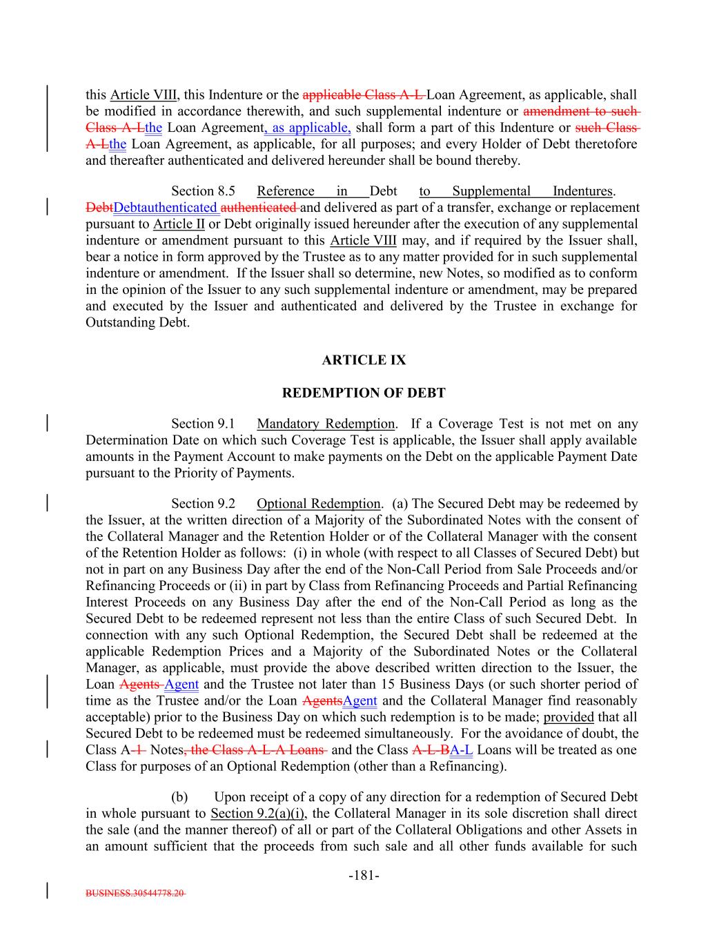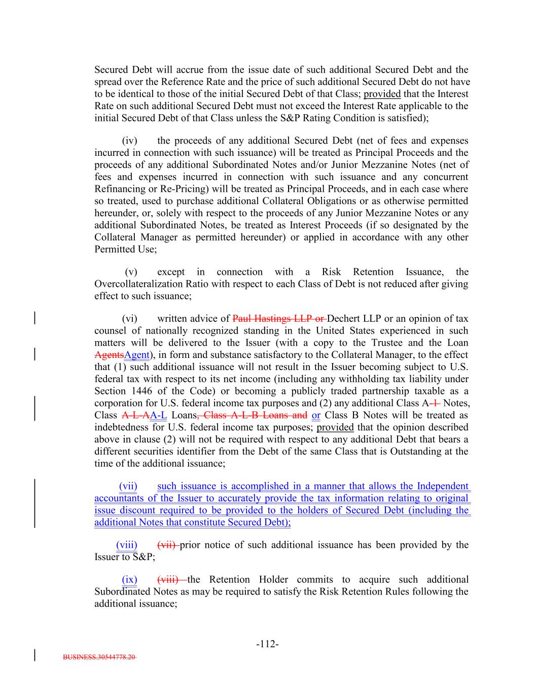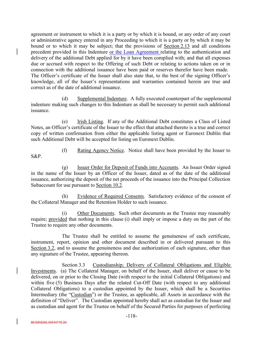 BUSINESS.30544778.20 TABLE OF CONTENTS Page -i- ARTICLE I DEFINITIONS Section 1.1 Definitions 2 Section 1.2 Usage of Terms 7774 Section 1.3 Assumptions as to Assets 7874 ARTICLE II THE DEBT Section 2.1 Forms Generally 8178 Section 2.2 Forms of Notes 8178 Section 2.3 Authorized Amount; Stated Maturity; Denominations 8379 Section 2.4 Execution, Authentication, Delivery and Dating. 8480 Section 2.5 Registration, Registration of Transfer and Exchange. 8581 Section 2.6 Mutilated, Defaced, Destroyed, Lost or Stolen Note. 9490 Section 2.7 Payment of Principal and Interest and Other Amounts; Principal and Interest Rights Preserved 9490 Section 2.8 Persons Deemed Owners 9793 Section 2.9 Cancellation 9793 Section 2.10 DTC Ceases to be Depository 9894 Section 2.11 Non-PermittedNon-Permitted Holders. (a) 9995 Section 2.12 Tax Treatment and Tax Certifications 10096 Section 2.13 Additional Issuance. 10399 Section 2.14 Conversion of Class A-L-A Loans to Class A-1 Notes. 105 ARTICLE III CONDITIONS PRECEDENT Section 3.1 Conditions to Issuance of Debt on Closing Date. 106[Reserved]. 101 Section 3.2 Conditions to Additional Issuance. 109101 Section 3.3 Custodianship; Delivery of Collateral Obligations and Eligible Investments. 111103