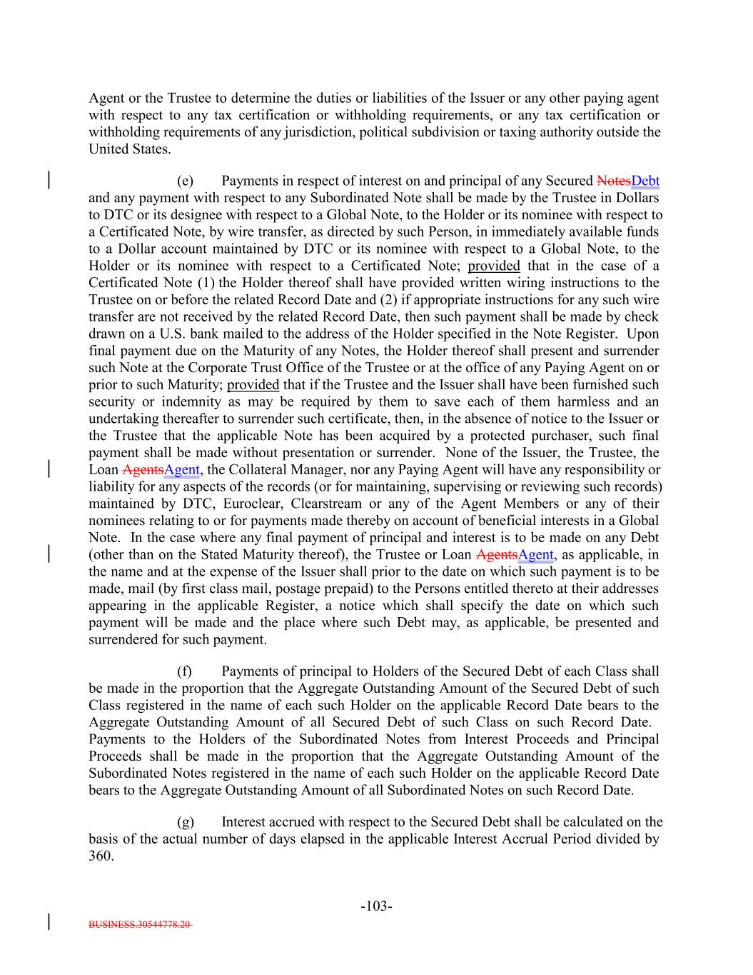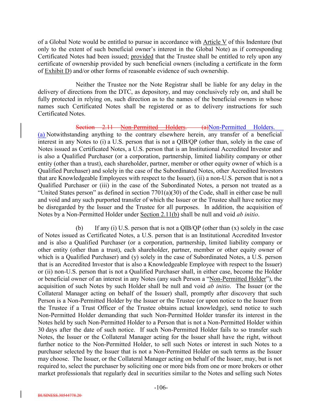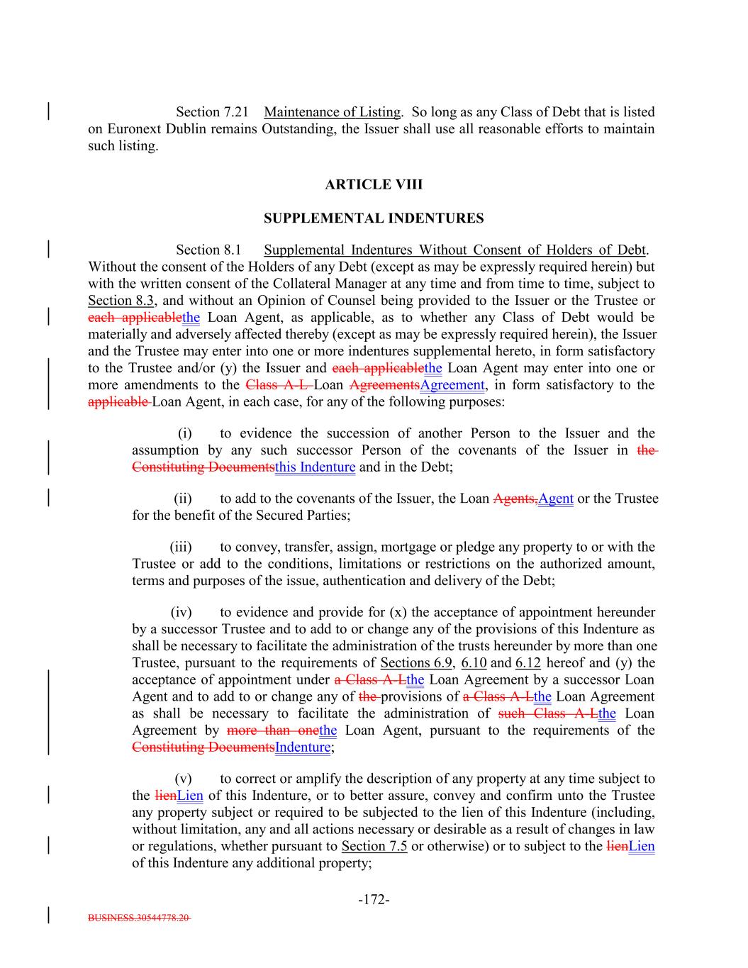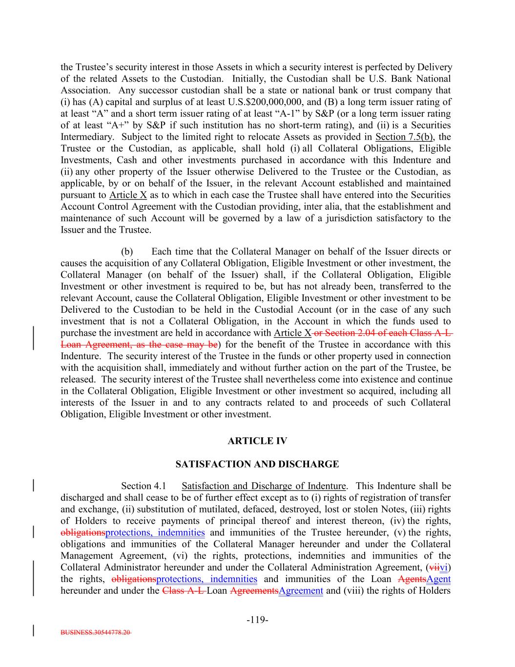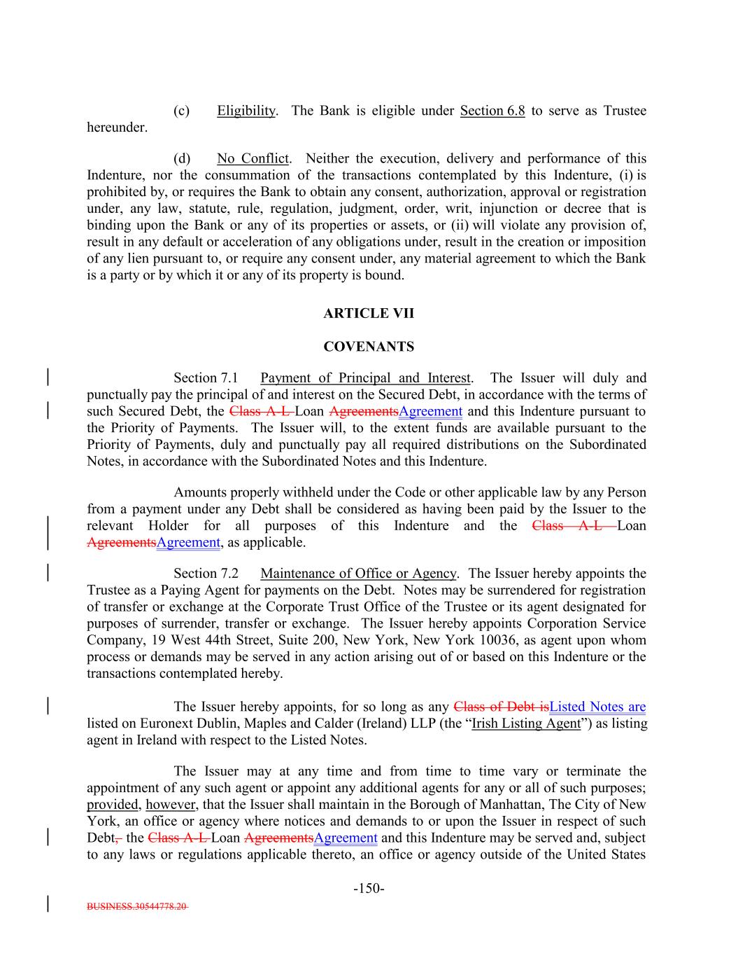 BUSINESS.30544778.20 TABLE OF CONTENTS Page -i- ARTICLE I DEFINITIONS Section 1.1 Definitions 2 Section 1.2 Usage of Terms 7774 Section 1.3 Assumptions as to Assets 7874 ARTICLE II THE DEBT Section 2.1 Forms Generally 8178 Section 2.2 Forms of Notes 8178 Section 2.3 Authorized Amount; Stated Maturity; Denominations 8379 Section 2.4 Execution, Authentication, Delivery and Dating. 8480 Section 2.5 Registration, Registration of Transfer and Exchange. 8581 Section 2.6 Mutilated, Defaced, Destroyed, Lost or Stolen Note. 9490 Section 2.7 Payment of Principal and Interest and Other Amounts; Principal and Interest Rights Preserved 9490 Section 2.8 Persons Deemed Owners 9793 Section 2.9 Cancellation 9793 Section 2.10 DTC Ceases to be Depository 9894 Section 2.11 Non-PermittedNon-Permitted Holders. (a) 9995 Section 2.12 Tax Treatment and Tax Certifications 10096 Section 2.13 Additional Issuance. 10399 Section 2.14 Conversion of Class A-L-A Loans to Class A-1 Notes. 105 ARTICLE III CONDITIONS PRECEDENT Section 3.1 Conditions to Issuance of Debt on Closing Date. 106[Reserved]. 101 Section 3.2 Conditions to Additional Issuance. 109101 Section 3.3 Custodianship; Delivery of Collateral Obligations and Eligible Investments. 111103