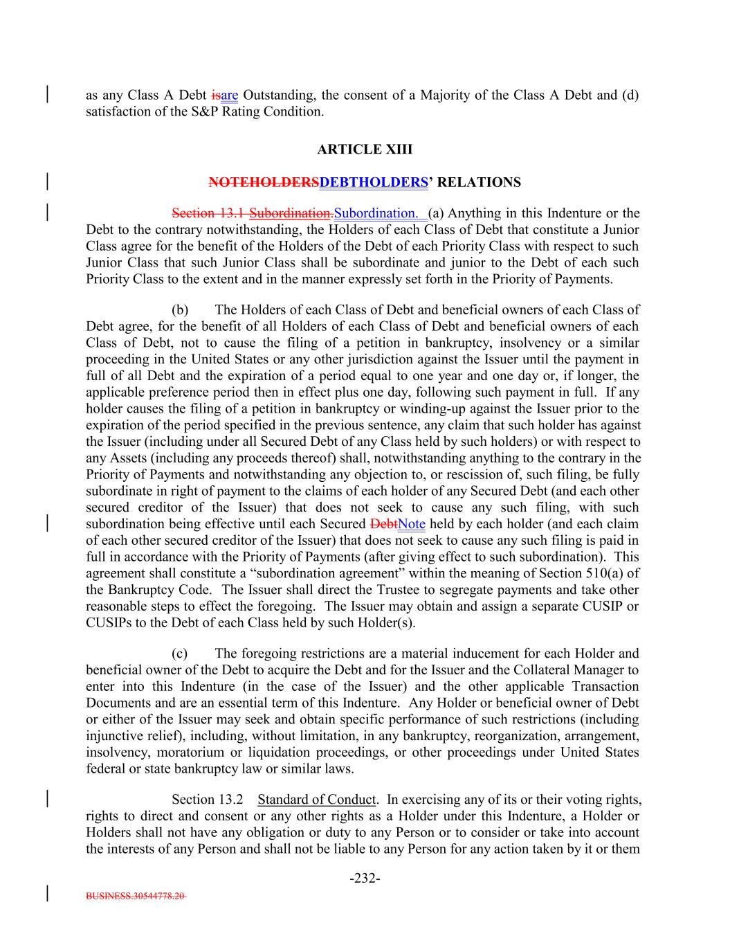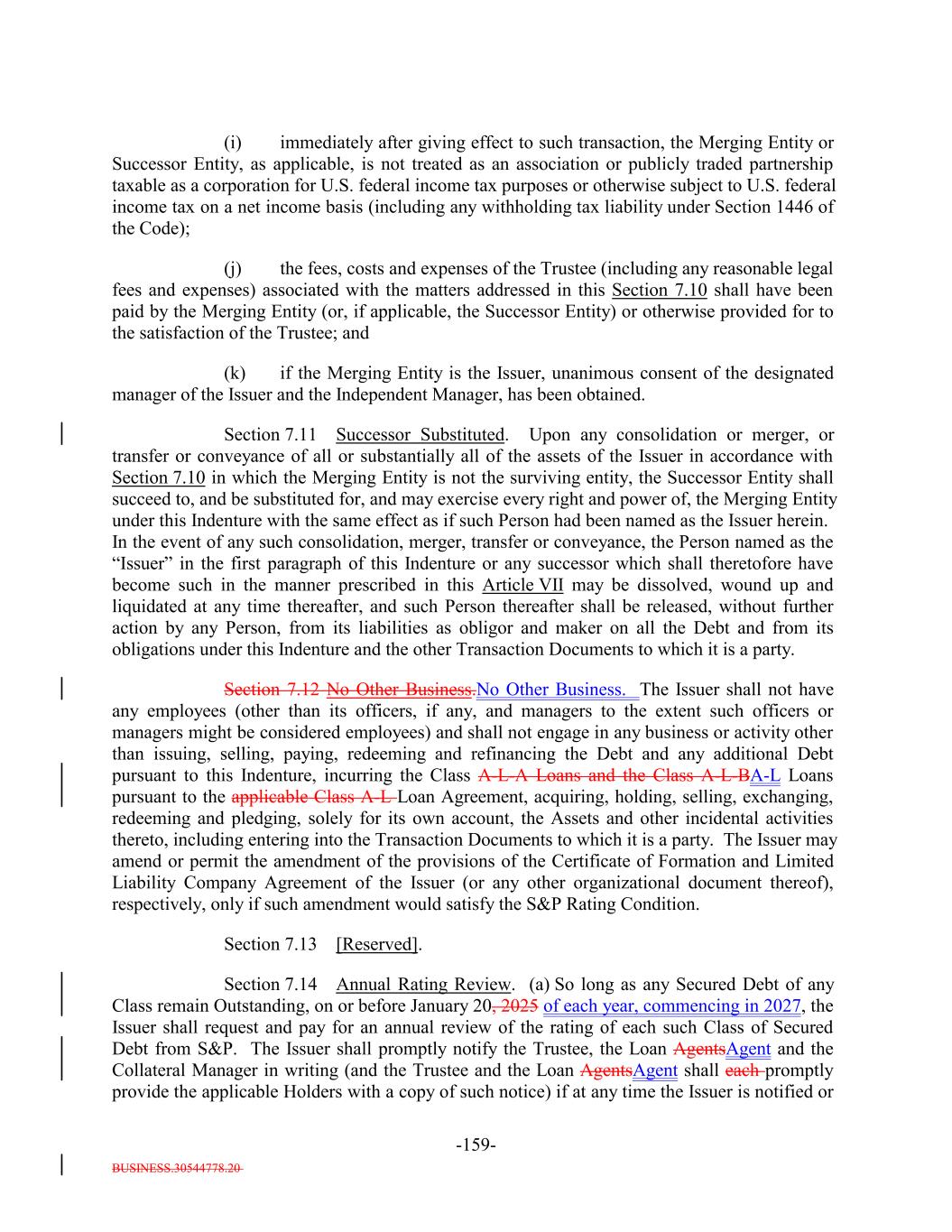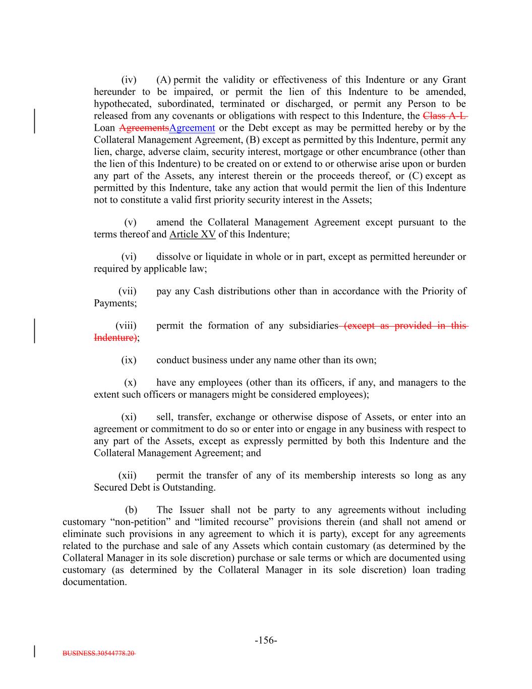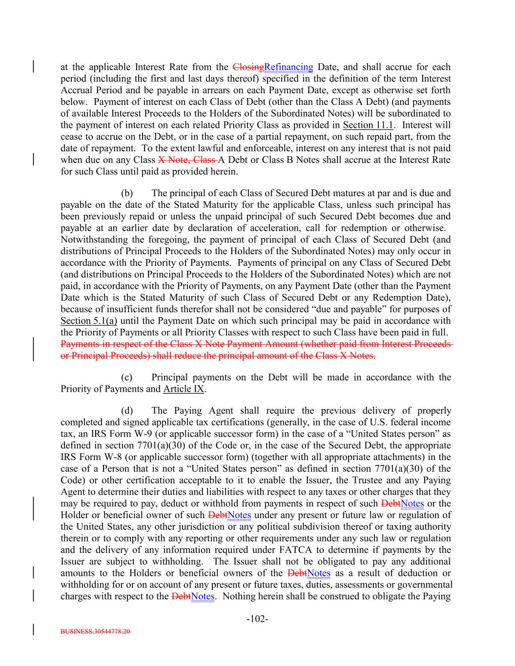 BUSINESS.30544778.20 TABLE OF CONTENTS Page -i- ARTICLE I DEFINITIONS Section 1.1 Definitions 2 Section 1.2 Usage of Terms 7774 Section 1.3 Assumptions as to Assets 7874 ARTICLE II THE DEBT Section 2.1 Forms Generally 8178 Section 2.2 Forms of Notes 8178 Section 2.3 Authorized Amount; Stated Maturity; Denominations 8379 Section 2.4 Execution, Authentication, Delivery and Dating. 8480 Section 2.5 Registration, Registration of Transfer and Exchange. 8581 Section 2.6 Mutilated, Defaced, Destroyed, Lost or Stolen Note. 9490 Section 2.7 Payment of Principal and Interest and Other Amounts; Principal and Interest Rights Preserved 9490 Section 2.8 Persons Deemed Owners 9793 Section 2.9 Cancellation 9793 Section 2.10 DTC Ceases to be Depository 9894 Section 2.11 Non-PermittedNon-Permitted Holders. (a) 9995 Section 2.12 Tax Treatment and Tax Certifications 10096 Section 2.13 Additional Issuance. 10399 Section 2.14 Conversion of Class A-L-A Loans to Class A-1 Notes. 105 ARTICLE III CONDITIONS PRECEDENT Section 3.1 Conditions to Issuance of Debt on Closing Date. 106[Reserved]. 101 Section 3.2 Conditions to Additional Issuance. 109101 Section 3.3 Custodianship; Delivery of Collateral Obligations and Eligible Investments. 111103