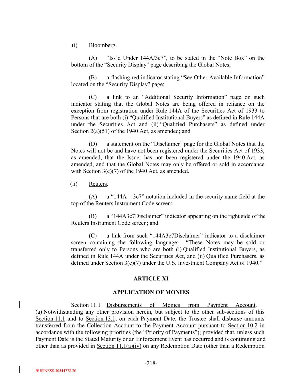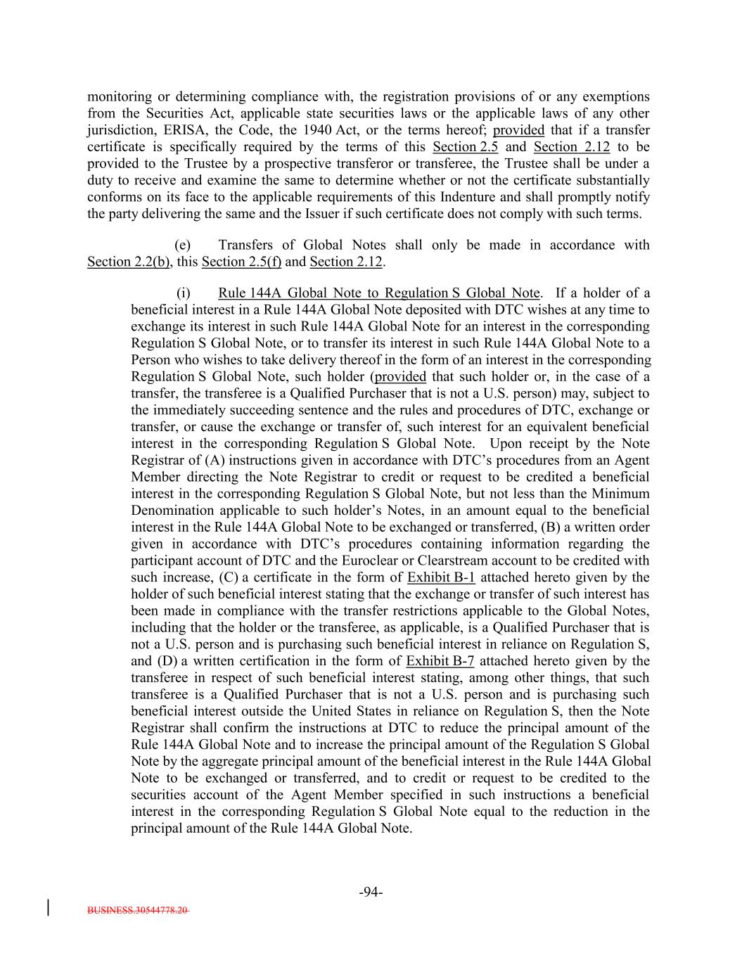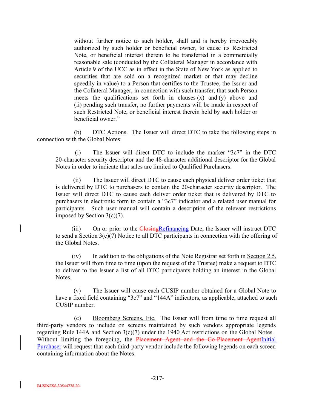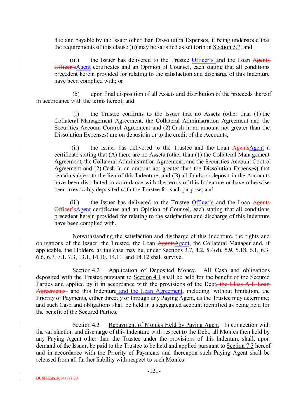 BUSINESS.30544778.20 TABLE OF CONTENTS Page -i- ARTICLE I DEFINITIONS Section 1.1 Definitions 2 Section 1.2 Usage of Terms 7774 Section 1.3 Assumptions as to Assets 7874 ARTICLE II THE DEBT Section 2.1 Forms Generally 8178 Section 2.2 Forms of Notes 8178 Section 2.3 Authorized Amount; Stated Maturity; Denominations 8379 Section 2.4 Execution, Authentication, Delivery and Dating. 8480 Section 2.5 Registration, Registration of Transfer and Exchange. 8581 Section 2.6 Mutilated, Defaced, Destroyed, Lost or Stolen Note. 9490 Section 2.7 Payment of Principal and Interest and Other Amounts; Principal and Interest Rights Preserved 9490 Section 2.8 Persons Deemed Owners 9793 Section 2.9 Cancellation 9793 Section 2.10 DTC Ceases to be Depository 9894 Section 2.11 Non-PermittedNon-Permitted Holders. (a) 9995 Section 2.12 Tax Treatment and Tax Certifications 10096 Section 2.13 Additional Issuance. 10399 Section 2.14 Conversion of Class A-L-A Loans to Class A-1 Notes. 105 ARTICLE III CONDITIONS PRECEDENT Section 3.1 Conditions to Issuance of Debt on Closing Date. 106[Reserved]. 101 Section 3.2 Conditions to Additional Issuance. 109101 Section 3.3 Custodianship; Delivery of Collateral Obligations and Eligible Investments. 111103