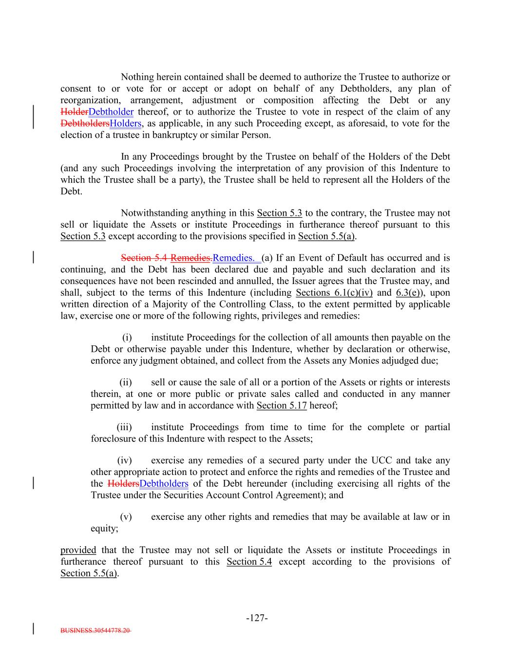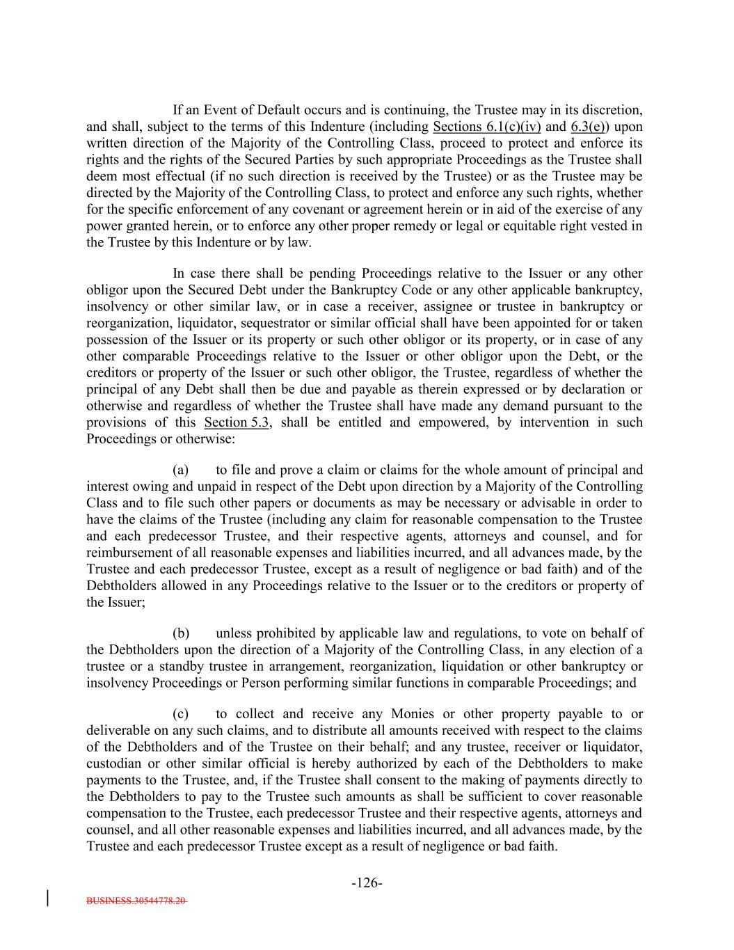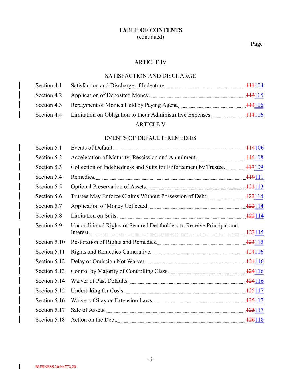 BUSINESS.30544778.20 TABLE OF CONTENTS (continued) Page -ii- ARTICLE IV SATISFACTION AND DISCHARGE Section 4.1 Satisfaction and Discharge of Indenture. 111104 Section 4.2 Application of Deposited Money. 113105 Section 4.3 Repayment of Monies Held by Paying Agent. 113106 Section 4.4 Limitation on Obligation to Incur Administrative Expenses. 114106 ARTICLE V EVENTS OF DEFAULT; REMEDIES Section 5.1 Events of Default. 114106 Section 5.2 Acceleration of Maturity; Rescission and Annulment. 116108 Section 5.3 Collection of Indebtedness and Suits for Enforcement by Trustee. 117109 Section 5.4 Remedies. 119111 Section 5.5 Optional Preservation of Assets. 121113 Section 5.6 Trustee May Enforce Claims Without Possession of Debt. 122114 Section 5.7 Application of Money Collected. 122114 Section 5.8 Limitation on Suits. 122114 Section 5.9 Unconditional Rights of Secured Debtholders to Receive Principal and Interest. 123115 Section 5.10 Restoration of Rights and Remedies. 123115 Section 5.11 Rights and Remedies Cumulative. 124116 Section 5.12 Delay or Omission Not Waiver. 124116 Section 5.13 Control by Majority of Controlling Class. 124116 Section 5.14 Waiver of Past Defaults. 124116 Section 5.15 Undertaking for Costs. 125117 Section 5.16 Waiver of Stay or Extension Laws. 125117 Section 5.17 Sale of Assets. 125117 Section 5.18 Action on the Debt. 126118