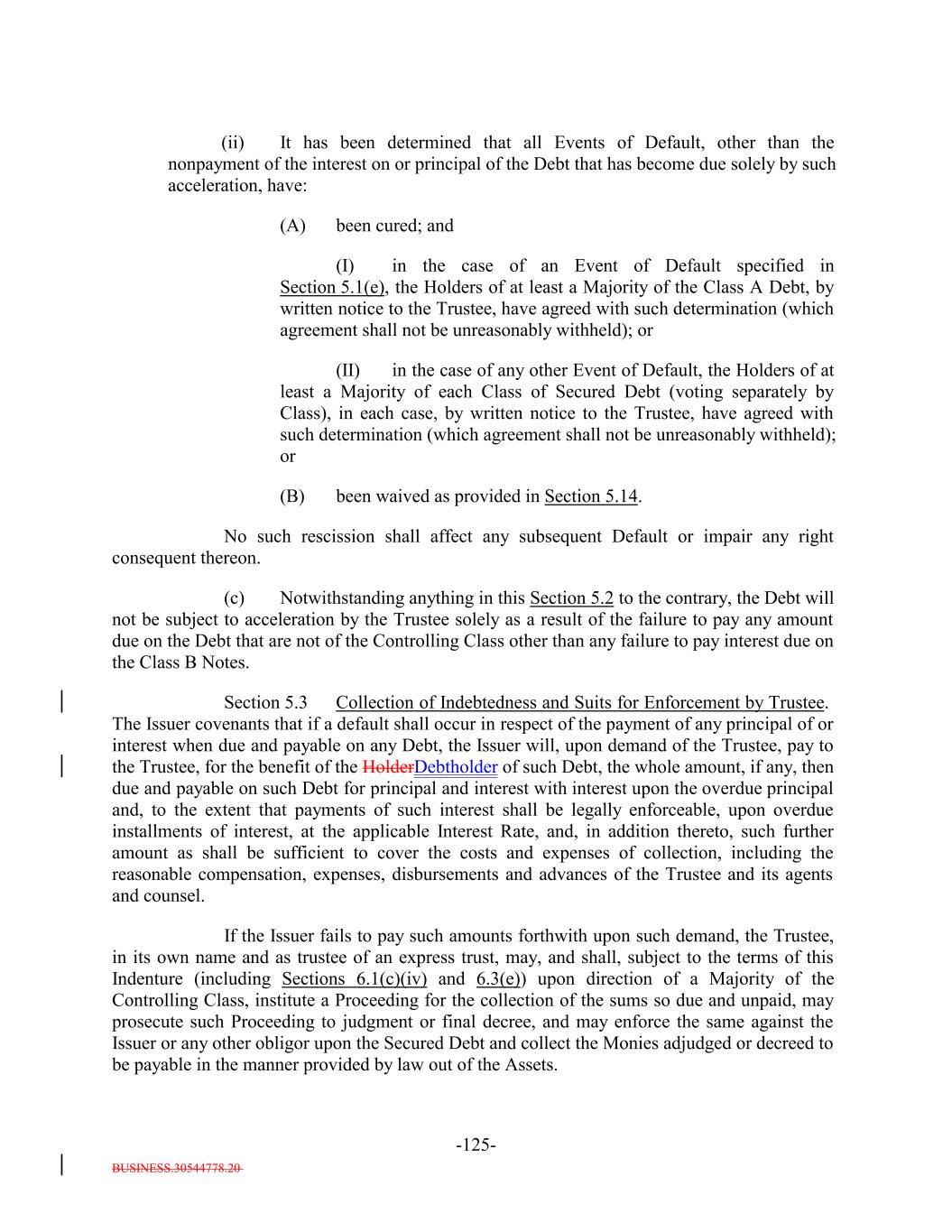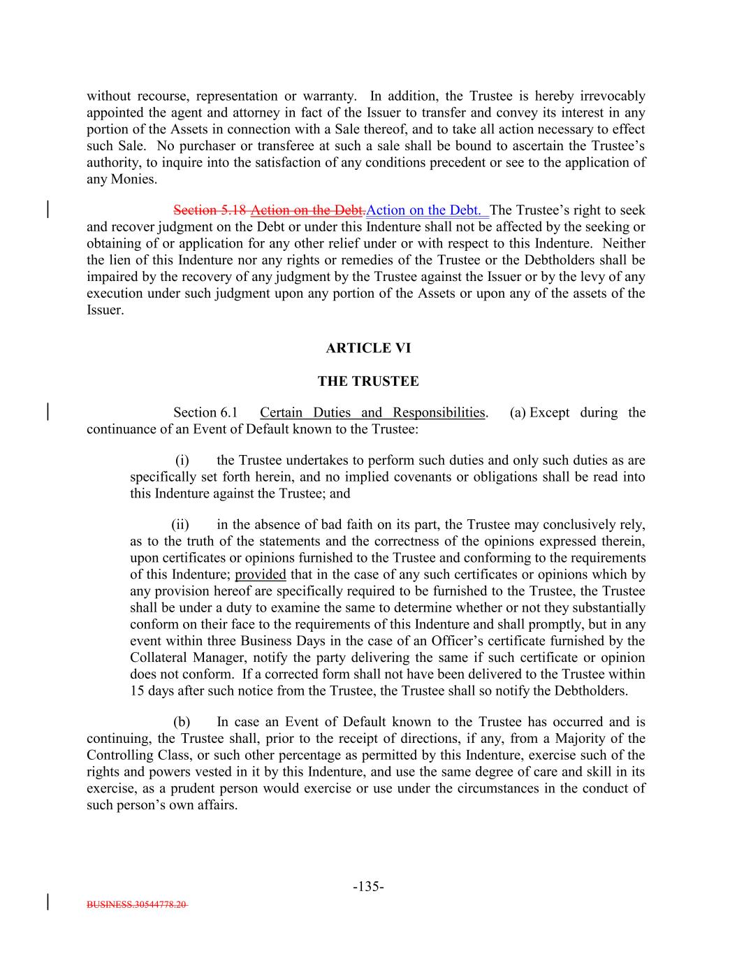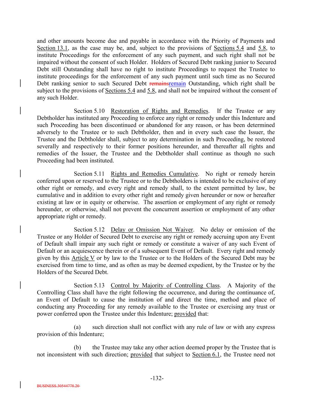BUSINESS.30544778.20 TABLE OF CONTENTS (continued) Page -ii- ARTICLE IV SATISFACTION AND DISCHARGE Section 4.1 Satisfaction and Discharge of Indenture. 111104 Section 4.2 Application of Deposited Money. 113105 Section 4.3 Repayment of Monies Held by Paying Agent. 113106 Section 4.4 Limitation on Obligation to Incur Administrative Expenses. 114106 ARTICLE V EVENTS OF DEFAULT; REMEDIES Section 5.1 Events of Default. 114106 Section 5.2 Acceleration of Maturity; Rescission and Annulment. 116108 Section 5.3 Collection of Indebtedness and Suits for Enforcement by Trustee. 117109 Section 5.4 Remedies. 119111 Section 5.5 Optional Preservation of Assets. 121113 Section 5.6 Trustee May Enforce Claims Without Possession of Debt. 122114 Section 5.7 Application of Money Collected. 122114 Section 5.8 Limitation on Suits. 122114 Section 5.9 Unconditional Rights of Secured Debtholders to Receive Principal and Interest. 123115 Section 5.10 Restoration of Rights and Remedies. 123115 Section 5.11 Rights and Remedies Cumulative. 124116 Section 5.12 Delay or Omission Not Waiver. 124116 Section 5.13 Control by Majority of Controlling Class. 124116 Section 5.14 Waiver of Past Defaults. 124116 Section 5.15 Undertaking for Costs. 125117 Section 5.16 Waiver of Stay or Extension Laws. 125117 Section 5.17 Sale of Assets. 125117 Section 5.18 Action on the Debt. 126118