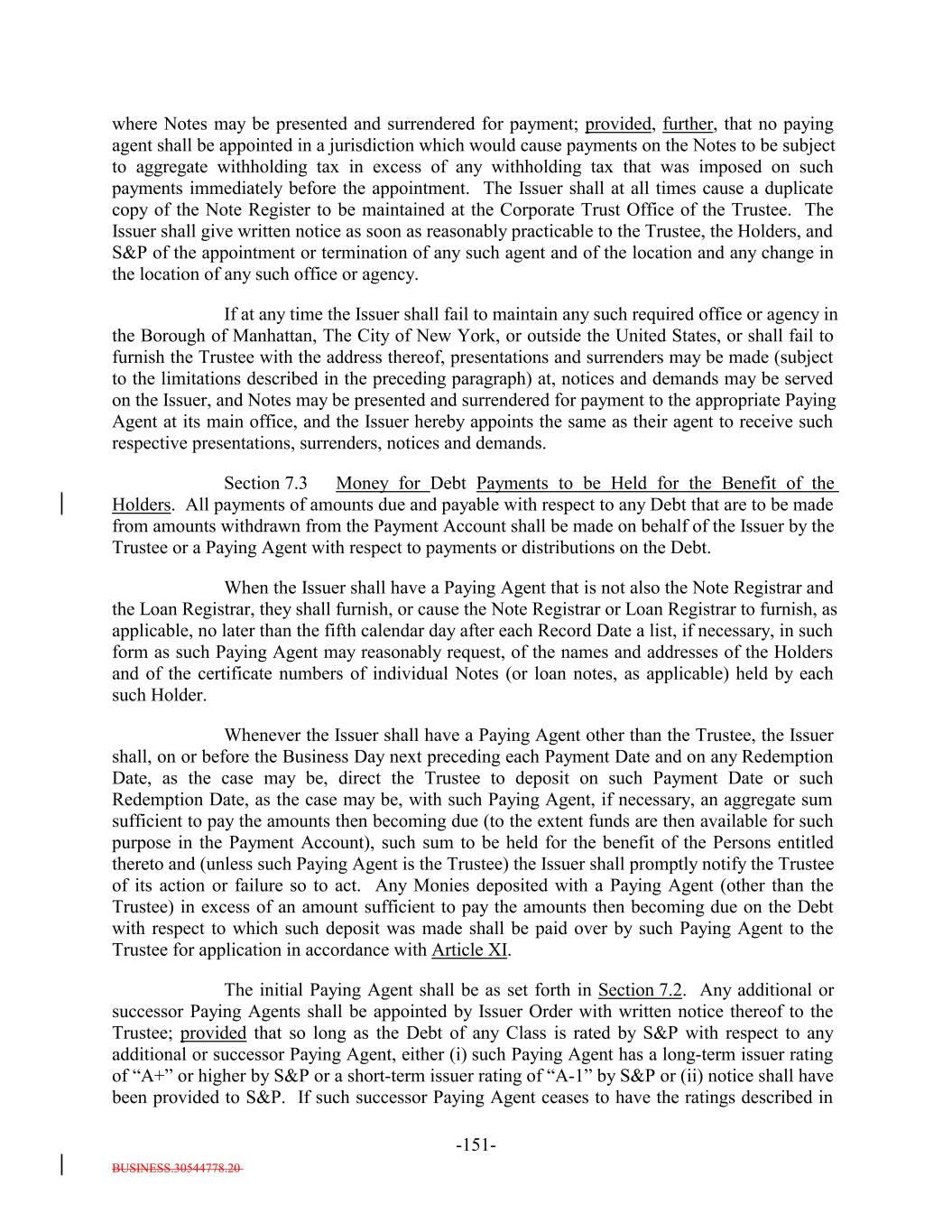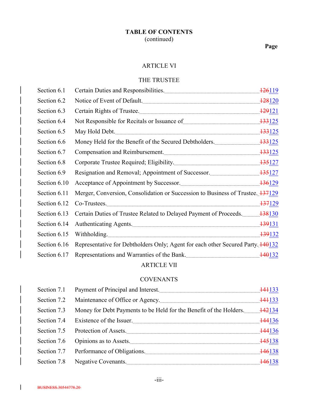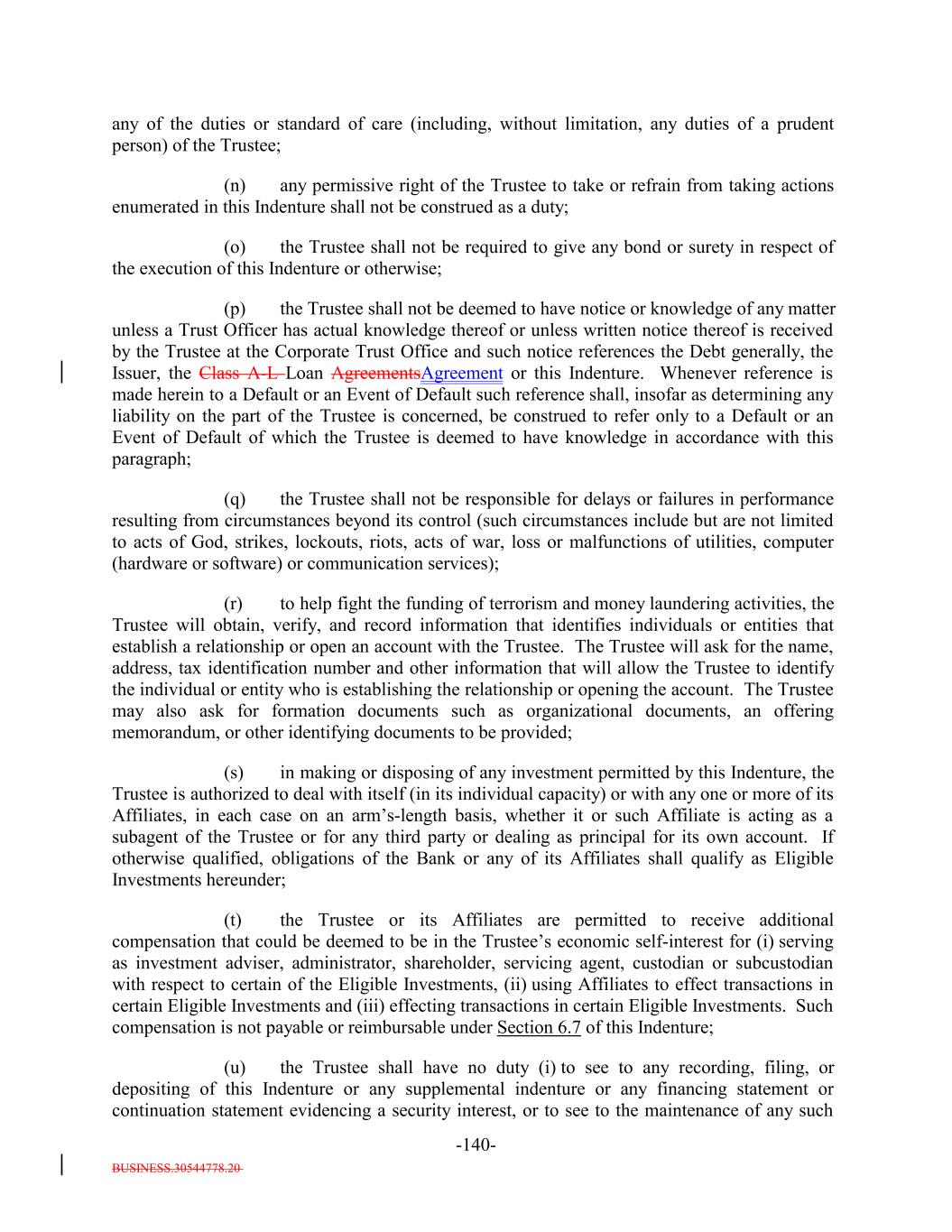 BUSINESS.30544778.20 TABLE OF CONTENTS (continued) Page -iii- ARTICLE VI THE TRUSTEE Section 6.1 Certain Duties and Responsibilities. 126119 Section 6.2 Notice of Event of Default. 128120 Section 6.3 Certain Rights of Trustee. 129121 Section 6.4 Not Responsible for Recitals or Issuance of 133125 Section 6.5 May Hold Debt. 133125 Section 6.6 Money Held for the Benefit of the Secured Debtholders. 133125 Section 6.7 Compensation and Reimbursement. 133125 Section 6.8 Corporate Trustee Required; Eligibility. 135127 Section 6.9 Resignation and Removal; Appointment of Successor. 135127 Section 6.10 Acceptance of Appointment by Successor. 136129 Section 6.11 Merger, Conversion, Consolidation or Succession to Business of Trustee. 137129 Section 6.12 Co-Trustees. 137129 Section 6.13 Certain Duties of Trustee Related to Delayed Payment of Proceeds. 138130 Section 6.14 Authenticating Agents. 139131 Section 6.15 Withholding. 139132 Section 6.16 Representative for Debtholders Only; Agent for each other Secured Party. 140132 Section 6.17 Representations and Warranties of the Bank. 140132 ARTICLE VII COVENANTS Section 7.1 Payment of Principal and Interest. 141133 Section 7.2 Maintenance of Office or Agency. 141133 Section 7.3 Money for Debt Payments to be Held for the Benefit of the Holders. 142134 Section 7.4 Existence of the Issuer. 144136 Section 7.5 Protection of Assets. 144136 Section 7.6 Opinions as to Assets. 145138 Section 7.7 Performance of Obligations. 146138 Section 7.8 Negative Covenants. 146138