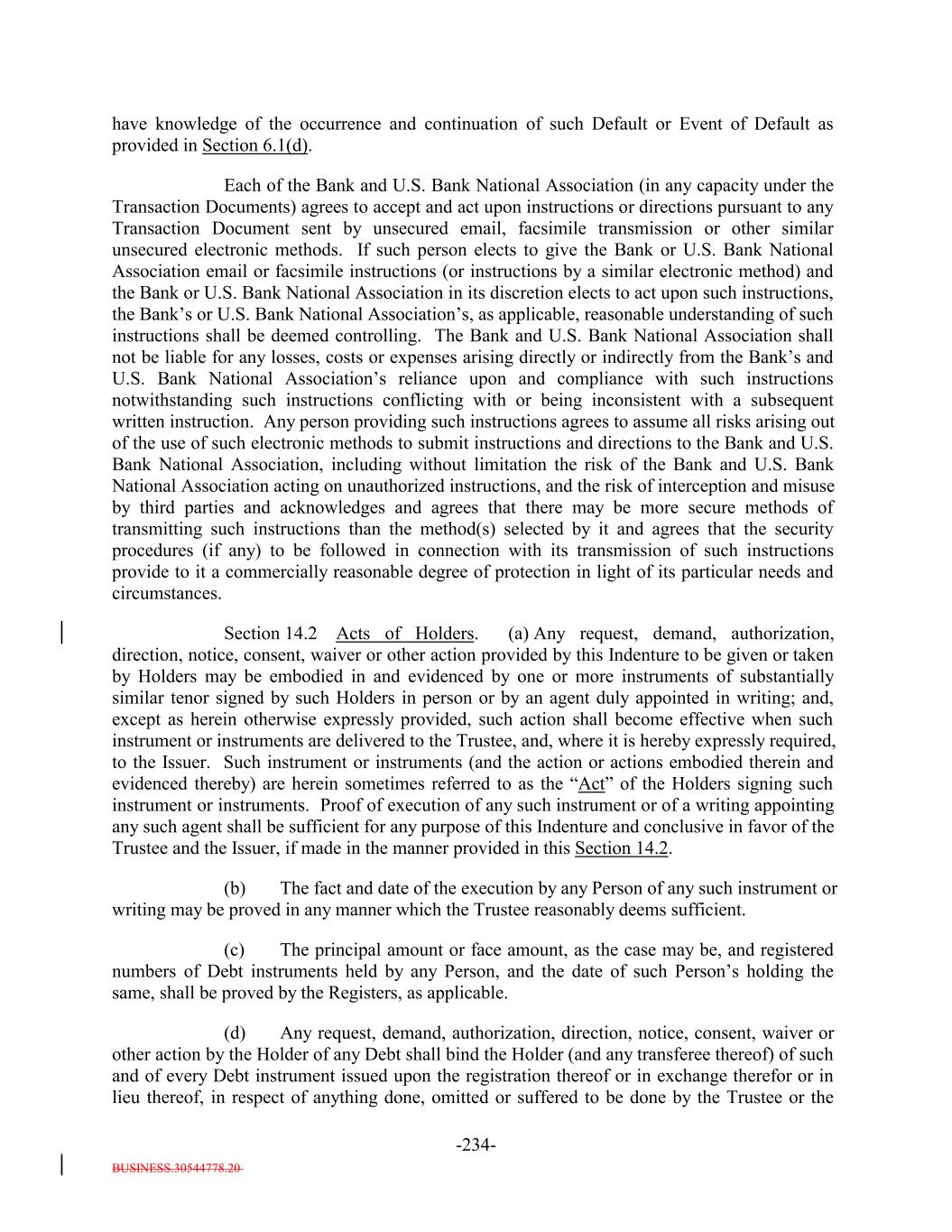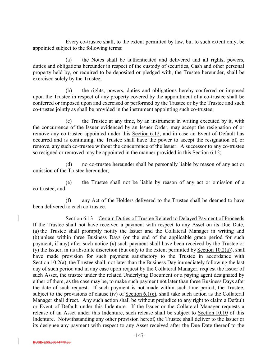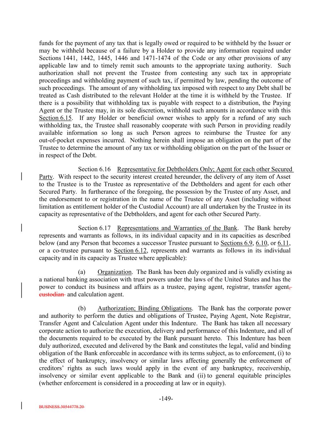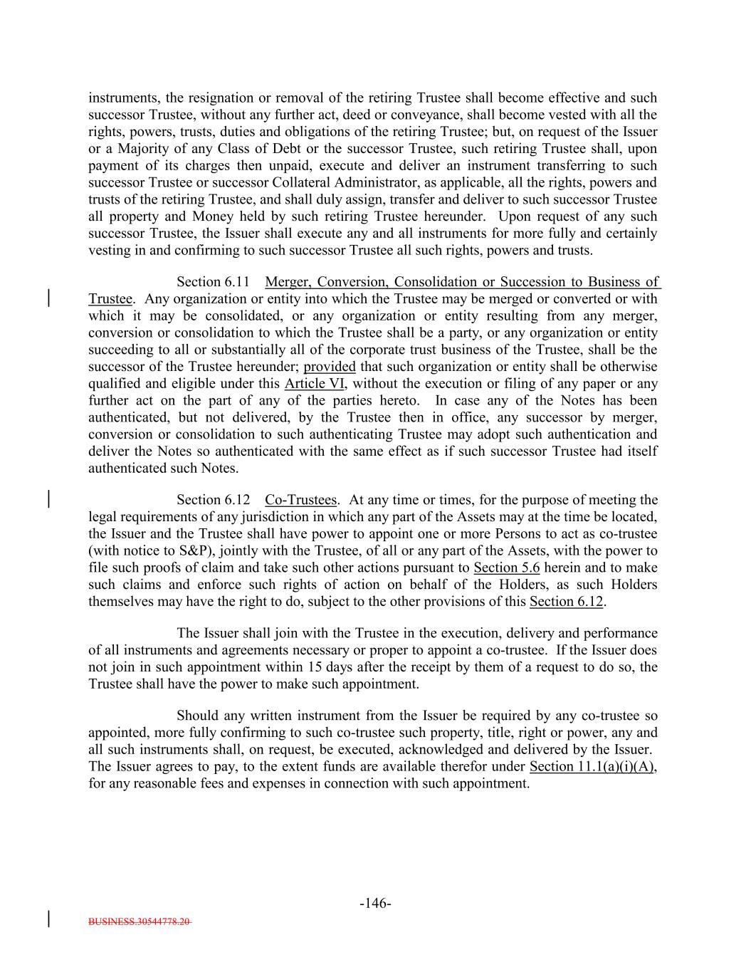 BUSINESS.30544778.20 TABLE OF CONTENTS (continued) Page -iii- ARTICLE VI THE TRUSTEE Section 6.1 Certain Duties and Responsibilities. 126119 Section 6.2 Notice of Event of Default. 128120 Section 6.3 Certain Rights of Trustee. 129121 Section 6.4 Not Responsible for Recitals or Issuance of 133125 Section 6.5 May Hold Debt. 133125 Section 6.6 Money Held for the Benefit of the Secured Debtholders. 133125 Section 6.7 Compensation and Reimbursement. 133125 Section 6.8 Corporate Trustee Required; Eligibility. 135127 Section 6.9 Resignation and Removal; Appointment of Successor. 135127 Section 6.10 Acceptance of Appointment by Successor. 136129 Section 6.11 Merger, Conversion, Consolidation or Succession to Business of Trustee. 137129 Section 6.12 Co-Trustees. 137129 Section 6.13 Certain Duties of Trustee Related to Delayed Payment of Proceeds. 138130 Section 6.14 Authenticating Agents. 139131 Section 6.15 Withholding. 139132 Section 6.16 Representative for Debtholders Only; Agent for each other Secured Party. 140132 Section 6.17 Representations and Warranties of the Bank. 140132 ARTICLE VII COVENANTS Section 7.1 Payment of Principal and Interest. 141133 Section 7.2 Maintenance of Office or Agency. 141133 Section 7.3 Money for Debt Payments to be Held for the Benefit of the Holders. 142134 Section 7.4 Existence of the Issuer. 144136 Section 7.5 Protection of Assets. 144136 Section 7.6 Opinions as to Assets. 145138 Section 7.7 Performance of Obligations. 146138 Section 7.8 Negative Covenants. 146138