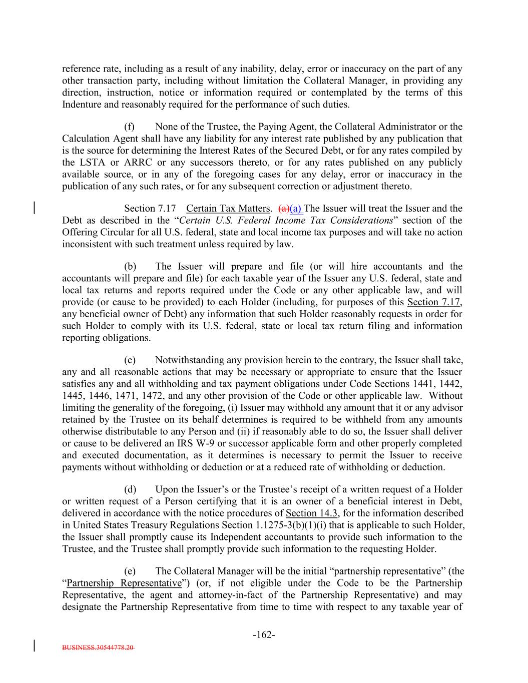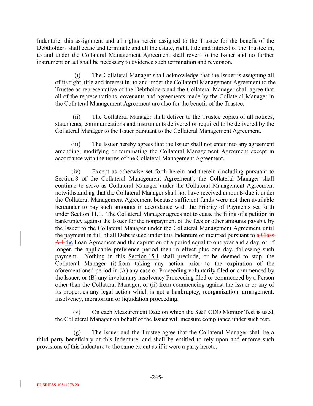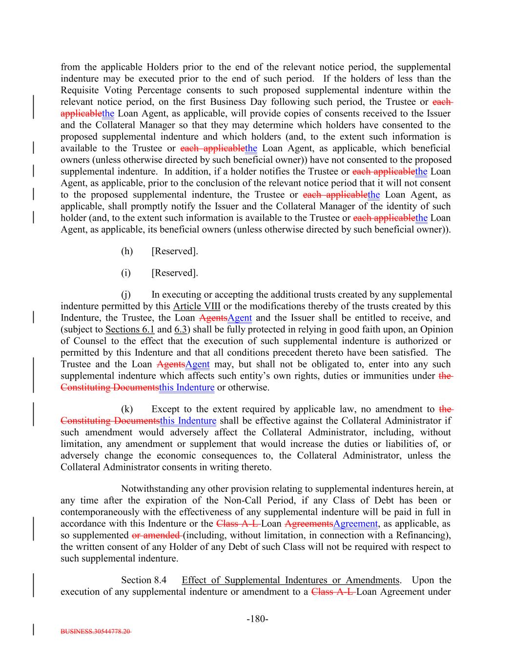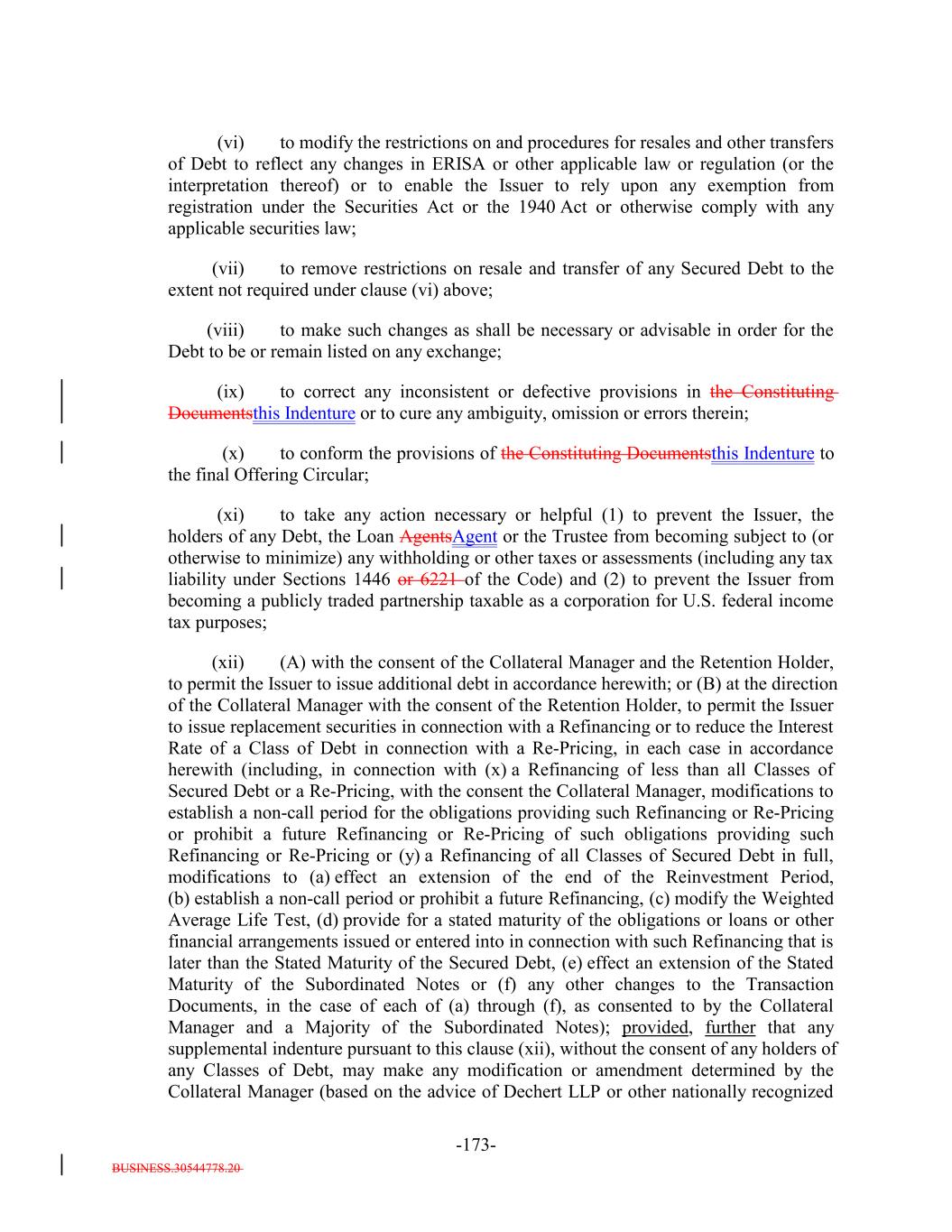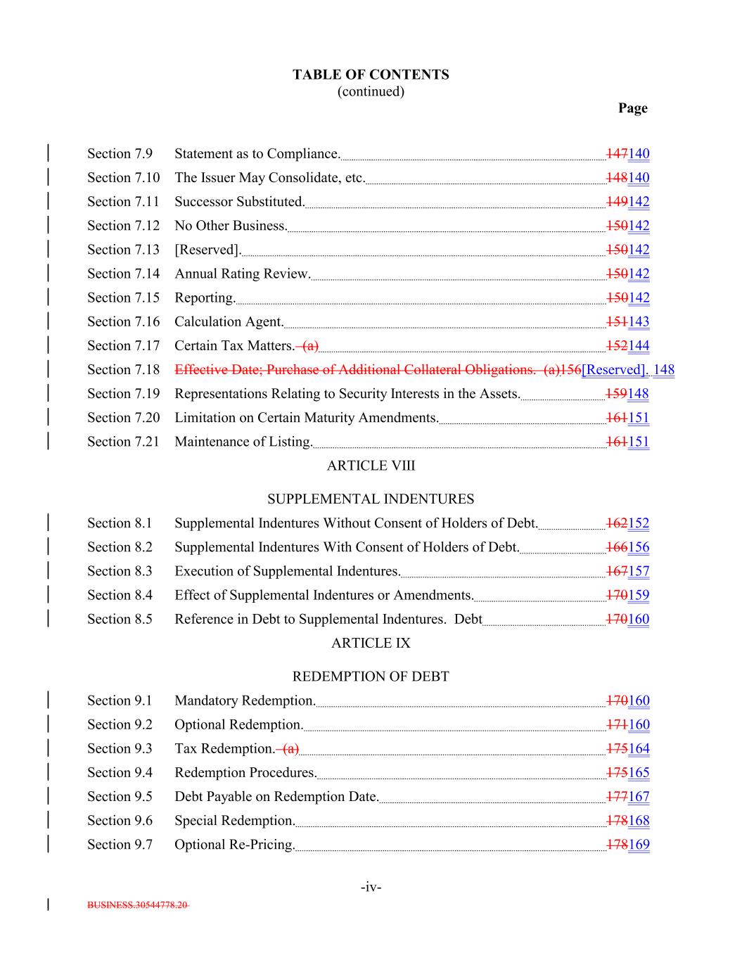 BUSINESS.30544778.20 TABLE OF CONTENTS (continued) Page -iv- Section 7.9 Statement as to Compliance. 147140 Section 7.10 The Issuer May Consolidate, etc. 148140 Section 7.11 Successor Substituted. 149142 Section 7.12 No Other Business. 150142 Section 7.13 [Reserved]. 150142 Section 7.14 Annual Rating Review. 150142 Section 7.15 Reporting. 150142 Section 7.16 Calculation Agent. 151143 Section 7.17 Certain Tax Matters. (a) 152144 Section 7.18 Effective Date; Purchase of Additional Collateral Obligations. (a)156[Reserved]. 148 Section 7.19 Representations Relating to Security Interests in the Assets. 159148 Section 7.20 Limitation on Certain Maturity Amendments. 161151 Section 7.21 Maintenance of Listing. 161151 ARTICLE VIII SUPPLEMENTAL INDENTURES Section 8.1 Supplemental Indentures Without Consent of Holders of Debt. 162152 Section 8.2 Supplemental Indentures With Consent of Holders of Debt. 166156 Section 8.3 Execution of Supplemental Indentures. 167157 Section 8.4 Effect of Supplemental Indentures or Amendments. 170159 Section 8.5 Reference in Debt to Supplemental Indentures. Debt 170160 ARTICLE IX REDEMPTION OF DEBT Section 9.1 Mandatory Redemption. 170160 Section 9.2 Optional Redemption. 171160 Section 9.3 Tax Redemption. (a) 175164 Section 9.4 Redemption Procedures. 175165 Section 9.5 Debt Payable on Redemption Date. 177167 Section 9.6 Special Redemption. 178168 Section 9.7 Optional Re-Pricing. 178169