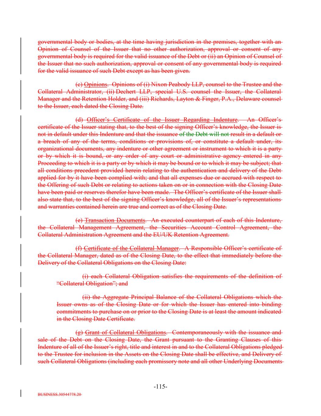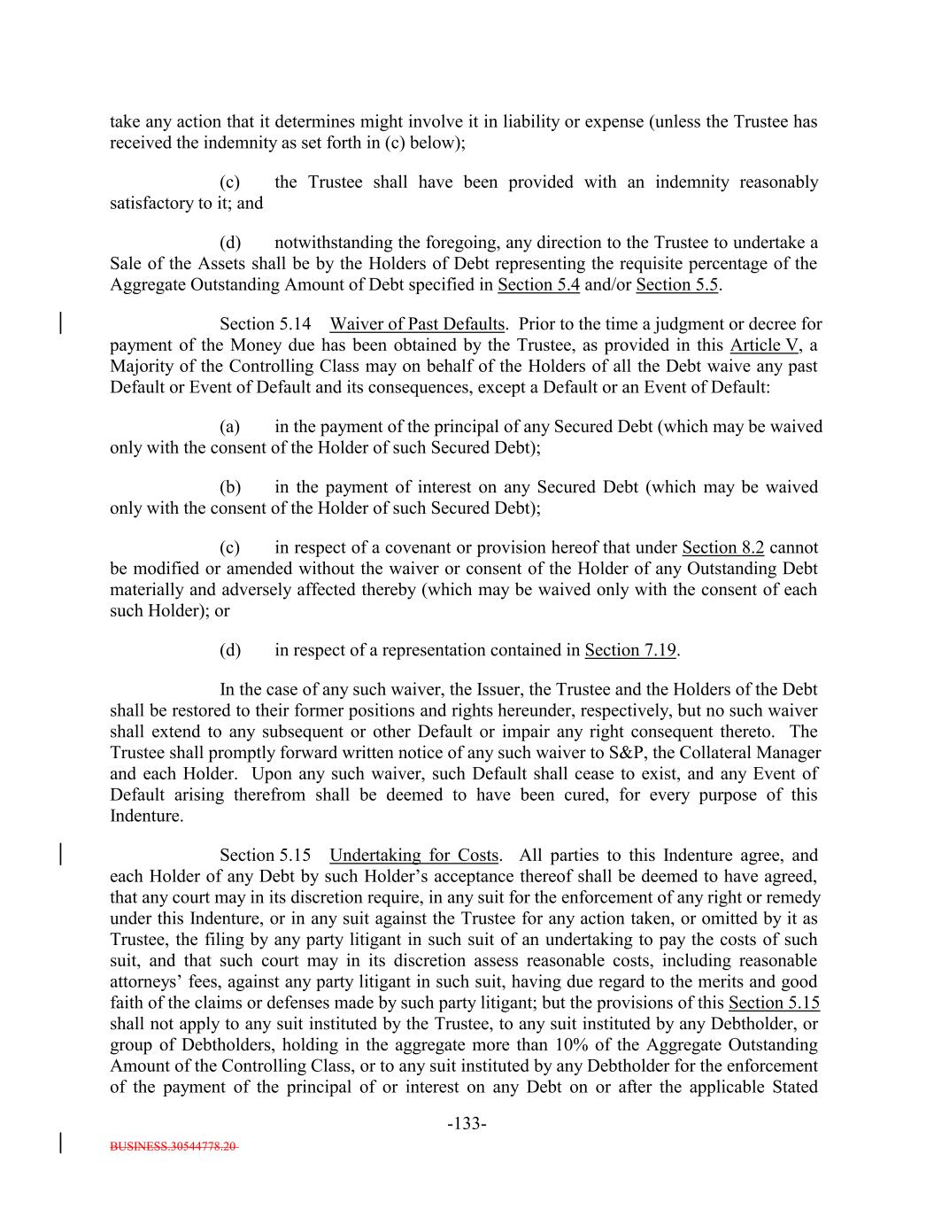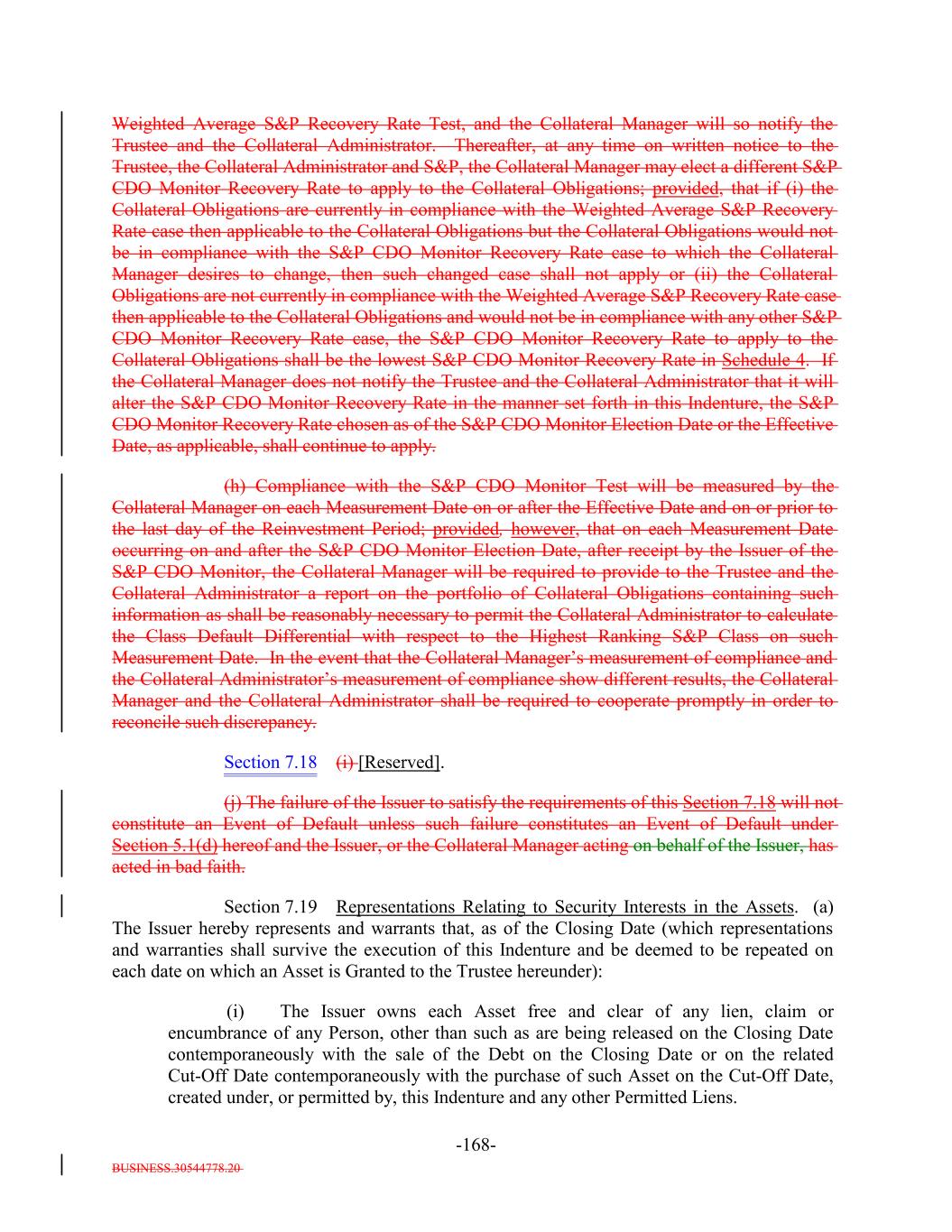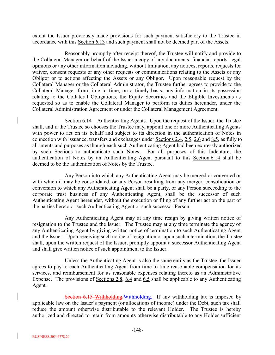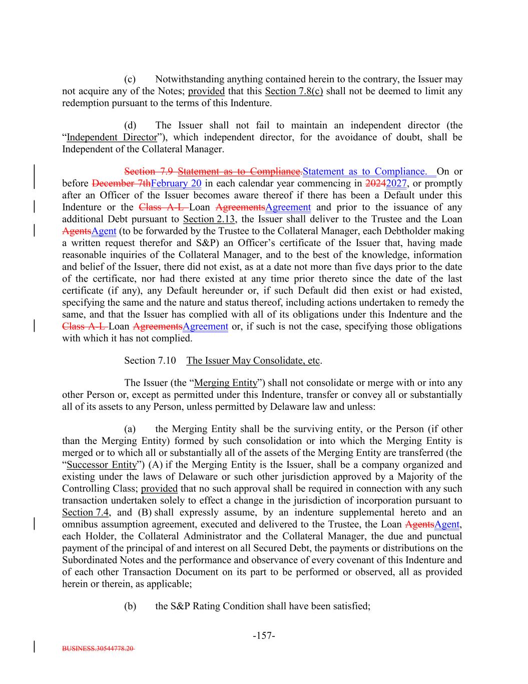 BUSINESS.30544778.20 TABLE OF CONTENTS (continued) Page -iv- Section 7.9 Statement as to Compliance. 147140 Section 7.10 The Issuer May Consolidate, etc. 148140 Section 7.11 Successor Substituted. 149142 Section 7.12 No Other Business. 150142 Section 7.13 [Reserved]. 150142 Section 7.14 Annual Rating Review. 150142 Section 7.15 Reporting. 150142 Section 7.16 Calculation Agent. 151143 Section 7.17 Certain Tax Matters. (a) 152144 Section 7.18 Effective Date; Purchase of Additional Collateral Obligations. (a)156[Reserved]. 148 Section 7.19 Representations Relating to Security Interests in the Assets. 159148 Section 7.20 Limitation on Certain Maturity Amendments. 161151 Section 7.21 Maintenance of Listing. 161151 ARTICLE VIII SUPPLEMENTAL INDENTURES Section 8.1 Supplemental Indentures Without Consent of Holders of Debt. 162152 Section 8.2 Supplemental Indentures With Consent of Holders of Debt. 166156 Section 8.3 Execution of Supplemental Indentures. 167157 Section 8.4 Effect of Supplemental Indentures or Amendments. 170159 Section 8.5 Reference in Debt to Supplemental Indentures. Debt 170160 ARTICLE IX REDEMPTION OF DEBT Section 9.1 Mandatory Redemption. 170160 Section 9.2 Optional Redemption. 171160 Section 9.3 Tax Redemption. (a) 175164 Section 9.4 Redemption Procedures. 175165 Section 9.5 Debt Payable on Redemption Date. 177167 Section 9.6 Special Redemption. 178168 Section 9.7 Optional Re-Pricing. 178169