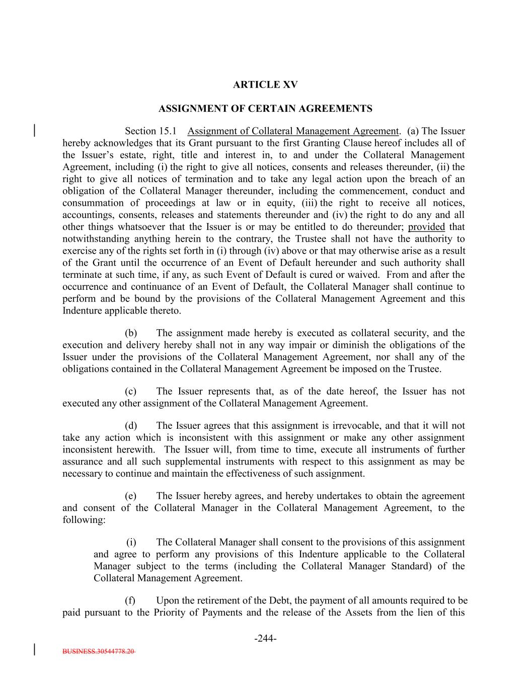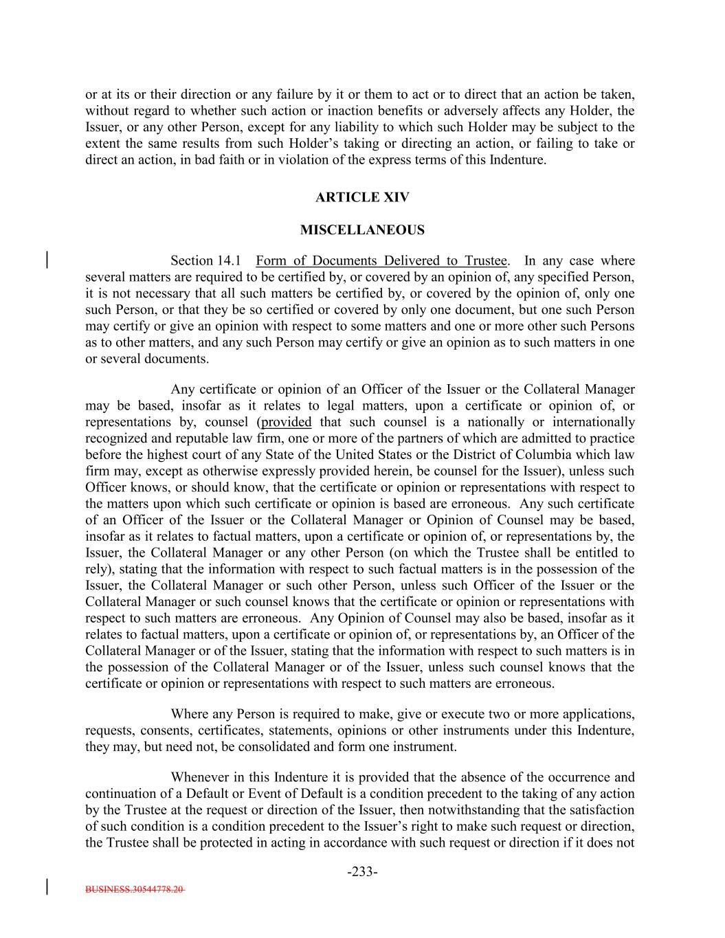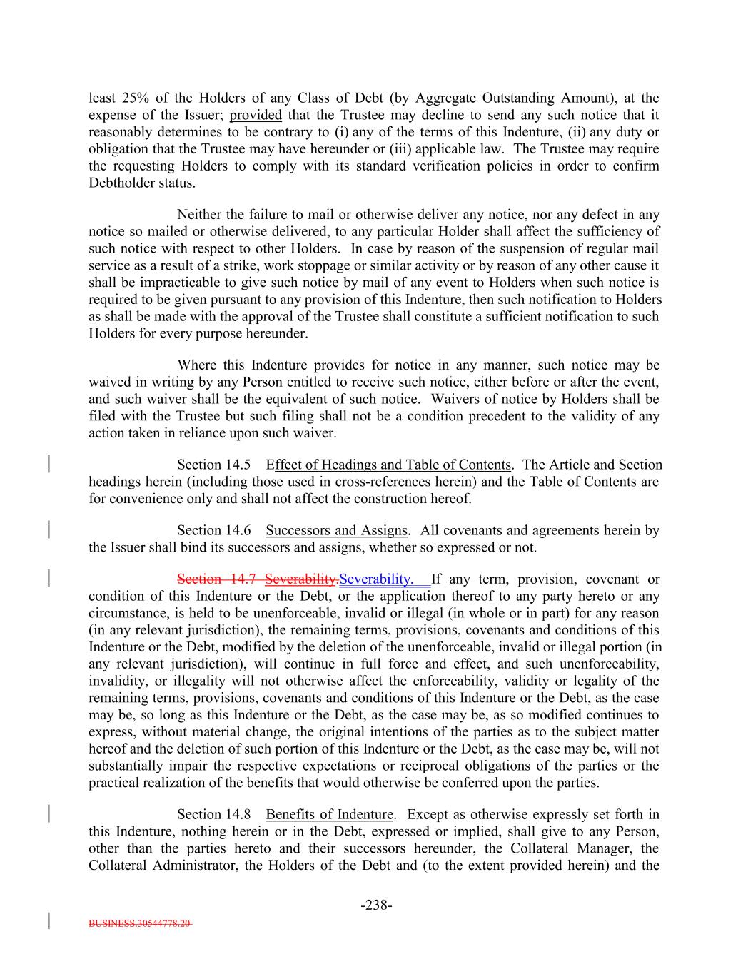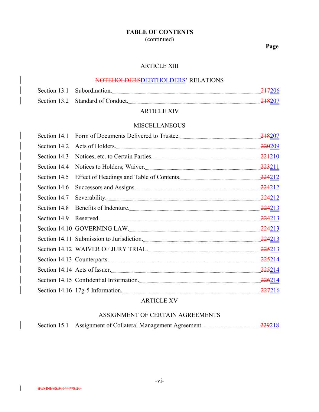 BUSINESS.30544778.20 TABLE OF CONTENTS (continued) Page -vi- ARTICLE XIII NOTEHOLDERSDEBTHOLDERS’ RELATIONS Section 13.1 Subordination. 217206 Section 13.2 Standard of Conduct. 218207 ARTICLE XIV MISCELLANEOUS Section 14.1 Form of Documents Delivered to Trustee. 218207 Section 14.2 Acts of Holders. 220209 Section 14.3 Notices, etc. to Certain Parties. 221210 Section 14.4 Notices to Holders; Waiver. 223211 Section 14.5 Effect of Headings and Table of Contents. 224212 Section 14.6 Successors and Assigns. 224212 Section 14.7 Severability. 224212 Section 14.8 Benefits of Indenture. 224213 Section 14.9 Reserved. 224213 Section 14.10 GOVERNING LAW. 224213 Section 14.11 Submission to Jurisdiction. 224213 Section 14.12 WAIVER OF JURY TRIAL. 225213 Section 14.13 Counterparts. 225214 Section 14.14 Acts of Issuer. 225214 Section 14.15 Confidential Information. 226214 Section 14.16 17g-5 Information. 227216 ARTICLE XV ASSIGNMENT OF CERTAIN AGREEMENTS Section 15.1 Assignment of Collateral Management Agreement. 229218