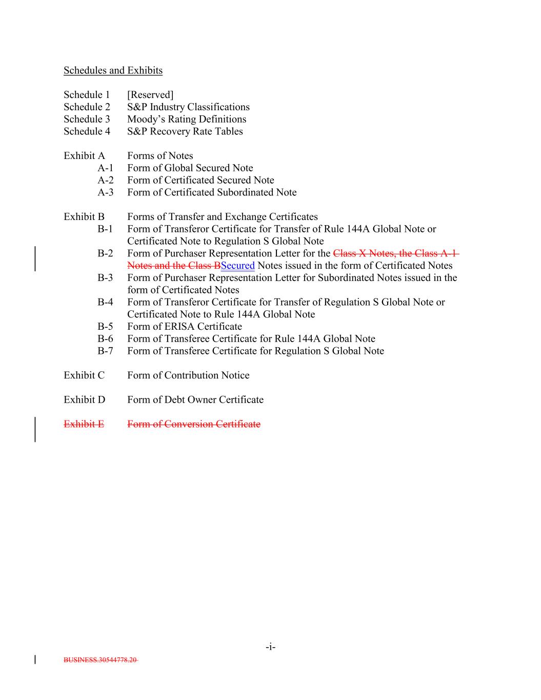 BUSINESS.30544778.20 -i- Schedules and Exhibits Schedule 1 [Reserved] Schedule 2 S&P Industry Classifications Schedule 3 Moody’s Rating Definitions Schedule 4 S&P Recovery Rate Tables Exhibit A Forms of Notes A-1 Form of Global Secured Note A-2 Form of Certificated Secured Note A-3 Form of Certificated Subordinated Note Exhibit B Forms of Transfer and Exchange Certificates B-1 Form of Transferor Certificate for Transfer of Rule 144A Global Note or Certificated Note to Regulation S Global Note B-2 Form of Purchaser Representation Letter for the Class X Notes, the Class A-1 Notes and the Class BSecured Notes issued in the form of Certificated Notes B-3 Form of Purchaser Representation Letter for Subordinated Notes issued in the form of Certificated Notes B-4 Form of Transferor Certificate for Transfer of Regulation S Global Note or Certificated Note to Rule 144A Global Note B-5 Form of ERISA Certificate B-6 Form of Transferee Certificate for Rule 144A Global Note B-7 Form of Transferee Certificate for Regulation S Global Note Exhibit C Form of Contribution Notice Exhibit D Form of Debt Owner Certificate Exhibit E Form of Conversion Certificate