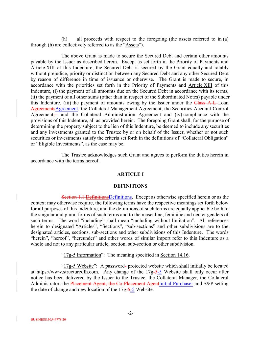 BUSINESS.30544778.20 -2- (h) all proceeds with respect to the foregoing (the assets referred to in (a) through (h) are collectively referred to as the “Assets”). The above Grant is made to secure the Secured Debt and certain other amounts payable by the Issuer as described herein. Except as set forth in the Priority of Payments and Article XIII of this Indenture, the Secured Debt is secured by the Grant equally and ratably without prejudice, priority or distinction between any Secured Debt and any other Secured Debt by reason of difference in time of issuance or otherwise. The Grant is made to secure, in accordance with the priorities set forth in the Priority of Payments and Article XIII of this Indenture, (i) the payment of all amounts due on the Secured Debt in accordance with its terms, (ii) the payment of all other sums (other than in respect of the Subordinated Notes) payable under this Indenture, (iii) the payment of amounts owing by the Issuer under the Class A-L Loan AgreementsAgreement, the Collateral Management Agreement, the Securities Account Control Agreement, and the Collateral Administration Agreement and (iv) compliance with the provisions of this Indenture, all as provided herein. The foregoing Grant shall, for the purpose of determining the property subject to the lien of this Indenture, be deemed to include any securities and any investments granted to the Trustee by or on behalf of the Issuer, whether or not such securities or investments satisfy the criteria set forth in the definitions of “Collateral Obligation” or “Eligible Investments”, as the case may be. The Trustee acknowledges such Grant and agrees to perform the duties herein in accordance with the terms hereof. ARTICLE I DEFINITIONS Section 1.1 DefinitionsDefinitions. Except as otherwise specified herein or as the context may otherwise require, the following terms have the respective meanings set forth below for all purposes of this Indenture, and the definitions of such terms are equally applicable both to the singular and plural forms of such terms and to the masculine, feminine and neuter genders of such terms. The word “including” shall mean “including without limitation”. All references herein to designated “Articles”, “Sections”, “sub-sections” and other subdivisions are to the designated articles, sections, sub-sections and other subdivisions of this Indenture. The words “herein”, “hereof”, “hereunder” and other words of similar import refer to this Indenture as a whole and not to any particular article, section, sub-section or other subdivision. “17g-5 Information”: The meaning specified in Section 14.16. “17g-5 Website”: A password- protected website which shall initially be located at https://www.structuredfn.com. Any change of the 17g-5-5 Website shall only occur after notice has been delivered by the Issuer to the Trustee, the Collateral Manager, the Collateral Administrator, the Placement Agent, the Co-Placement AgentInitial Purchaser and S&P setting the date of change and new location of the 17g-5-5 Website.