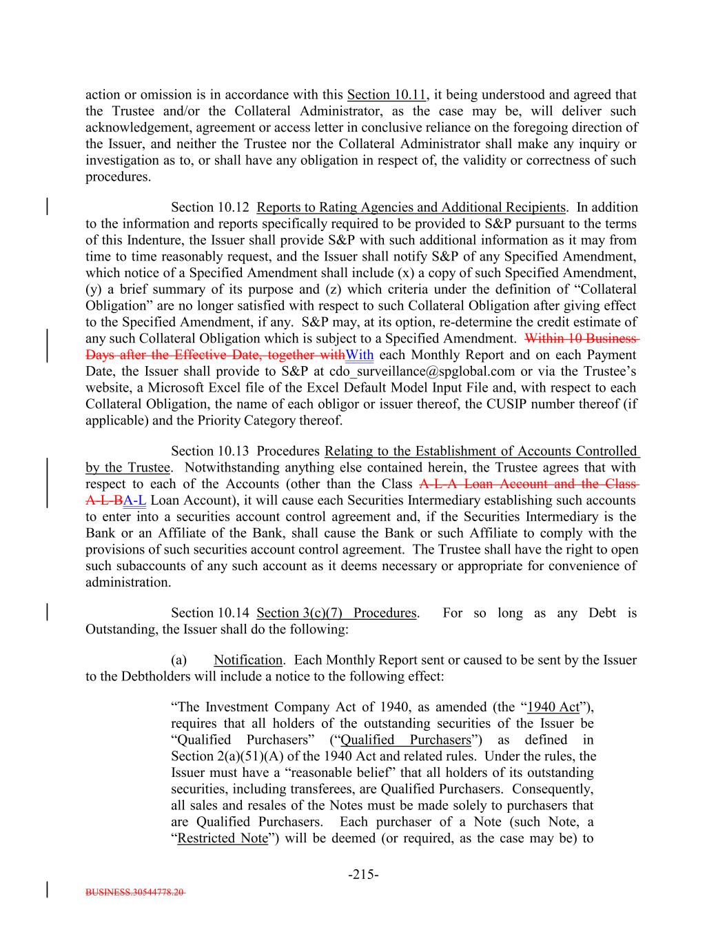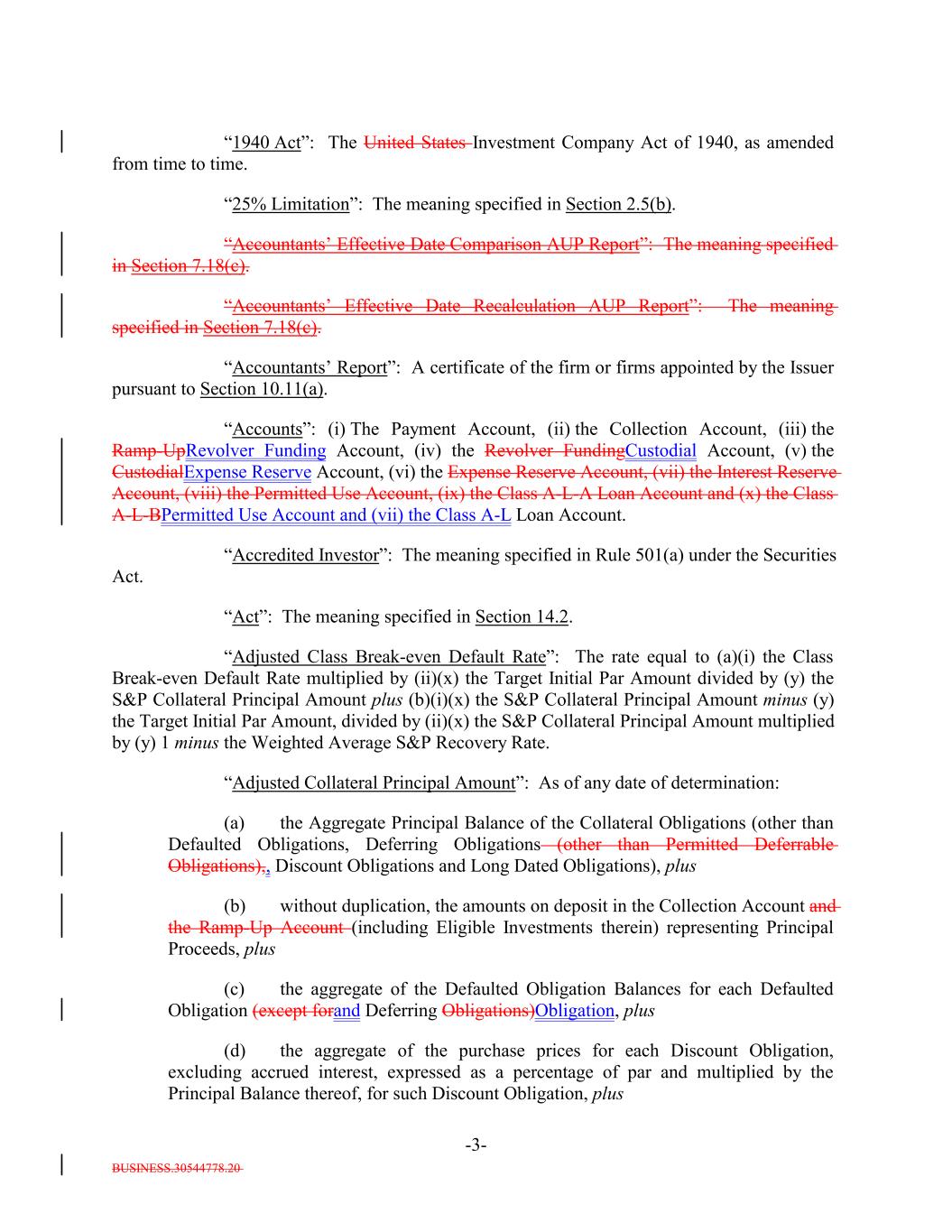 BUSINESS.30544778.20 -3- “1940 Act”: The United States Investment Company Act of 1940, as amended from time to time. “25% Limitation”: The meaning specified in Section 2.5(b). “Accountants’ Effective Date Comparison AUP Report”: The meaning specified in Section 7.18(c). “Accountants’ Effective Date Recalculation AUP Report”: The meaning specified in Section 7.18(c). “Accountants’ Report”: A certificate of the firm or firms appointed by the Issuer pursuant to Section 10.11(a). “Accounts”: (i) The Payment Account, (ii) the Collection Account, (iii) the Ramp-UpRevolver Funding Account, (iv) the Revolver FundingCustodial Account, (v) the CustodialExpense Reserve Account, (vi) the Expense Reserve Account, (vii) the Interest Reserve Account, (viii) the Permitted Use Account, (ix) the Class A-L-A Loan Account and (x) the Class A-L-BPermitted Use Account and (vii) the Class A-L Loan Account. “Accredited Investor”: The meaning specified in Rule 501(a) under the Securities Act. “Act”: The meaning specified in Section 14.2. “Adjusted Class Break-even Default Rate”: The rate equal to (a)(i) the Class Break-even Default Rate multiplied by (ii)(x) the Target Initial Par Amount divided by (y) the S&P Collateral Principal Amount plus (b)(i)(x) the S&P Collateral Principal Amount minus (y) the Target Initial Par Amount, divided by (ii)(x) the S&P Collateral Principal Amount multiplied by (y) 1 minus the Weighted Average S&P Recovery Rate. “Adjusted Collateral Principal Amount”: As of any date of determination: (a) the Aggregate Principal Balance of the Collateral Obligations (other than Defaulted Obligations, Deferring Obligations (other than Permitted Deferrable Obligations),, Discount Obligations and Long Dated Obligations), plus (b) without duplication, the amounts on deposit in the Collection Account and the Ramp-Up Account (including Eligible Investments therein) representing Principal Proceeds, plus (c) the aggregate of the Defaulted Obligation Balances for each Defaulted Obligation (except forand Deferring Obligations)Obligation, plus (d) the aggregate of the purchase prices for each Discount Obligation, excluding accrued interest, expressed as a percentage of par and multiplied by the Principal Balance thereof, for such Discount Obligation, plus