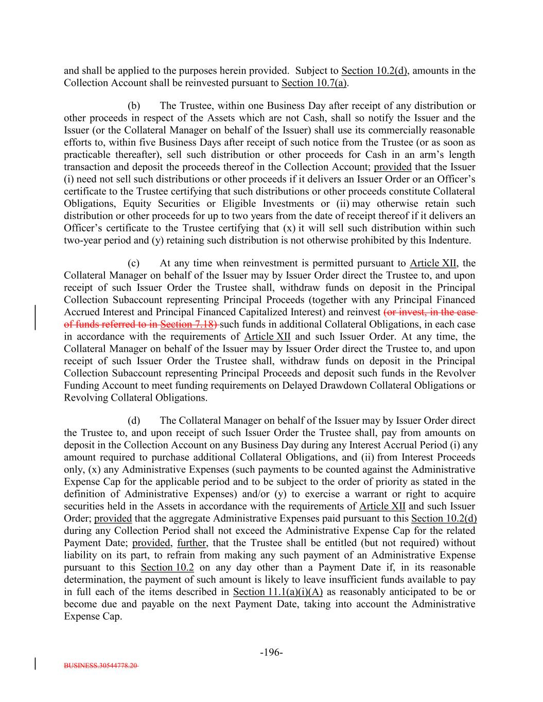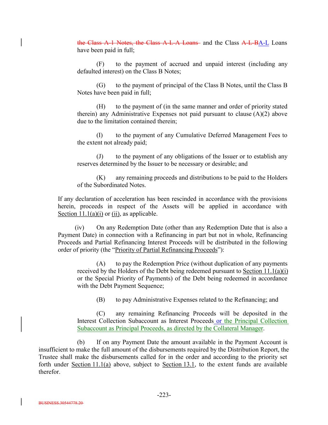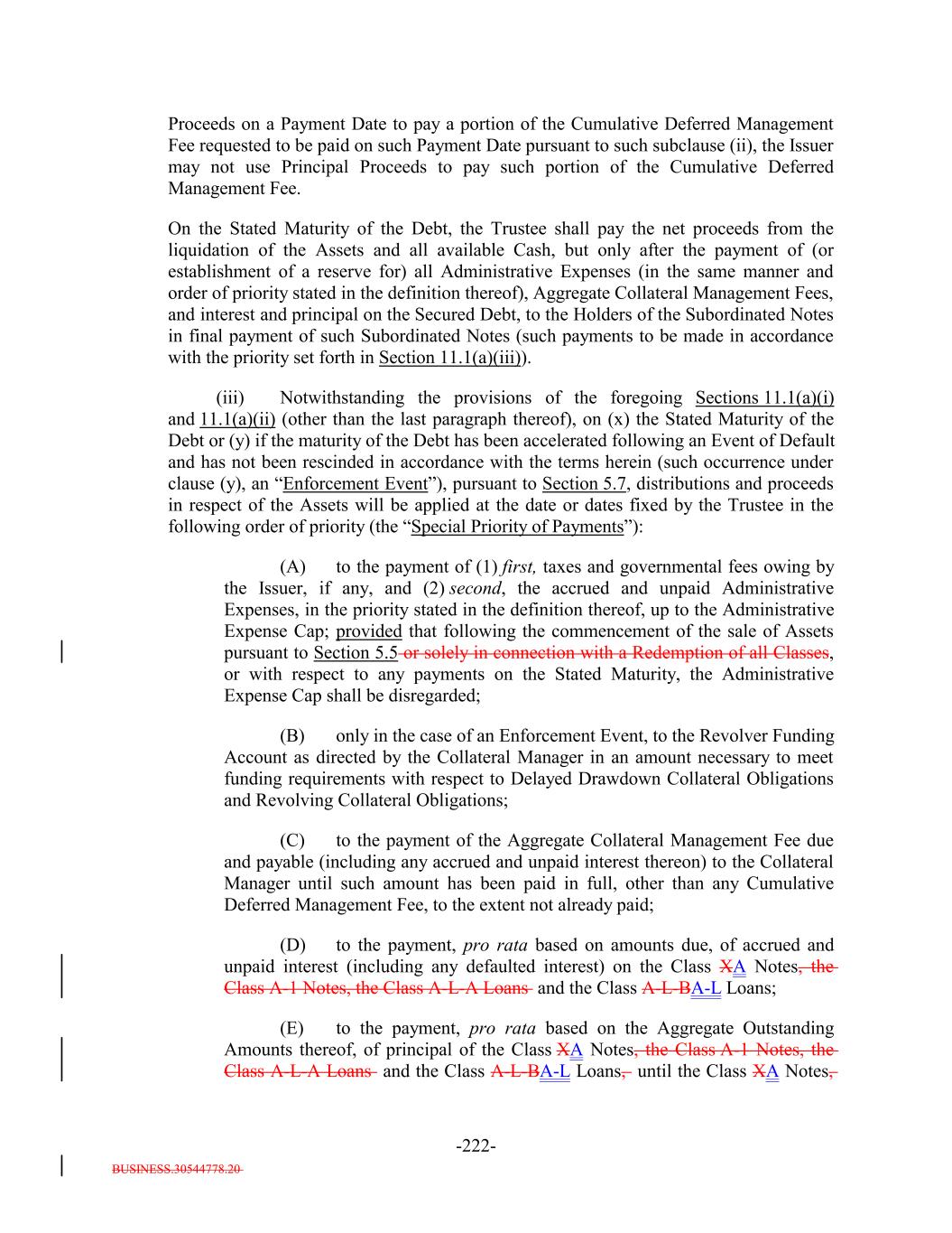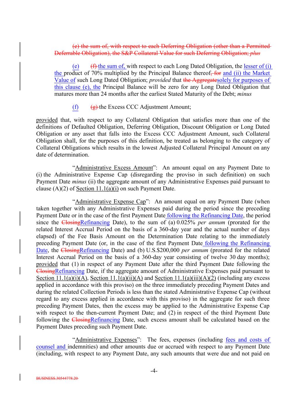 BUSINESS.30544778.20 -4- (e) the sum of, with respect to each Deferring Obligation (other than a Permitted Deferrable Obligation), the S&P Collateral Value for such Deferring Obligation; plus (e) (f) the sum of, with respect to each Long Dated Obligation, the lesser of (i) the product of 70% multiplied by the Principal Balance thereof, for and (ii) the Market Value of such Long Dated Obligation; provided that the Aggregatesolely for purposes of this clause (e), the Principal Balance will be zero for any Long Dated Obligation that matures more than 24 months after the earliest Stated Maturity of the Debt; minus (f) (g) the Excess CCC Adjustment Amount; provided that, with respect to any Collateral Obligation that satisfies more than one of the definitions of Defaulted Obligation, Deferring Obligation, Discount Obligation or Long Dated Obligation or any asset that falls into the Excess CCC Adjustment Amount, such Collateral Obligation shall, for the purposes of this definition, be treated as belonging to the category of Collateral Obligations which results in the lowest Adjusted Collateral Principal Amount on any date of determination. “Administrative Excess Amount”: An amount equal on any Payment Date to (i) the Administrative Expense Cap (disregarding the proviso in such definition) on such Payment Date minus (ii) the aggregate amount of any Administrative Expenses paid pursuant to clause (A)(2) of Section 11.1(a)(i) on such Payment Date. “Administrative Expense Cap”: An amount equal on any Payment Date (when taken together with any Administrative Expenses paid during the period since the preceding Payment Date or in the case of the first Payment Date following the Refinancing Date, the period since the ClosingRefinancing Date), to the sum of (a) 0.025% per annum (prorated for the related Interest Accrual Period on the basis of a 360-day year and the actual number of days elapsed) of the Fee Basis Amount on the Determination Date relating to the immediately preceding Payment Date (or, in the case of the first Payment Date following the Refinancing Date, the ClosingRefinancing Date) and (b) U.S.$200,000 per annum (prorated for the related Interest Accrual Period on the basis of a 360-day year consisting of twelve 30 day months); provided that (1) in respect of any Payment Date after the third Payment Date following the ClosingRefinancing Date, if the aggregate amount of Administrative Expenses paid pursuant to Section 11.1(a)(i)(A), Section 11.1(a)(ii)(A) and Section 11.1(a)(iii)(A)(2) (including any excess applied in accordance with this proviso) on the three immediately preceding Payment Dates and during the related Collection Periods is less than the stated Administrative Expense Cap (without regard to any excess applied in accordance with this proviso) in the aggregate for such three preceding Payment Dates, then the excess may be applied to the Administrative Expense Cap with respect to the then-current Payment Date; and (2) in respect of the third Payment Date following the ClosingRefinancing Date, such excess amount shall be calculated based on the Payment Dates preceding such Payment Date. “Administrative Expenses”: The fees, expenses (including fees and costs of counsel and indemnities) and other amounts due or accrued with respect to any Payment Date (including, with respect to any Payment Date, any such amounts that were due and not paid on