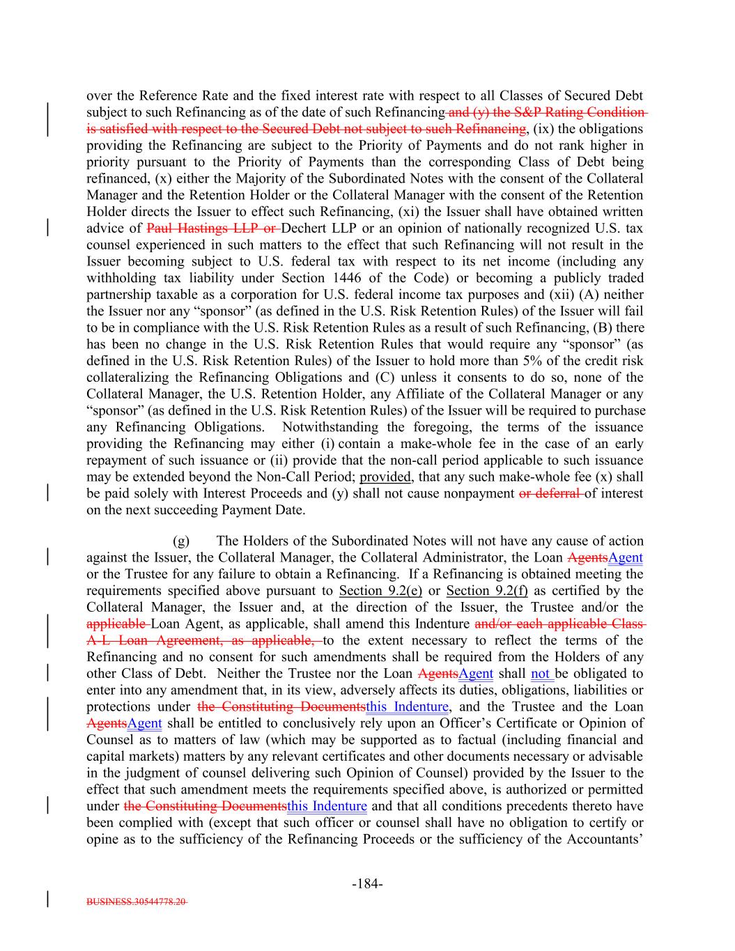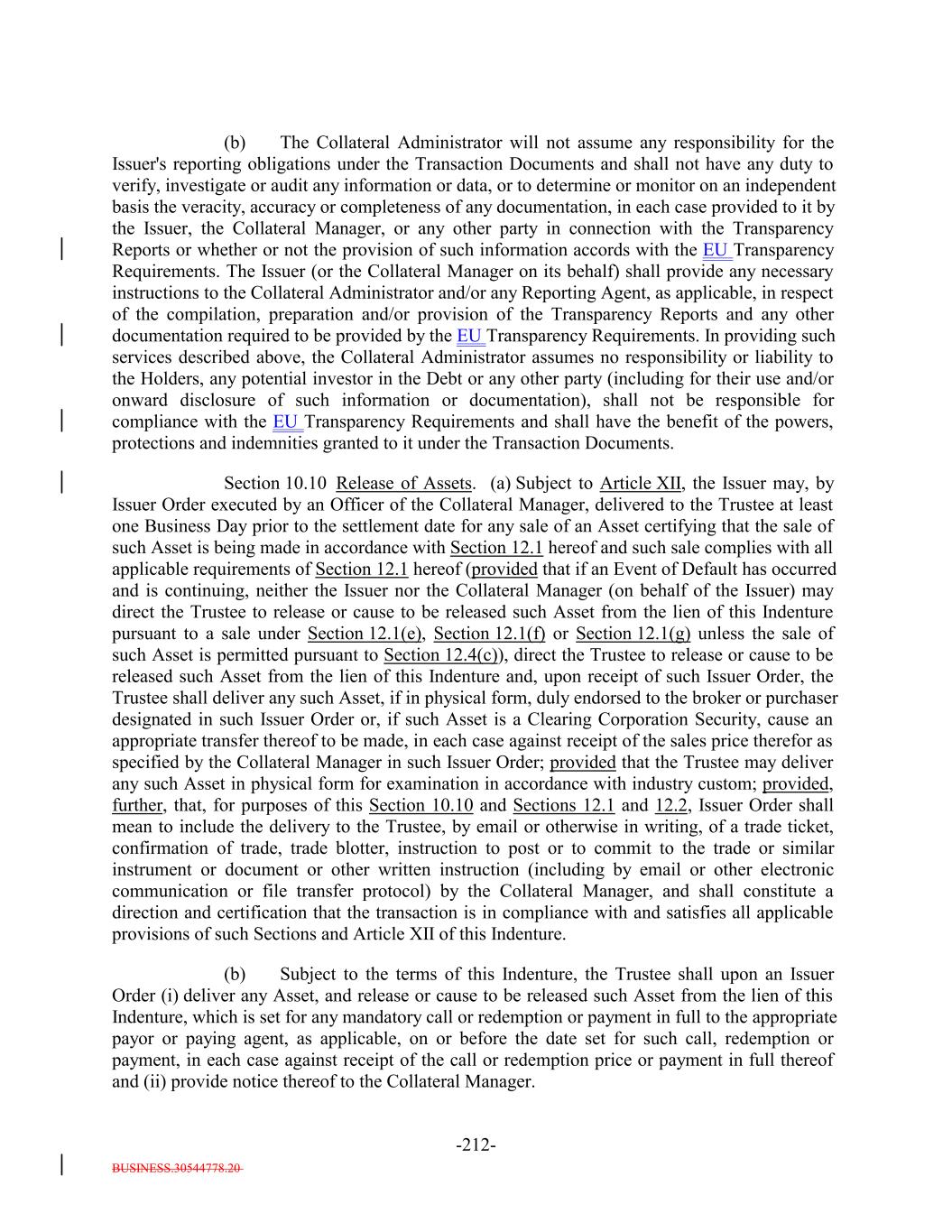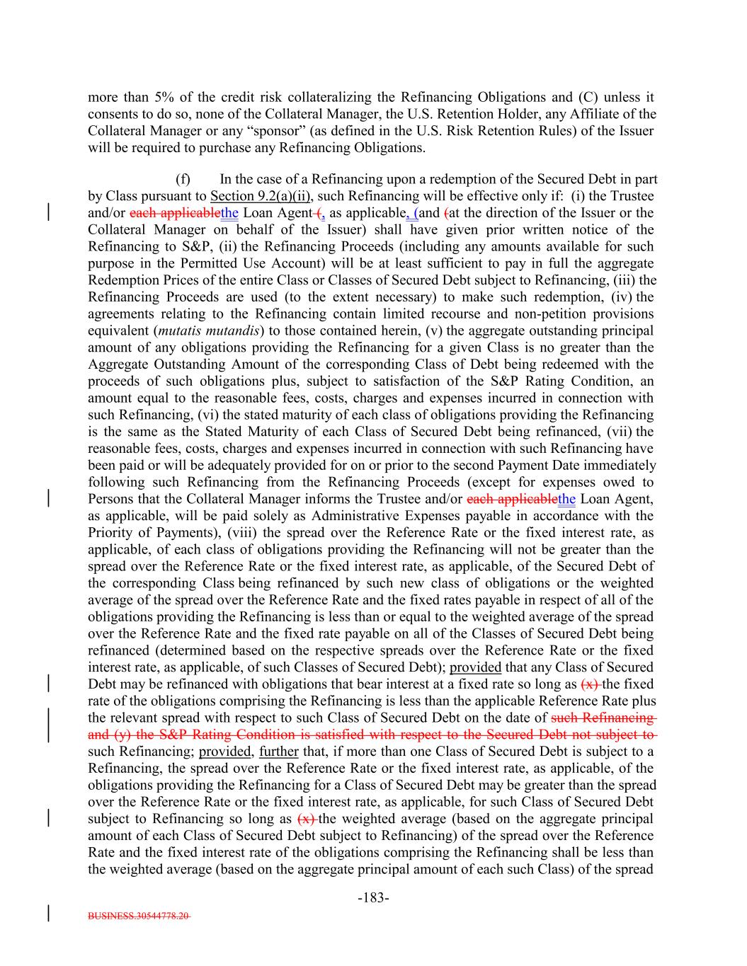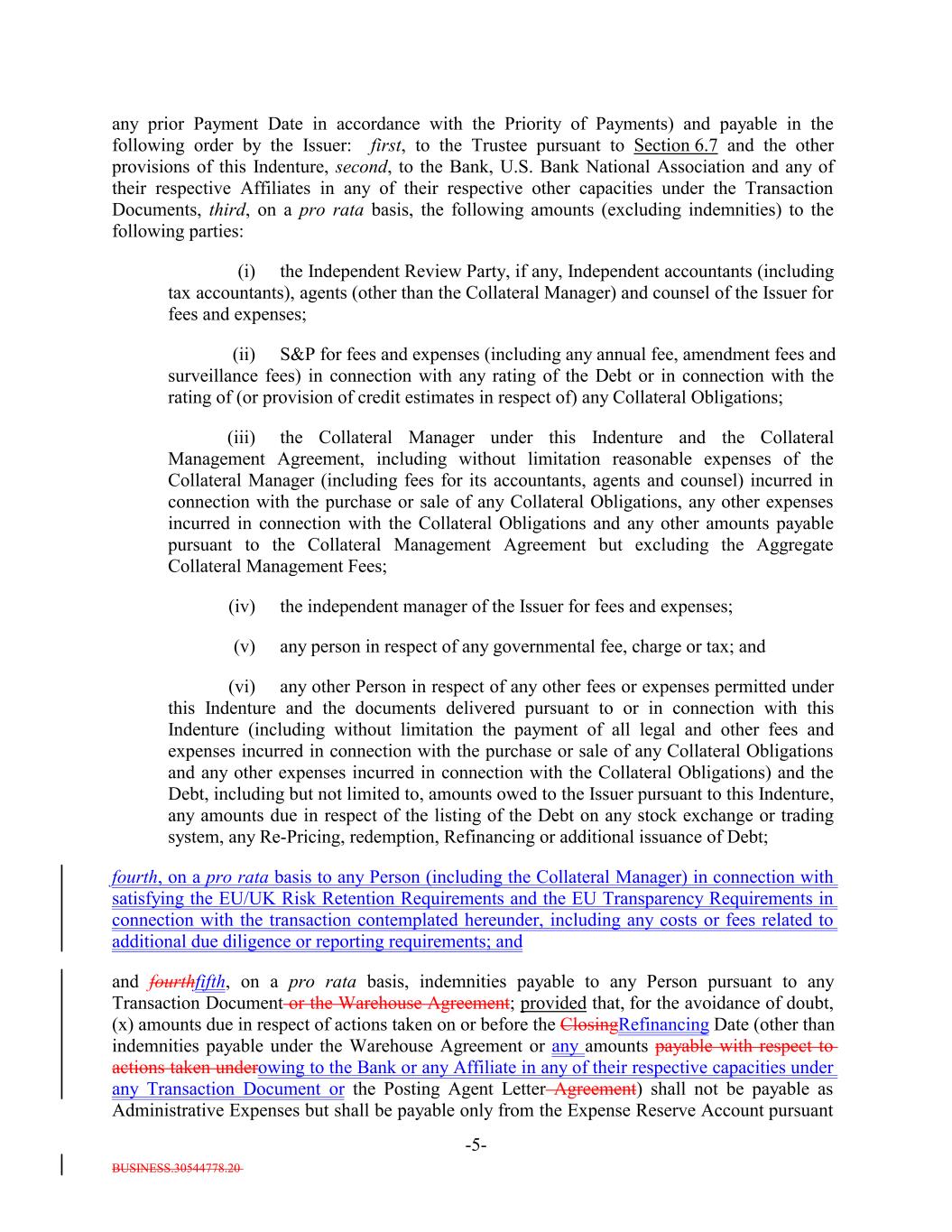 BUSINESS.30544778.20 -5- any prior Payment Date in accordance with the Priority of Payments) and payable in the following order by the Issuer: first, to the Trustee pursuant to Section 6.7 and the other provisions of this Indenture, second, to the Bank, U.S. Bank National Association and any of their respective Affiliates in any of their respective other capacities under the Transaction Documents, third, on a pro rata basis, the following amounts (excluding indemnities) to the following parties: (i) the Independent Review Party, if any, Independent accountants (including tax accountants), agents (other than the Collateral Manager) and counsel of the Issuer for fees and expenses; (ii) S&P for fees and expenses (including any annual fee, amendment fees and surveillance fees) in connection with any rating of the Debt or in connection with the rating of (or provision of credit estimates in respect of) any Collateral Obligations; (iii) the Collateral Manager under this Indenture and the Collateral Management Agreement, including without limitation reasonable expenses of the Collateral Manager (including fees for its accountants, agents and counsel) incurred in connection with the purchase or sale of any Collateral Obligations, any other expenses incurred in connection with the Collateral Obligations and any other amounts payable pursuant to the Collateral Management Agreement but excluding the Aggregate Collateral Management Fees; (iv) the independent manager of the Issuer for fees and expenses; (v) any person in respect of any governmental fee, charge or tax; and (vi) any other Person in respect of any other fees or expenses permitted under this Indenture and the documents delivered pursuant to or in connection with this Indenture (including without limitation the payment of all legal and other fees and expenses incurred in connection with the purchase or sale of any Collateral Obligations and any other expenses incurred in connection with the Collateral Obligations) and the Debt, including but not limited to, amounts owed to the Issuer pursuant to this Indenture, any amounts due in respect of the listing of the Debt on any stock exchange or trading system, any Re-Pricing, redemption, Refinancing or additional issuance of Debt; fourth, on a pro rata basis to any Person (including the Collateral Manager) in connection with satisfying the EU/UK Risk Retention Requirements and the EU Transparency Requirements in connection with the transaction contemplated hereunder, including any costs or fees related to additional due diligence or reporting requirements; and and fourthfifth, on a pro rata basis, indemnities payable to any Person pursuant to any Transaction Document or the Warehouse Agreement; provided that, for the avoidance of doubt, (x) amounts due in respect of actions taken on or before the ClosingRefinancing Date (other than indemnities payable under the Warehouse Agreement or any amounts payable with respect to actions taken underowing to the Bank or any Affiliate in any of their respective capacities under any Transaction Document or the Posting Agent Letter Agreement) shall not be payable as Administrative Expenses but shall be payable only from the Expense Reserve Account pursuant