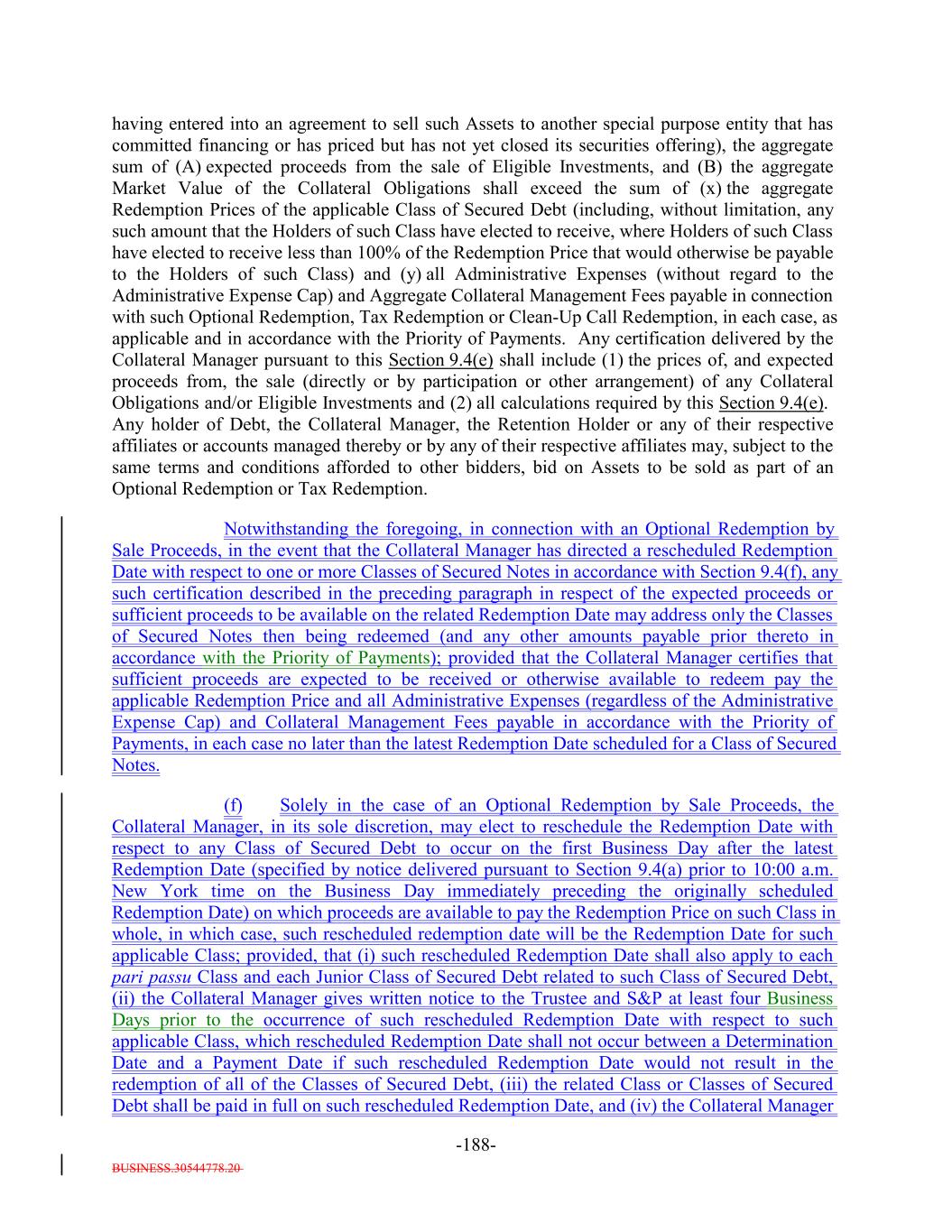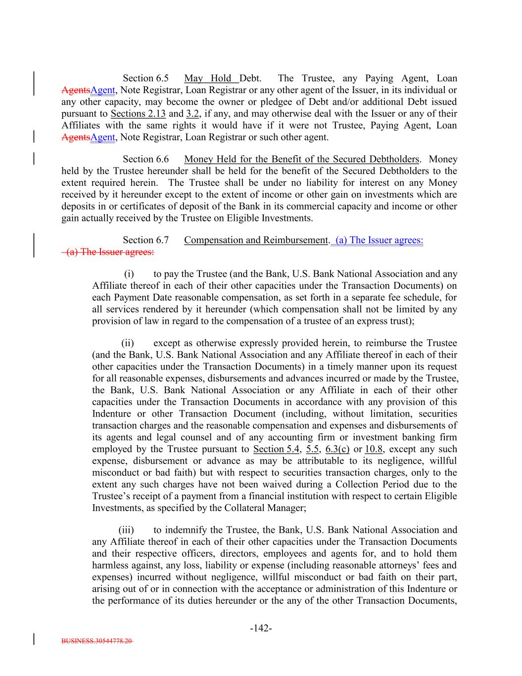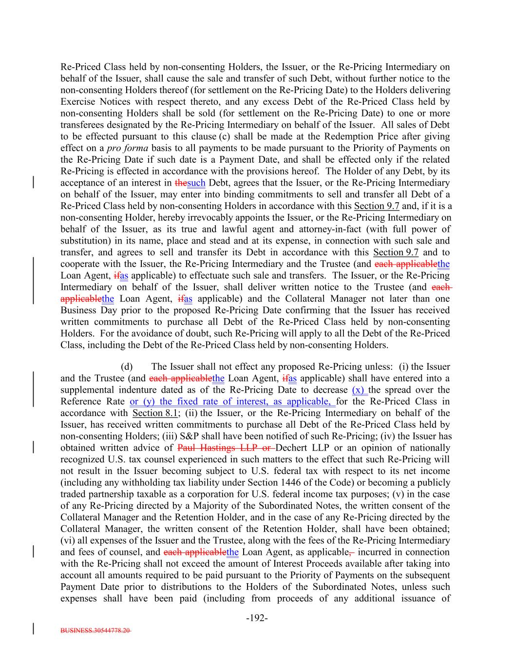 BUSINESS.30544778.20 -5- any prior Payment Date in accordance with the Priority of Payments) and payable in the following order by the Issuer: first, to the Trustee pursuant to Section 6.7 and the other provisions of this Indenture, second, to the Bank, U.S. Bank National Association and any of their respective Affiliates in any of their respective other capacities under the Transaction Documents, third, on a pro rata basis, the following amounts (excluding indemnities) to the following parties: (i) the Independent Review Party, if any, Independent accountants (including tax accountants), agents (other than the Collateral Manager) and counsel of the Issuer for fees and expenses; (ii) S&P for fees and expenses (including any annual fee, amendment fees and surveillance fees) in connection with any rating of the Debt or in connection with the rating of (or provision of credit estimates in respect of) any Collateral Obligations; (iii) the Collateral Manager under this Indenture and the Collateral Management Agreement, including without limitation reasonable expenses of the Collateral Manager (including fees for its accountants, agents and counsel) incurred in connection with the purchase or sale of any Collateral Obligations, any other expenses incurred in connection with the Collateral Obligations and any other amounts payable pursuant to the Collateral Management Agreement but excluding the Aggregate Collateral Management Fees; (iv) the independent manager of the Issuer for fees and expenses; (v) any person in respect of any governmental fee, charge or tax; and (vi) any other Person in respect of any other fees or expenses permitted under this Indenture and the documents delivered pursuant to or in connection with this Indenture (including without limitation the payment of all legal and other fees and expenses incurred in connection with the purchase or sale of any Collateral Obligations and any other expenses incurred in connection with the Collateral Obligations) and the Debt, including but not limited to, amounts owed to the Issuer pursuant to this Indenture, any amounts due in respect of the listing of the Debt on any stock exchange or trading system, any Re-Pricing, redemption, Refinancing or additional issuance of Debt; fourth, on a pro rata basis to any Person (including the Collateral Manager) in connection with satisfying the EU/UK Risk Retention Requirements and the EU Transparency Requirements in connection with the transaction contemplated hereunder, including any costs or fees related to additional due diligence or reporting requirements; and and fourthfifth, on a pro rata basis, indemnities payable to any Person pursuant to any Transaction Document or the Warehouse Agreement; provided that, for the avoidance of doubt, (x) amounts due in respect of actions taken on or before the ClosingRefinancing Date (other than indemnities payable under the Warehouse Agreement or any amounts payable with respect to actions taken underowing to the Bank or any Affiliate in any of their respective capacities under any Transaction Document or the Posting Agent Letter Agreement) shall not be payable as Administrative Expenses but shall be payable only from the Expense Reserve Account pursuant