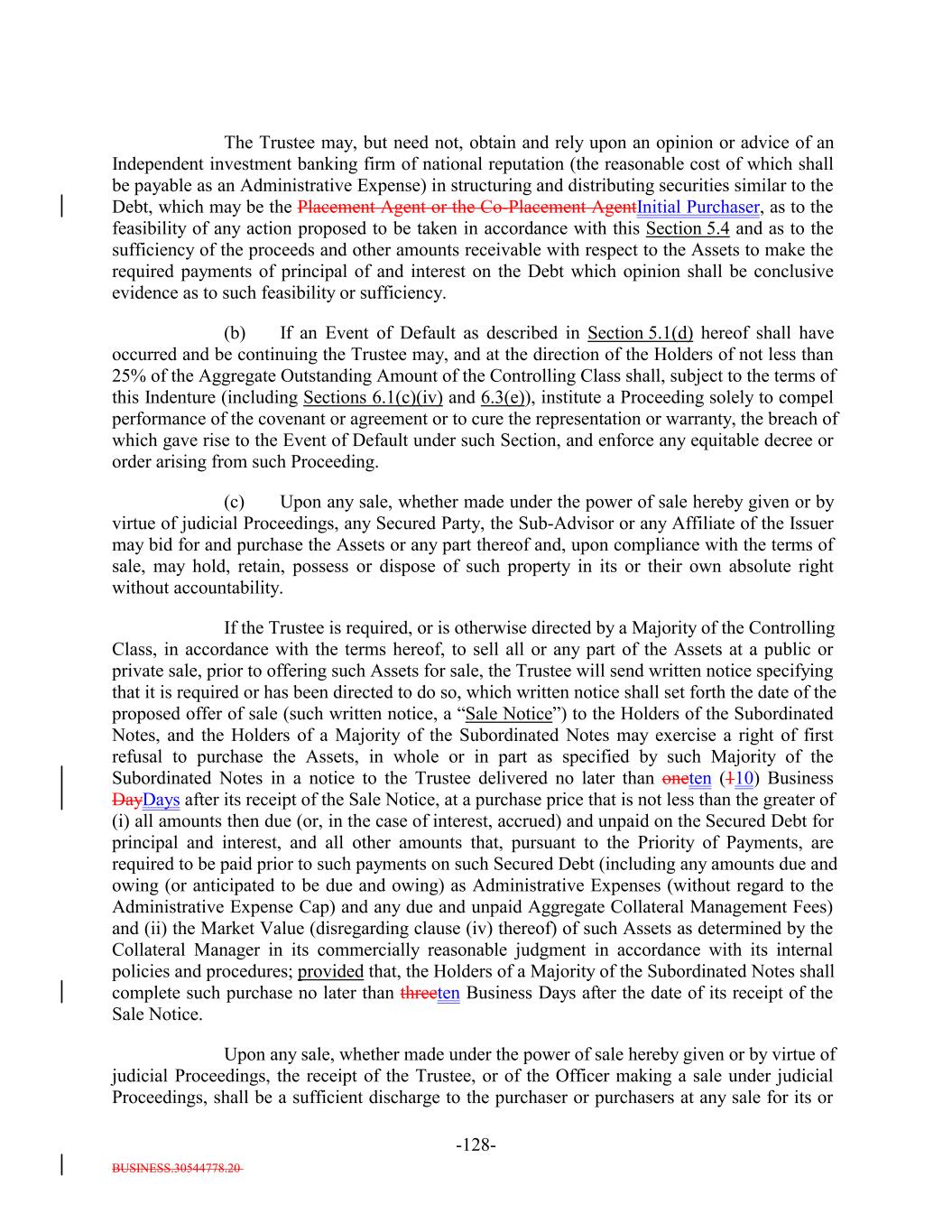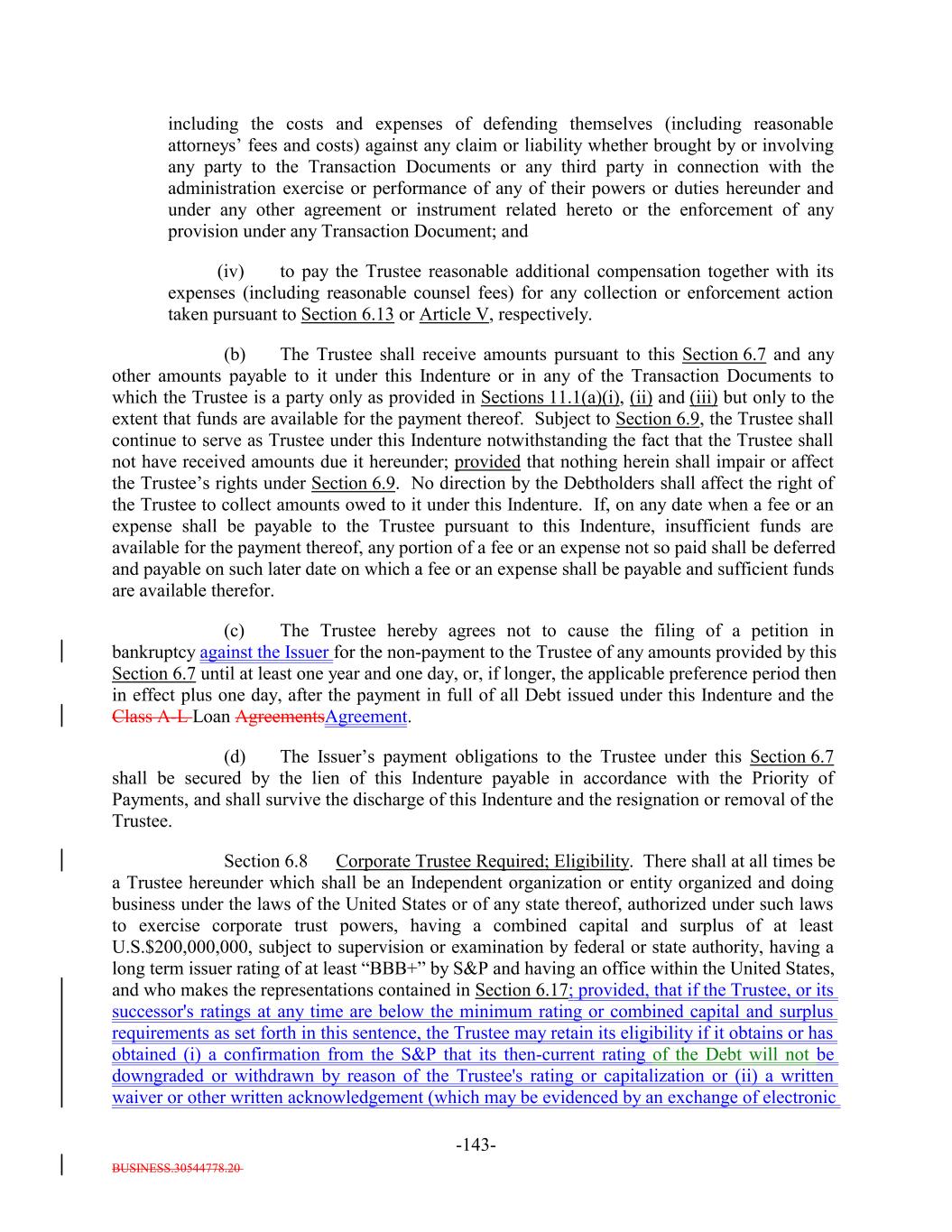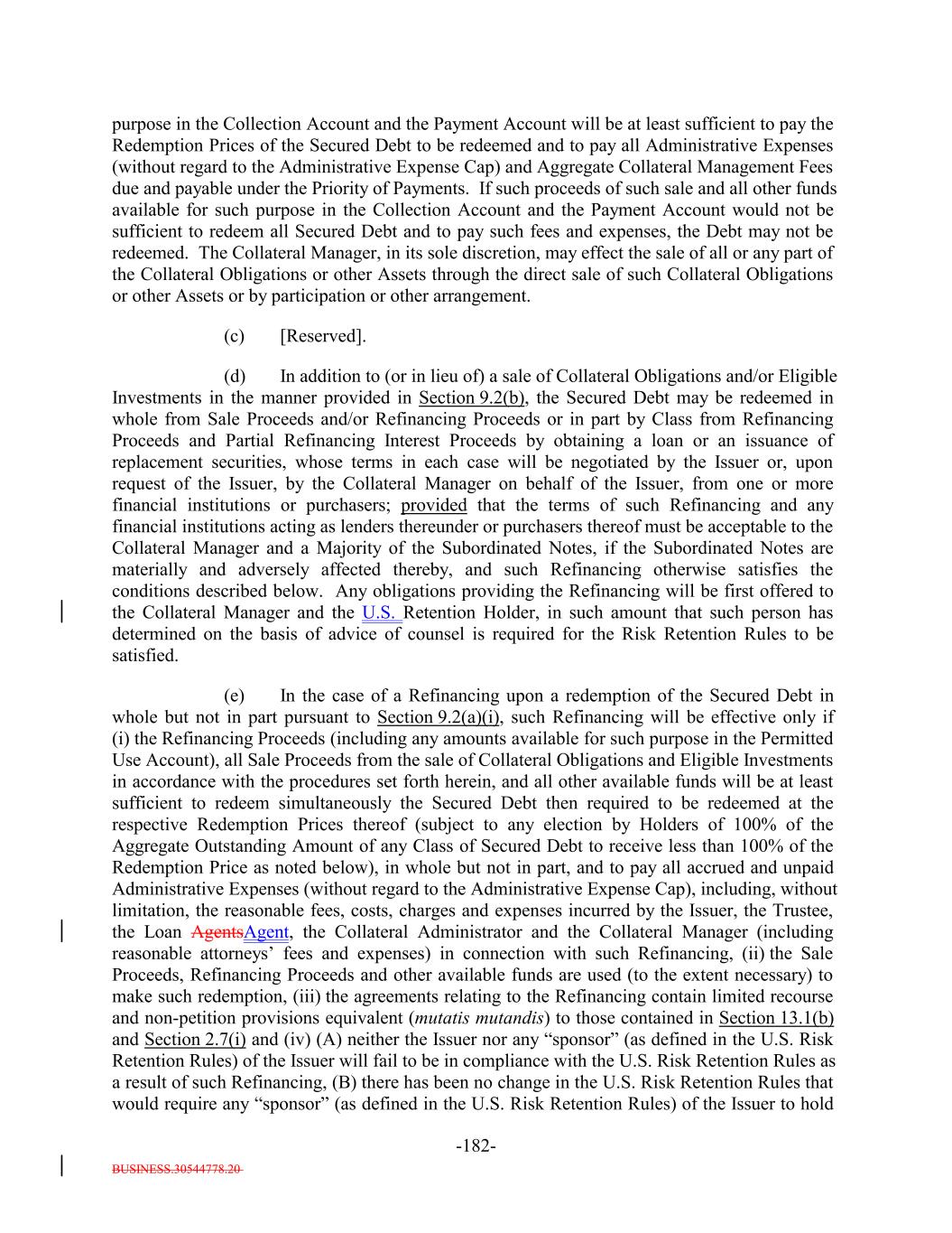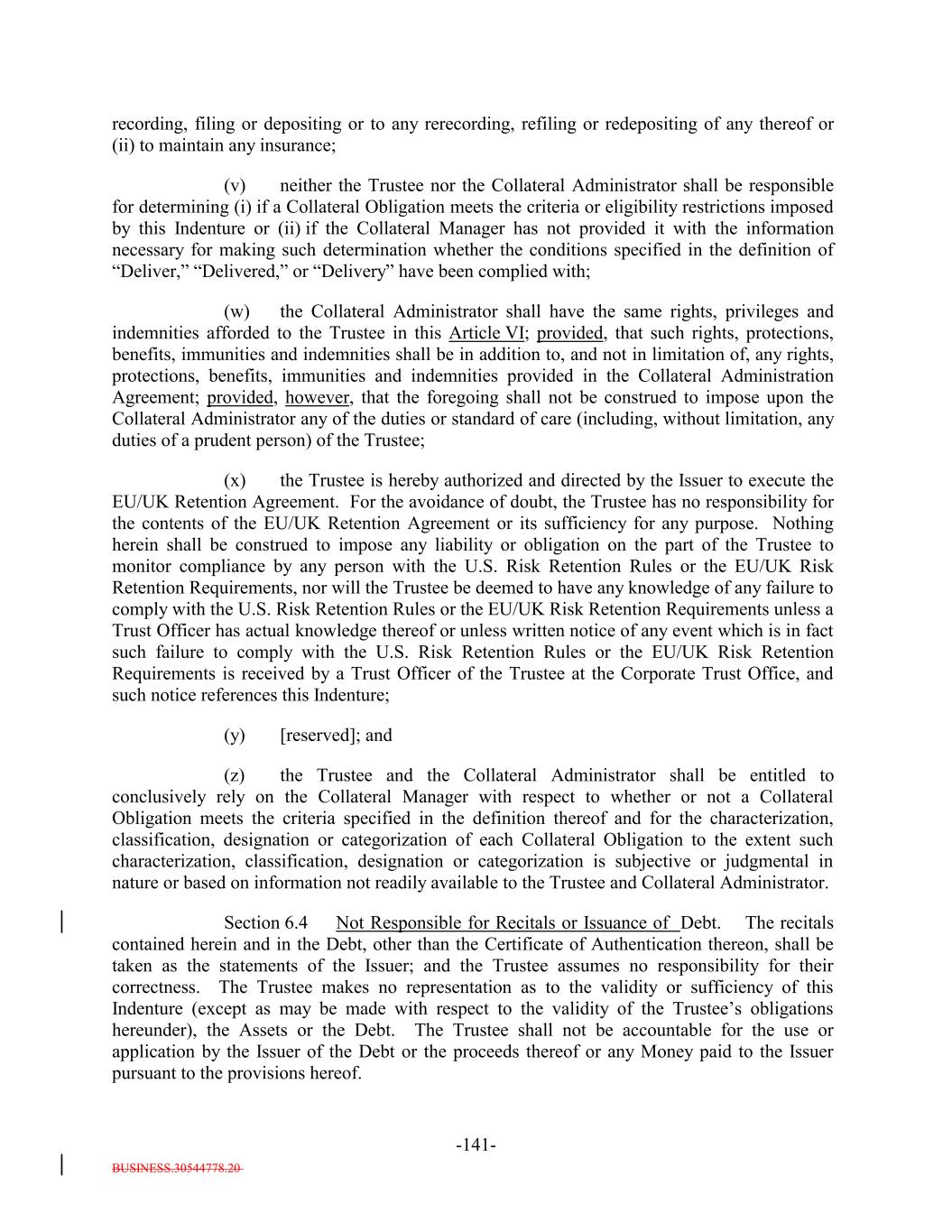 BUSINESS.30544778.20 -5- any prior Payment Date in accordance with the Priority of Payments) and payable in the following order by the Issuer: first, to the Trustee pursuant to Section 6.7 and the other provisions of this Indenture, second, to the Bank, U.S. Bank National Association and any of their respective Affiliates in any of their respective other capacities under the Transaction Documents, third, on a pro rata basis, the following amounts (excluding indemnities) to the following parties: (i) the Independent Review Party, if any, Independent accountants (including tax accountants), agents (other than the Collateral Manager) and counsel of the Issuer for fees and expenses; (ii) S&P for fees and expenses (including any annual fee, amendment fees and surveillance fees) in connection with any rating of the Debt or in connection with the rating of (or provision of credit estimates in respect of) any Collateral Obligations; (iii) the Collateral Manager under this Indenture and the Collateral Management Agreement, including without limitation reasonable expenses of the Collateral Manager (including fees for its accountants, agents and counsel) incurred in connection with the purchase or sale of any Collateral Obligations, any other expenses incurred in connection with the Collateral Obligations and any other amounts payable pursuant to the Collateral Management Agreement but excluding the Aggregate Collateral Management Fees; (iv) the independent manager of the Issuer for fees and expenses; (v) any person in respect of any governmental fee, charge or tax; and (vi) any other Person in respect of any other fees or expenses permitted under this Indenture and the documents delivered pursuant to or in connection with this Indenture (including without limitation the payment of all legal and other fees and expenses incurred in connection with the purchase or sale of any Collateral Obligations and any other expenses incurred in connection with the Collateral Obligations) and the Debt, including but not limited to, amounts owed to the Issuer pursuant to this Indenture, any amounts due in respect of the listing of the Debt on any stock exchange or trading system, any Re-Pricing, redemption, Refinancing or additional issuance of Debt; fourth, on a pro rata basis to any Person (including the Collateral Manager) in connection with satisfying the EU/UK Risk Retention Requirements and the EU Transparency Requirements in connection with the transaction contemplated hereunder, including any costs or fees related to additional due diligence or reporting requirements; and and fourthfifth, on a pro rata basis, indemnities payable to any Person pursuant to any Transaction Document or the Warehouse Agreement; provided that, for the avoidance of doubt, (x) amounts due in respect of actions taken on or before the ClosingRefinancing Date (other than indemnities payable under the Warehouse Agreement or any amounts payable with respect to actions taken underowing to the Bank or any Affiliate in any of their respective capacities under any Transaction Document or the Posting Agent Letter Agreement) shall not be payable as Administrative Expenses but shall be payable only from the Expense Reserve Account pursuant