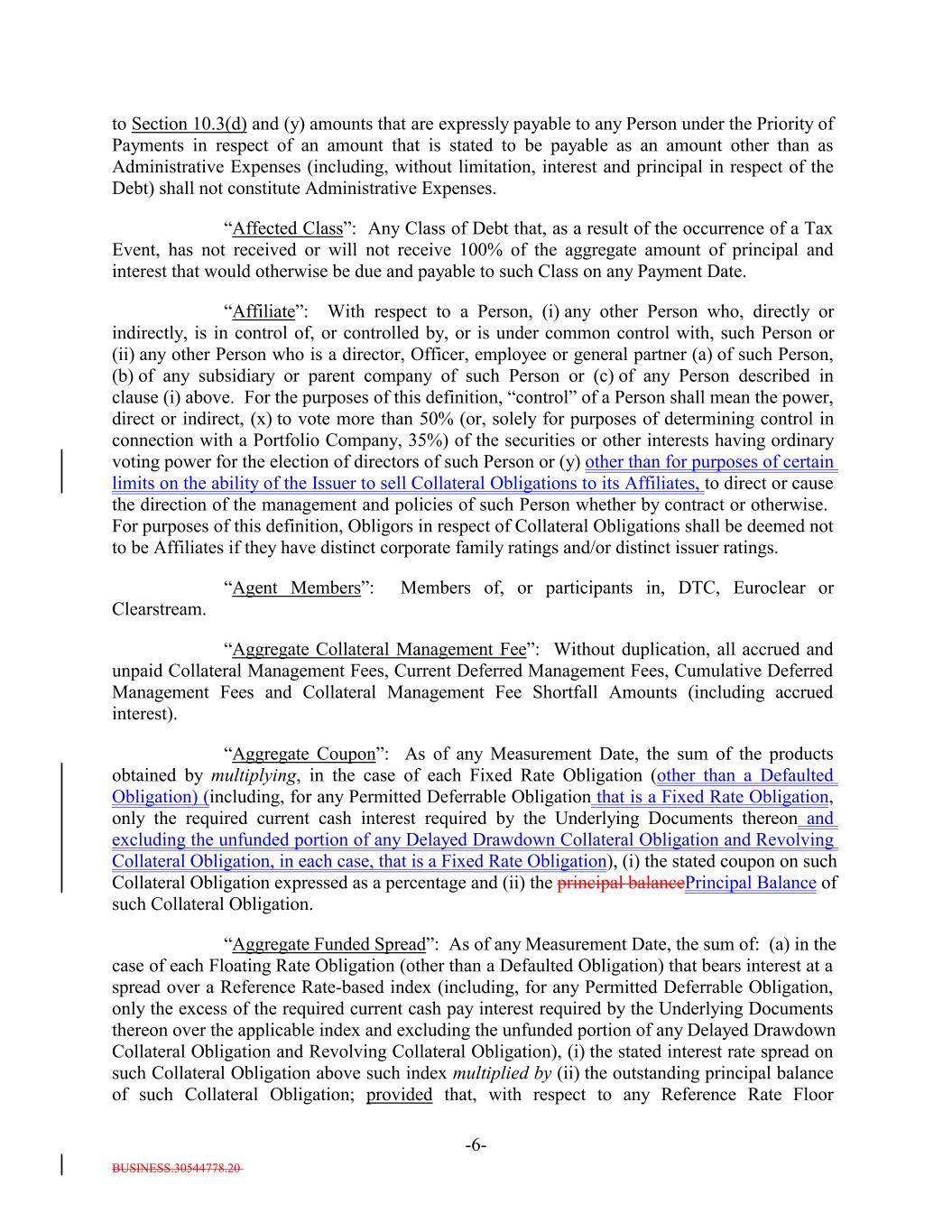 BUSINESS.30544778.20 -6- to Section 10.3(d) and (y) amounts that are expressly payable to any Person under the Priority of Payments in respect of an amount that is stated to be payable as an amount other than as Administrative Expenses (including, without limitation, interest and principal in respect of the Debt) shall not constitute Administrative Expenses. “Affected Class”: Any Class of Debt that, as a result of the occurrence of a Tax Event, has not received or will not receive 100% of the aggregate amount of principal and interest that would otherwise be due and payable to such Class on any Payment Date. “Affiliate”: With respect to a Person, (i) any other Person who, directly or indirectly, is in control of, or controlled by, or is under common control with, such Person or (ii) any other Person who is a director, Officer, employee or general partner (a) of such Person, (b) of any subsidiary or parent company of such Person or (c) of any Person described in clause (i) above. For the purposes of this definition, “control” of a Person shall mean the power, direct or indirect, (x) to vote more than 50% (or, solely for purposes of determining control in connection with a Portfolio Company, 35%) of the securities or other interests having ordinary voting power for the election of directors of such Person or (y) other than for purposes of certain limits on the ability of the Issuer to sell Collateral Obligations to its Affiliates, to direct or cause the direction of the management and policies of such Person whether by contract or otherwise. For purposes of this definition, Obligors in respect of Collateral Obligations shall be deemed not to be Affiliates if they have distinct corporate family ratings and/or distinct issuer ratings. “Agent Members”: Members of, or participants in, DTC, Euroclear or Clearstream. “Aggregate Collateral Management Fee”: Without duplication, all accrued and unpaid Collateral Management Fees, Current Deferred Management Fees, Cumulative Deferred Management Fees and Collateral Management Fee Shortfall Amounts (including accrued interest). “Aggregate Coupon”: As of any Measurement Date, the sum of the products obtained by multiplying, in the case of each Fixed Rate Obligation (other than a Defaulted Obligation) (including, for any Permitted Deferrable Obligation that is a Fixed Rate Obligation, only the required current cash interest required by the Underlying Documents thereon and excluding the unfunded portion of any Delayed Drawdown Collateral Obligation and Revolving Collateral Obligation, in each case, that is a Fixed Rate Obligation), (i) the stated coupon on such Collateral Obligation expressed as a percentage and (ii) the principal balancePrincipal Balance of such Collateral Obligation. “Aggregate Funded Spread”: As of any Measurement Date, the sum of: (a) in the case of each Floating Rate Obligation (other than a Defaulted Obligation) that bears interest at a spread over a Reference Rate-based index (including, for any Permitted Deferrable Obligation, only the excess of the required current cash pay interest required by the Underlying Documents thereon over the applicable index and excluding the unfunded portion of any Delayed Drawdown Collateral Obligation and Revolving Collateral Obligation), (i) the stated interest rate spread on such Collateral Obligation above such index multiplied by (ii) the outstanding principal balance of such Collateral Obligation; provided that, with respect to any Reference Rate Floor