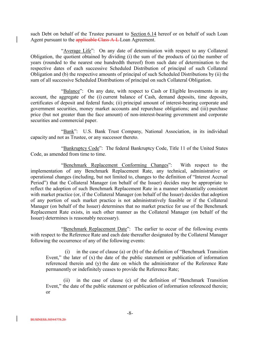 BUSINESS.30544778.20 -8- such Debt on behalf of the Trustee pursuant to Section 6.14 hereof or on behalf of such Loan Agent pursuant to the applicable Class A-L Loan Agreement. “Average Life”: On any date of determination with respect to any Collateral Obligation, the quotient obtained by dividing (i) the sum of the products of (a) the number of years (rounded to the nearest one hundredth thereof) from such date of determination to the respective dates of each successive Scheduled Distribution of principal of such Collateral Obligation and (b) the respective amounts of principal of such Scheduled Distributions by (ii) the sum of all successive Scheduled Distributions of principal on such Collateral Obligation. “Balance”: On any date, with respect to Cash or Eligible Investments in any account, the aggregate of the (i) current balance of Cash, demand deposits, time deposits, certificates of deposit and federal funds; (ii) principal amount of interest-bearing corporate and government securities, money market accounts and repurchase obligations; and (iii) purchase price (but not greater than the face amount) of non-interest-bearing government and corporate securities and commercial paper. “Bank”: U.S. Bank Trust Company, National Association, in its individual capacity and not as Trustee, or any successor thereto. “Bankruptcy Code”: The federal Bankruptcy Code, Title 11 of the United States Code, as amended from time to time. “Benchmark Replacement Conforming Changes”: With respect to the implementation of any Benchmark Replacement Rate, any technical, administrative or operational changes (including, but not limited to, changes to the definition of “Interest Accrual Period”) that the Collateral Manager (on behalf of the Issuer) decides may be appropriate to reflect the adoption of such Benchmark Replacement Rate in a manner substantially consistent with market practice (or, if the Collateral Manager (on behalf of the Issuer) decides that adoption of any portion of such market practice is not administratively feasible or if the Collateral Manager (on behalf of the Issuer) determines that no market practice for use of the Benchmark Replacement Rate exists, in such other manner as the Collateral Manager (on behalf of the Issuer) determines is reasonably necessary). “Benchmark Replacement Date”: The earlier to occur of the following events with respect to the Reference Rate and each date thereafter designated by the Collateral Manager following the occurrence of any of the following events: (i) in the case of clause (a) or (b) of the definition of “Benchmark Transition Event,” the later of (x) the date of the public statement or publication of information referenced therein and (y) the date on which the administrator of the Reference Rate permanently or indefinitely ceases to provide the Reference Rate; (ii) in the case of clause (c) of the definition of “Benchmark Transition Event,” the date of the public statement or publication of information referenced therein; or