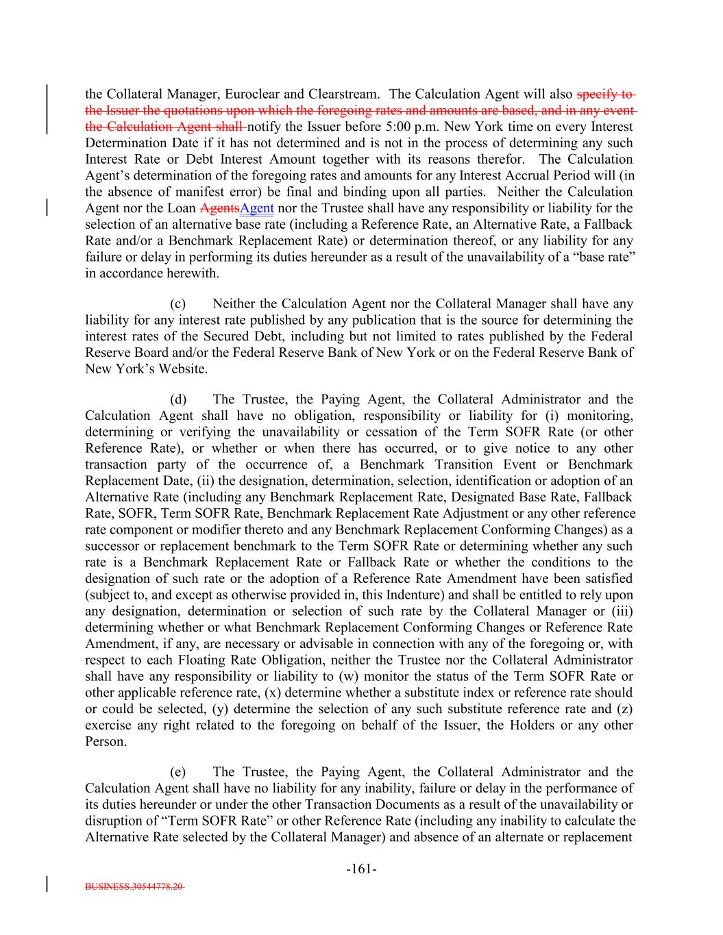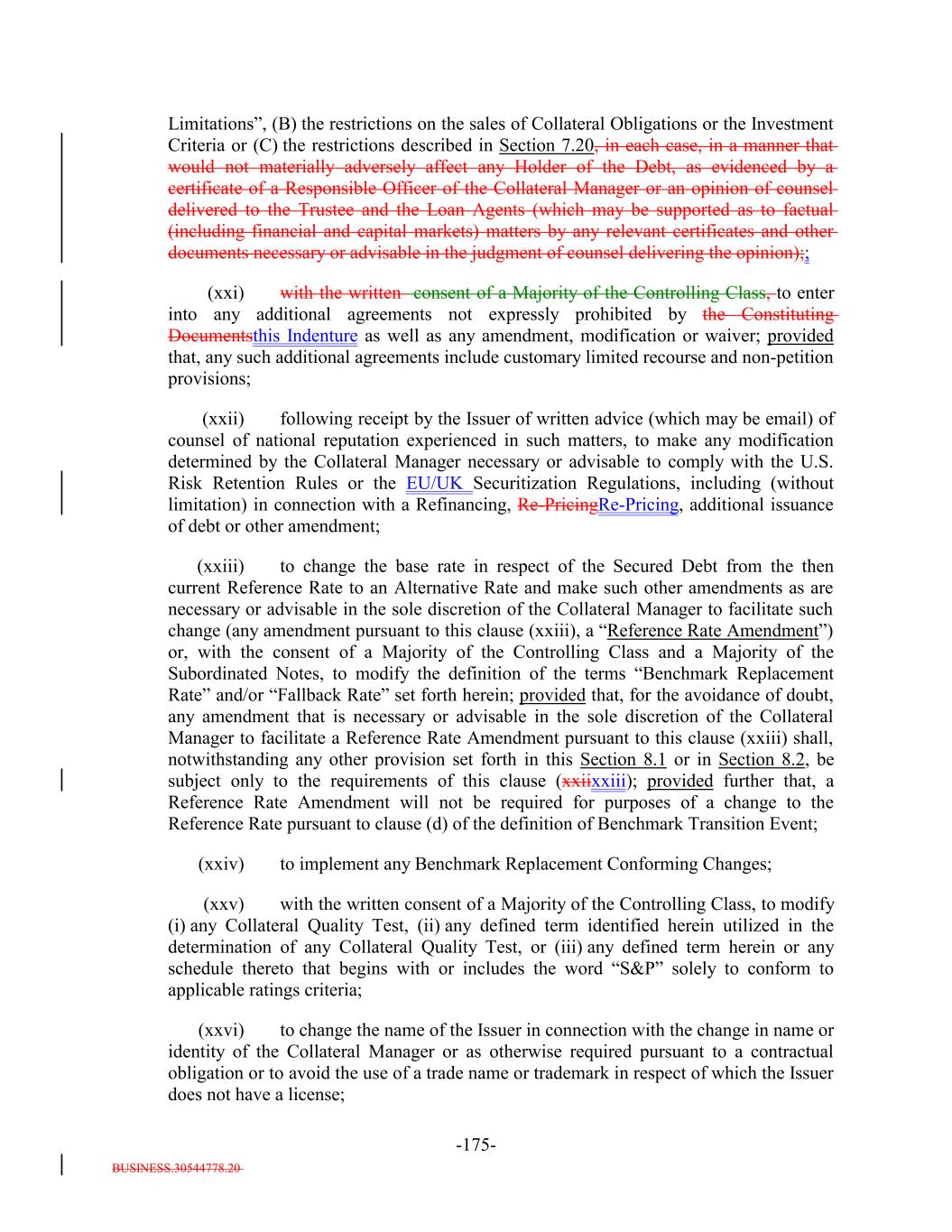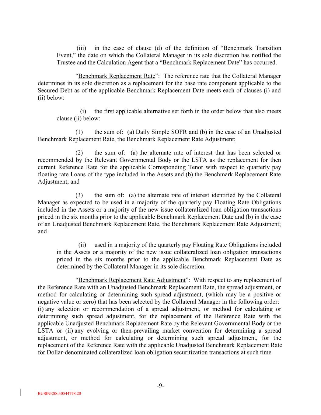BUSINESS.30544778.20 -9- (iii) in the case of clause (d) of the definition of “Benchmark Transition Event,” the date on which the Collateral Manager in its sole discretion has notified the Trustee and the Calculation Agent that a “Benchmark Replacement Date” has occurred. “Benchmark Replacement Rate”: The reference rate that the Collateral Manager determines in its sole discretion as a replacement for the base rate component applicable to the Secured Debt as of the applicable Benchmark Replacement Date meets each of clauses (i) and (ii) below: (i) the first applicable alternative set forth in the order below that also meets clause (ii) below: (1) the sum of: (a) Daily Simple SOFR and (b) in the case of an Unadjusted Benchmark Replacement Rate, the Benchmark Replacement Rate Adjustment; (2) the sum of: (a) the alternate rate of interest that has been selected or recommended by the Relevant Governmental Body or the LSTA as the replacement for then current Reference Rate for the applicable Corresponding Tenor with respect to quarterly pay floating rate Loans of the type included in the Assets and (b) the Benchmark Replacement Rate Adjustment; and (3) the sum of: (a) the alternate rate of interest identified by the Collateral Manager as expected to be used in a majority of the quarterly pay Floating Rate Obligations included in the Assets or a majority of the new issue collateralized loan obligation transactions priced in the six months prior to the applicable Benchmark Replacement Date and (b) in the case of an Unadjusted Benchmark Replacement Rate, the Benchmark Replacement Rate Adjustment; and (ii) used in a majority of the quarterly pay Floating Rate Obligations included in the Assets or a majority of the new issue collateralized loan obligation transactions priced in the six months prior to the applicable Benchmark Replacement Date as determined by the Collateral Manager in its sole discretion. “Benchmark Replacement Rate Adjustment”: With respect to any replacement of the Reference Rate with an Unadjusted Benchmark Replacement Rate, the spread adjustment, or method for calculating or determining such spread adjustment, (which may be a positive or negative value or zero) that has been selected by the Collateral Manager in the following order: (i) any selection or recommendation of a spread adjustment, or method for calculating or determining such spread adjustment, for the replacement of the Reference Rate with the applicable Unadjusted Benchmark Replacement Rate by the Relevant Governmental Body or the LSTA or (ii) any evolving or then-prevailing market convention for determining a spread adjustment, or method for calculating or determining such spread adjustment, for the replacement of the Reference Rate with the applicable Unadjusted Benchmark Replacement Rate for Dollar-denominated collateralized loan obligation securitization transactions at such time.