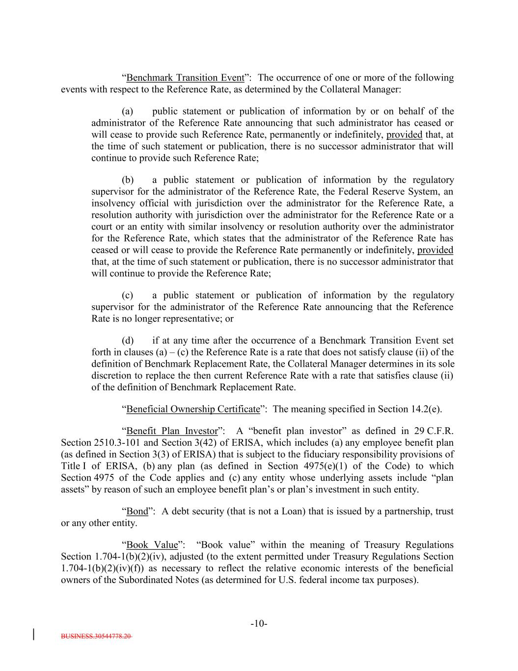 BUSINESS.30544778.20 -10- “Benchmark Transition Event”: The occurrence of one or more of the following events with respect to the Reference Rate, as determined by the Collateral Manager: (a) public statement or publication of information by or on behalf of the administrator of the Reference Rate announcing that such administrator has ceased or will cease to provide such Reference Rate, permanently or indefinitely, provided that, at the time of such statement or publication, there is no successor administrator that will continue to provide such Reference Rate; (b) a public statement or publication of information by the regulatory supervisor for the administrator of the Reference Rate, the Federal Reserve System, an insolvency official with jurisdiction over the administrator for the Reference Rate, a resolution authority with jurisdiction over the administrator for the Reference Rate or a court or an entity with similar insolvency or resolution authority over the administrator for the Reference Rate, which states that the administrator of the Reference Rate has ceased or will cease to provide the Reference Rate permanently or indefinitely, provided that, at the time of such statement or publication, there is no successor administrator that will continue to provide the Reference Rate; (c) a public statement or publication of information by the regulatory supervisor for the administrator of the Reference Rate announcing that the Reference Rate is no longer representative; or (d) if at any time after the occurrence of a Benchmark Transition Event set forth in clauses (a) – (c) the Reference Rate is a rate that does not satisfy clause (ii) of the definition of Benchmark Replacement Rate, the Collateral Manager determines in its sole discretion to replace the then current Reference Rate with a rate that satisfies clause (ii) of the definition of Benchmark Replacement Rate. “Beneficial Ownership Certificate”: The meaning specified in Section 14.2(e). “Benefit Plan Investor”: A “benefit plan investor” as defined in 29 C.F.R. Section 2510.3-101 and Section 3(42) of ERISA, which includes (a) any employee benefit plan (as defined in Section 3(3) of ERISA) that is subject to the fiduciary responsibility provisions of Title I of ERISA, (b) any plan (as defined in Section 4975(e)(1) of the Code) to which Section 4975 of the Code applies and (c) any entity whose underlying assets include “plan assets” by reason of such an employee benefit plan’s or plan’s investment in such entity. “Bond”: A debt security (that is not a Loan) that is issued by a partnership, trust or any other entity. “Book Value”: “Book value” within the meaning of Treasury Regulations Section 1.704-1(b)(2)(iv), adjusted (to the extent permitted under Treasury Regulations Section 1.704-1(b)(2)(iv)(f)) as necessary to reflect the relative economic interests of the beneficial owners of the Subordinated Notes (as determined for U.S. federal income tax purposes).