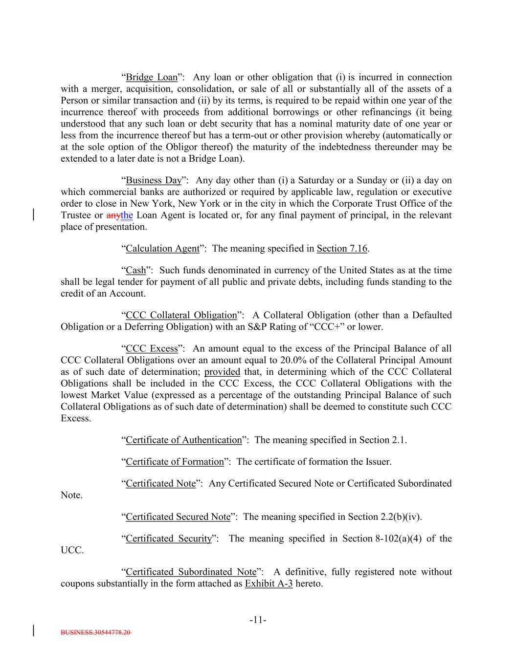 BUSINESS.30544778.20 -11- “Bridge Loan”: Any loan or other obligation that (i) is incurred in connection with a merger, acquisition, consolidation, or sale of all or substantially all of the assets of a Person or similar transaction and (ii) by its terms, is required to be repaid within one year of the incurrence thereof with proceeds from additional borrowings or other refinancings (it being understood that any such loan or debt security that has a nominal maturity date of one year or less from the incurrence thereof but has a term-out or other provision whereby (automatically or at the sole option of the Obligor thereof) the maturity of the indebtedness thereunder may be extended to a later date is not a Bridge Loan). “Business Day”: Any day other than (i) a Saturday or a Sunday or (ii) a day on which commercial banks are authorized or required by applicable law, regulation or executive order to close in New York, New York or in the city in which the Corporate Trust Office of the Trustee or anythe Loan Agent is located or, for any final payment of principal, in the relevant place of presentation. “Calculation Agent”: The meaning specified in Section 7.16. “Cash”: Such funds denominated in currency of the United States as at the time shall be legal tender for payment of all public and private debts, including funds standing to the credit of an Account. “CCC Collateral Obligation”: A Collateral Obligation (other than a Defaulted Obligation or a Deferring Obligation) with an S&P Rating of “CCC+” or lower. “CCC Excess”: An amount equal to the excess of the Principal Balance of all CCC Collateral Obligations over an amount equal to 20.0% of the Collateral Principal Amount as of such date of determination; provided that, in determining which of the CCC Collateral Obligations shall be included in the CCC Excess, the CCC Collateral Obligations with the lowest Market Value (expressed as a percentage of the outstanding Principal Balance of such Collateral Obligations as of such date of determination) shall be deemed to constitute such CCC Excess. “Certificate of Authentication”: The meaning specified in Section 2.1. “Certificate of Formation”: The certificate of formation the Issuer. “Certificated Note”: Any Certificated Secured Note or Certificated Subordinated Note. “Certificated Secured Note”: The meaning specified in Section 2.2(b)(iv). “Certificated Security”: The meaning specified in Section 8-102(a)(4) of the UCC. “Certificated Subordinated Note”: A definitive, fully registered note without coupons substantially in the form attached as Exhibit A-3 hereto.