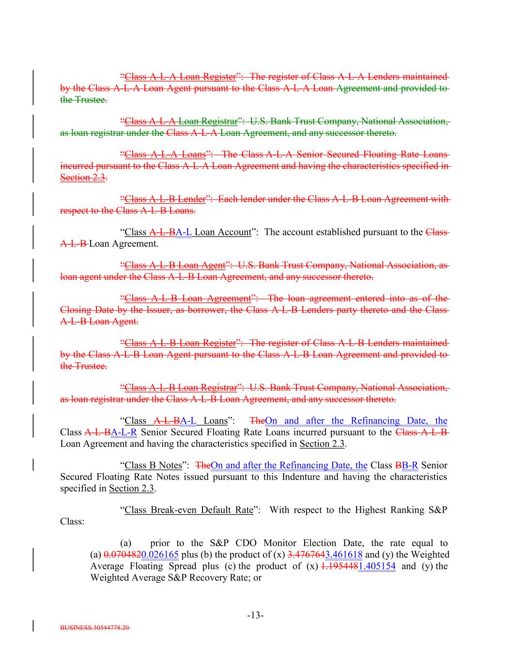 BUSINESS.30544778.20 -13- “Class A-L-A Loan Register”: The register of Class A-L-A Lenders maintained by the Class A-L-A Loan Agent pursuant to the Class A-L-A Loan Agreement and provided to the Trustee. “Class A-L-A Loan Registrar”: U.S. Bank Trust Company, National Association, as loan registrar under the Class A-L-A Loan Agreement, and any successor thereto. “Class A-L-A Loans”: The Class A-L-A Senior Secured Floating Rate Loans incurred pursuant to the Class A-L-A Loan Agreement and having the characteristics specified in Section 2.3. “Class A-L-B Lender”: Each lender under the Class A-L-B Loan Agreement with respect to the Class A-L-B Loans. “Class A-L-BA-L Loan Account”: The account established pursuant to the Class A-L-B Loan Agreement. “Class A-L-B Loan Agent”: U.S. Bank Trust Company, National Association, as loan agent under the Class A-L-B Loan Agreement, and any successor thereto. “Class A-L-B Loan Agreement”: The loan agreement entered into as of the Closing Date by the Issuer, as borrower, the Class A-L-B Lenders party thereto and the Class A-L-B Loan Agent. “Class A-L-B Loan Register”: The register of Class A-L-B Lenders maintained by the Class A-L-B Loan Agent pursuant to the Class A-L-B Loan Agreement and provided to the Trustee. “Class A-L-B Loan Registrar”: U.S. Bank Trust Company, National Association, as loan registrar under the Class A-L-B Loan Agreement, and any successor thereto. “Class A-L-BA-L Loans”: TheOn and after the Refinancing Date, the Class A-L-BA-L-R Senior Secured Floating Rate Loans incurred pursuant to the Class A-L-B Loan Agreement and having the characteristics specified in Section 2.3. “Class B Notes”: TheOn and after the Refinancing Date, the Class BB-R Senior Secured Floating Rate Notes issued pursuant to this Indenture and having the characteristics specified in Section 2.3. “Class Break-even Default Rate”: With respect to the Highest Ranking S&P Class: (a) prior to the S&P CDO Monitor Election Date, the rate equal to (a) 0.0704820.026165 plus (b) the product of (x) 3.4767643.461618 and (y) the Weighted Average Floating Spread plus (c) the product of (x) 1.1954481.405154 and (y) the Weighted Average S&P Recovery Rate; or