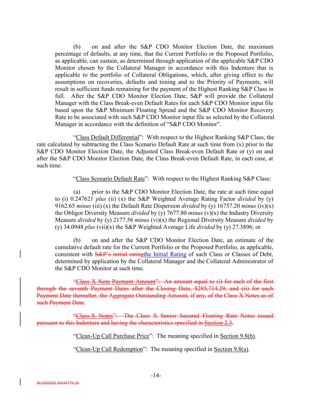 BUSINESS.30544778.20 -14- (b) on and after the S&P CDO Monitor Election Date, the maximum percentage of defaults, at any time, that the Current Portfolio or the Proposed Portfolio, as applicable, can sustain, as determined through application of the applicable S&P CDO Monitor chosen by the Collateral Manager in accordance with this Indenture that is applicable to the portfolio of Collateral Obligations, which, after giving effect to the assumptions on recoveries, defaults and timing and to the Priority of Payments, will result in sufficient funds remaining for the payment of the Highest Ranking S&P Class in full. After the S&P CDO Monitor Election Date, S&P will provide the Collateral Manager with the Class Break-even Default Rates for each S&P CDO Monitor input file based upon the S&P Minimum Floating Spread and the S&P CDO Monitor Recovery Rate to be associated with such S&P CDO Monitor input file as selected by the Collateral Manager in accordance with the definition of “S&P CDO Monitor”. “Class Default Differential”: With respect to the Highest Ranking S&P Class, the rate calculated by subtracting the Class Scenario Default Rate at such time from (x) prior to the S&P CDO Monitor Election Date, the Adjusted Class Break-even Default Rate or (y) on and after the S&P CDO Monitor Election Date, the Class Break-even Default Rate, in each case, at such time. “Class Scenario Default Rate”: With respect to the Highest Ranking S&P Class: (a) prior to the S&P CDO Monitor Election Date, the rate at such time equal to (i) 0.247621 plus (ii) (x) the S&P Weighted Average Rating Factor divided by (y) 9162.65 minus (iii) (x) the Default Rate Dispersion divided by (y) 16757.20 minus (iv)(x) the Obligor Diversity Measure divided by (y) 7677.80 minus (v)(x) the Industry Diversity Measure divided by (y) 2177.56 minus (vi)(x) the Regional Diversity Measure divided by (y) 34.0948 plus (vii)(x) the S&P Weighted Average Life divided by (y) 27.3896; or (b) on and after the S&P CDO Monitor Election Date, an estimate of the cumulative default rate for the Current Portfolio or the Proposed Portfolio, as applicable, consistent with S&P’s initial ratingthe Initial Rating of such Class or Classes of Debt, determined by application by the Collateral Manager and the Collateral Administrator of the S&P CDO Monitor at such time. “Class X Note Payment Amount”: An amount equal to (i) for each of the first through the seventh Payment Dates after the Closing Date, $285,714.29, and (ii) for each Payment Date thereafter, the Aggregate Outstanding Amount, if any, of the Class X Notes as of such Payment Date. “Class X Notes”: The Class X Senior Secured Floating Rate Notes issued pursuant to this Indenture and having the characteristics specified in Section 2.3. “Clean-Up Call Purchase Price”: The meaning specified in Section 9.8(b). “Clean-Up Call Redemption”: The meaning specified in Section 9.8(a).