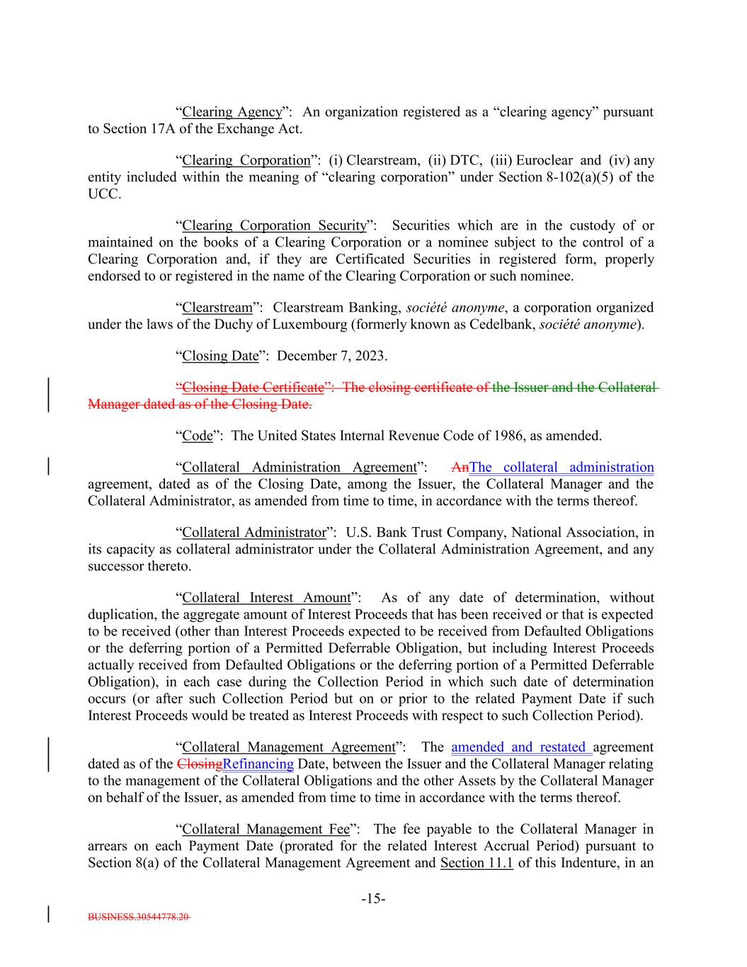 BUSINESS.30544778.20 -15- “Clearing Agency”: An organization registered as a “clearing agency” pursuant to Section 17A of the Exchange Act. “Clearing Corporation”: (i) Clearstream, (ii) DTC, (iii) Euroclear and (iv) any entity included within the meaning of “clearing corporation” under Section 8-102(a)(5) of the UCC. “Clearing Corporation Security”: Securities which are in the custody of or maintained on the books of a Clearing Corporation or a nominee subject to the control of a Clearing Corporation and, if they are Certificated Securities in registered form, properly endorsed to or registered in the name of the Clearing Corporation or such nominee. “Clearstream”: Clearstream Banking, société anonyme, a corporation organized under the laws of the Duchy of Luxembourg (formerly known as Cedelbank, société anonyme). “Closing Date”: December 7, 2023. “Closing Date Certificate”: The closing certificate of the Issuer and the Collateral Manager dated as of the Closing Date. “Code”: The United States Internal Revenue Code of 1986, as amended. “Collateral Administration Agreement”: AnThe collateral administration agreement, dated as of the Closing Date, among the Issuer, the Collateral Manager and the Collateral Administrator, as amended from time to time, in accordance with the terms thereof. “Collateral Administrator”: U.S. Bank Trust Company, National Association, in its capacity as collateral administrator under the Collateral Administration Agreement, and any successor thereto. “Collateral Interest Amount”: As of any date of determination, without duplication, the aggregate amount of Interest Proceeds that has been received or that is expected to be received (other than Interest Proceeds expected to be received from Defaulted Obligations or the deferring portion of a Permitted Deferrable Obligation, but including Interest Proceeds actually received from Defaulted Obligations or the deferring portion of a Permitted Deferrable Obligation), in each case during the Collection Period in which such date of determination occurs (or after such Collection Period but on or prior to the related Payment Date if such Interest Proceeds would be treated as Interest Proceeds with respect to such Collection Period). “Collateral Management Agreement”: The amended and restated agreement dated as of the ClosingRefinancing Date, between the Issuer and the Collateral Manager relating to the management of the Collateral Obligations and the other Assets by the Collateral Manager on behalf of the Issuer, as amended from time to time in accordance with the terms thereof. “Collateral Management Fee”: The fee payable to the Collateral Manager in arrears on each Payment Date (prorated for the related Interest Accrual Period) pursuant to Section 8(a) of the Collateral Management Agreement and Section 11.1 of this Indenture, in an
