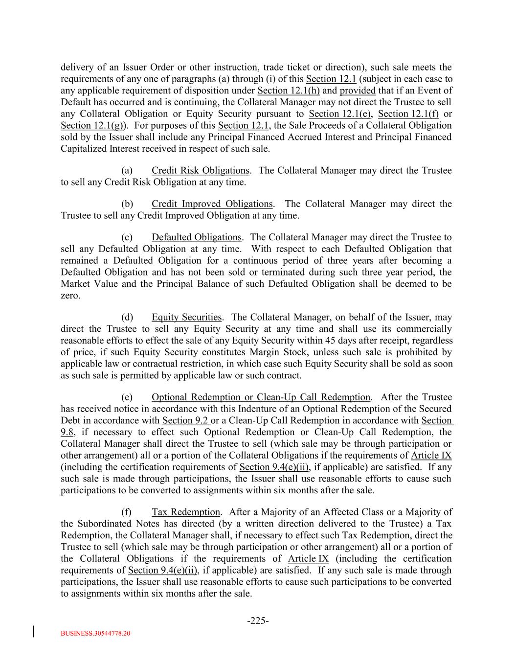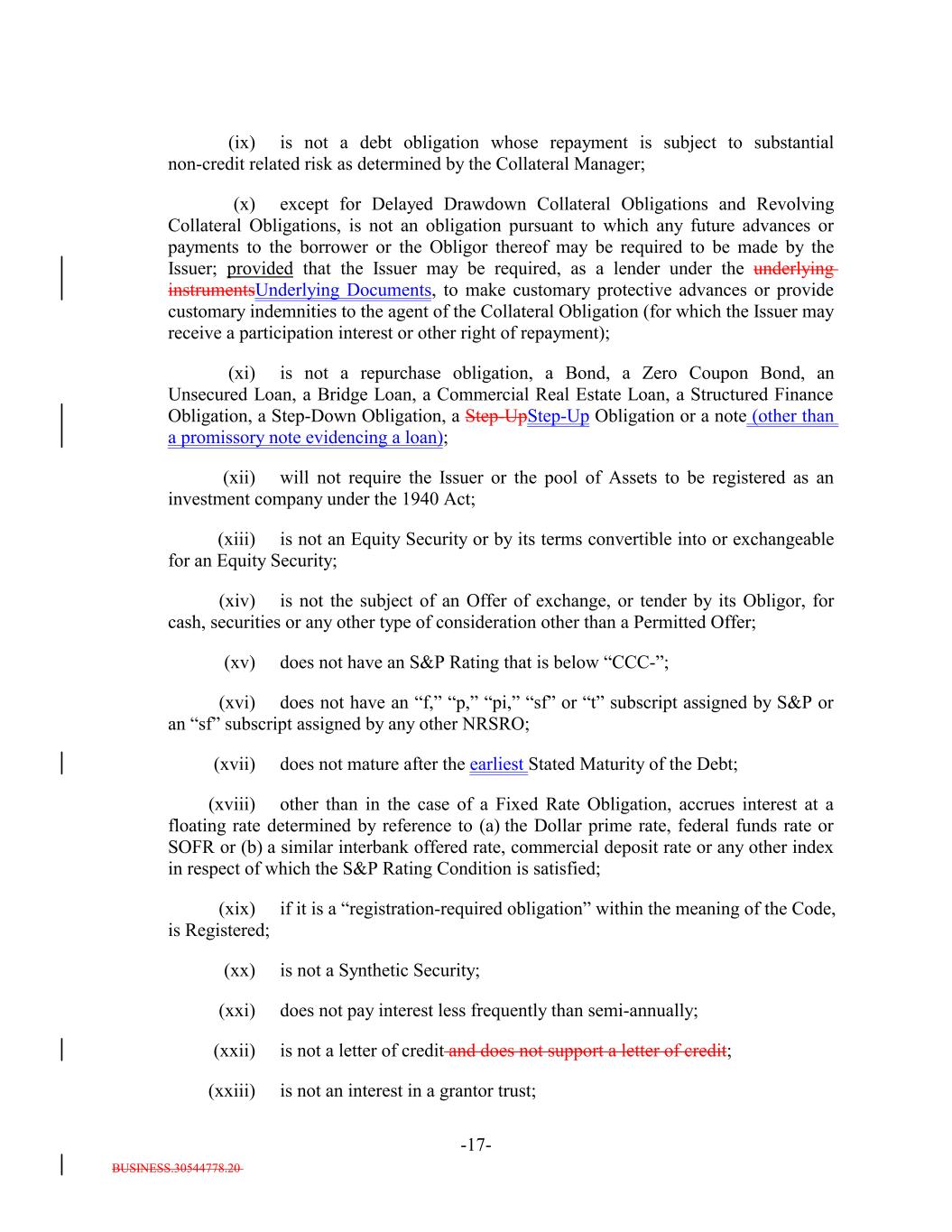 BUSINESS.30544778.20 -17- (ix) is not a debt obligation whose repayment is subject to substantial non-credit related risk as determined by the Collateral Manager; (x) except for Delayed Drawdown Collateral Obligations and Revolving Collateral Obligations, is not an obligation pursuant to which any future advances or payments to the borrower or the Obligor thereof may be required to be made by the Issuer; provided that the Issuer may be required, as a lender under the underlying instrumentsUnderlying Documents, to make customary protective advances or provide customary indemnities to the agent of the Collateral Obligation (for which the Issuer may receive a participation interest or other right of repayment); (xi) is not a repurchase obligation, a Bond, a Zero Coupon Bond, an Unsecured Loan, a Bridge Loan, a Commercial Real Estate Loan, a Structured Finance Obligation, a Step-Down Obligation, a Step-UpStep-Up Obligation or a note (other than a promissory note evidencing a loan); (xii) will not require the Issuer or the pool of Assets to be registered as an investment company under the 1940 Act; (xiii) is not an Equity Security or by its terms convertible into or exchangeable for an Equity Security; (xiv) is not the subject of an Offer of exchange, or tender by its Obligor, for cash, securities or any other type of consideration other than a Permitted Offer; (xv) does not have an S&P Rating that is below “CCC-”; (xvi) does not have an “f,” “p,” “pi,” “sf” or “t” subscript assigned by S&P or an “sf” subscript assigned by any other NRSRO; (xvii) does not mature after the earliest Stated Maturity of the Debt; (xviii) other than in the case of a Fixed Rate Obligation, accrues interest at a floating rate determined by reference to (a) the Dollar prime rate, federal funds rate or SOFR or (b) a similar interbank offered rate, commercial deposit rate or any other index in respect of which the S&P Rating Condition is satisfied; (xix) if it is a “registration-required obligation” within the meaning of the Code, is Registered; (xx) is not a Synthetic Security; (xxi) does not pay interest less frequently than semi-annually; (xxii) is not a letter of credit and does not support a letter of credit; (xxiii) is not an interest in a grantor trust;