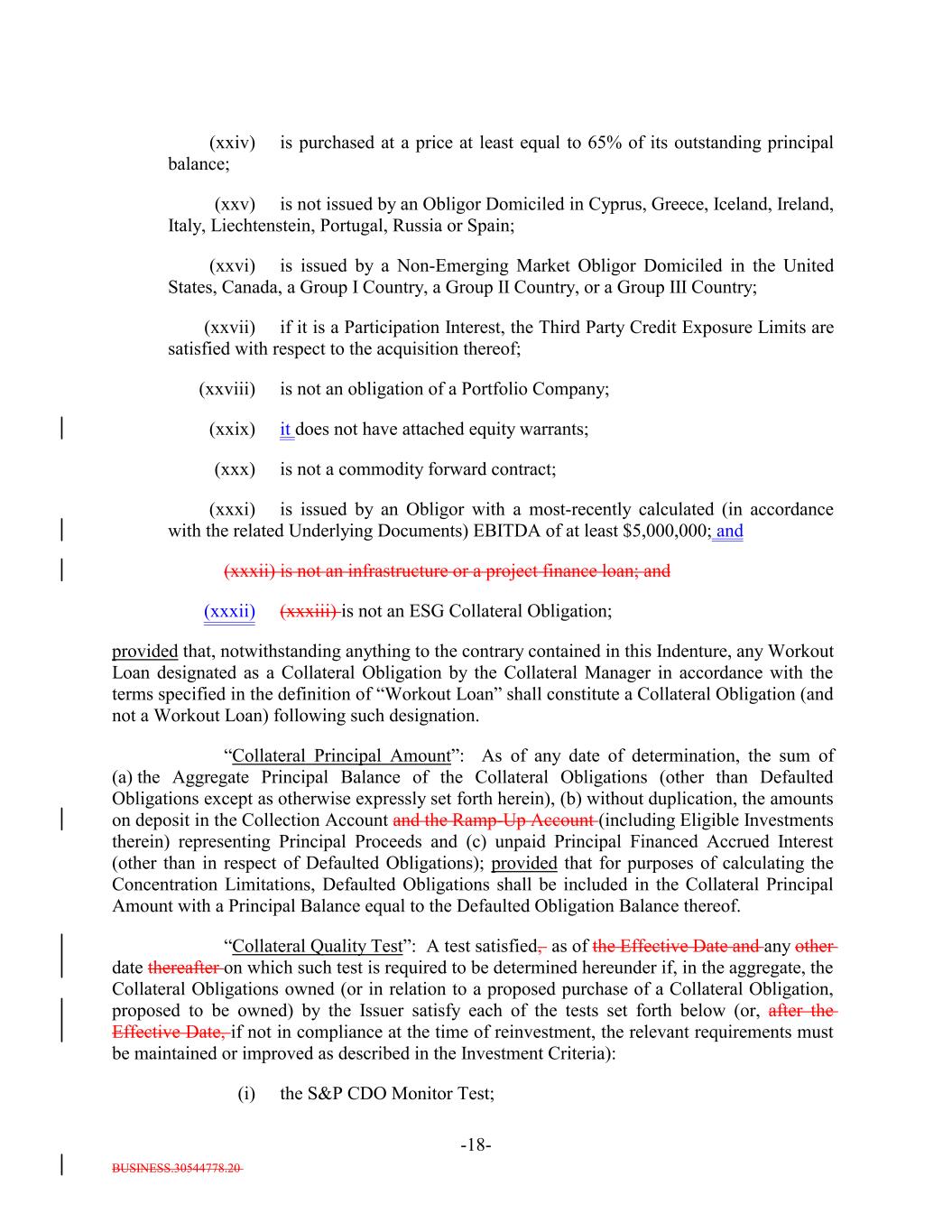 BUSINESS.30544778.20 -18- (xxiv) is purchased at a price at least equal to 65% of its outstanding principal balance; (xxv) is not issued by an Obligor Domiciled in Cyprus, Greece, Iceland, Ireland, Italy, Liechtenstein, Portugal, Russia or Spain; (xxvi) is issued by a Non-Emerging Market Obligor Domiciled in the United States, Canada, a Group I Country, a Group II Country, or a Group III Country; (xxvii) if it is a Participation Interest, the Third Party Credit Exposure Limits are satisfied with respect to the acquisition thereof; (xxviii) is not an obligation of a Portfolio Company; (xxix) it does not have attached equity warrants; (xxx) is not a commodity forward contract; (xxxi) is issued by an Obligor with a most-recently calculated (in accordance with the related Underlying Documents) EBITDA of at least $5,000,000; and (xxxii) is not an infrastructure or a project finance loan; and (xxxii) (xxxiii) is not an ESG Collateral Obligation; provided that, notwithstanding anything to the contrary contained in this Indenture, any Workout Loan designated as a Collateral Obligation by the Collateral Manager in accordance with the terms specified in the definition of “Workout Loan” shall constitute a Collateral Obligation (and not a Workout Loan) following such designation. “Collateral Principal Amount”: As of any date of determination, the sum of (a) the Aggregate Principal Balance of the Collateral Obligations (other than Defaulted Obligations except as otherwise expressly set forth herein), (b) without duplication, the amounts on deposit in the Collection Account and the Ramp-Up Account (including Eligible Investments therein) representing Principal Proceeds and (c) unpaid Principal Financed Accrued Interest (other than in respect of Defaulted Obligations); provided that for purposes of calculating the Concentration Limitations, Defaulted Obligations shall be included in the Collateral Principal Amount with a Principal Balance equal to the Defaulted Obligation Balance thereof. “Collateral Quality Test”: A test satisfied, as of the Effective Date and any other date thereafter on which such test is required to be determined hereunder if, in the aggregate, the Collateral Obligations owned (or in relation to a proposed purchase of a Collateral Obligation, proposed to be owned) by the Issuer satisfy each of the tests set forth below (or, after the Effective Date, if not in compliance at the time of reinvestment, the relevant requirements must be maintained or improved as described in the Investment Criteria): (i) the S&P CDO Monitor Test;