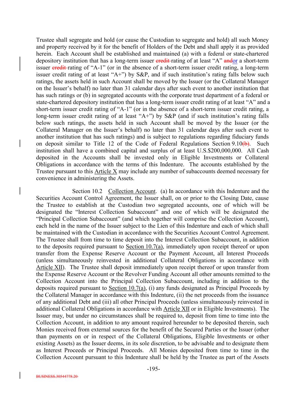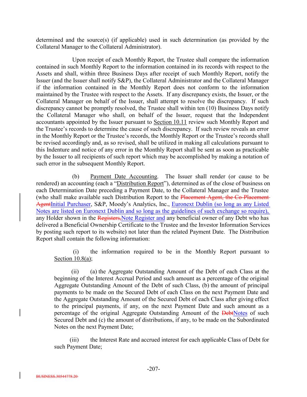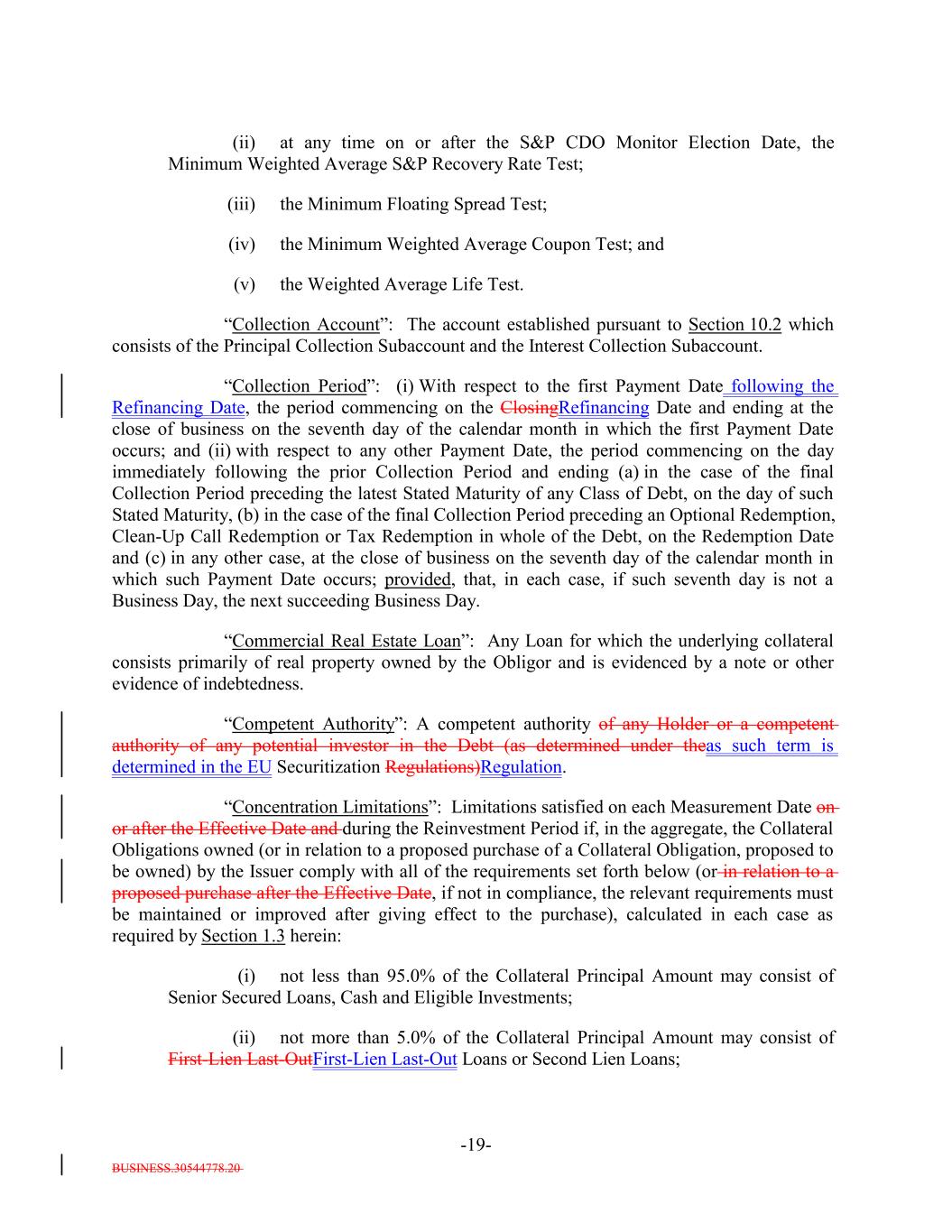 BUSINESS.30544778.20 -19- (ii) at any time on or after the S&P CDO Monitor Election Date, the Minimum Weighted Average S&P Recovery Rate Test; (iii) the Minimum Floating Spread Test; (iv) the Minimum Weighted Average Coupon Test; and (v) the Weighted Average Life Test. “Collection Account”: The account established pursuant to Section 10.2 which consists of the Principal Collection Subaccount and the Interest Collection Subaccount. “Collection Period”: (i) With respect to the first Payment Date following the Refinancing Date, the period commencing on the ClosingRefinancing Date and ending at the close of business on the seventh day of the calendar month in which the first Payment Date occurs; and (ii) with respect to any other Payment Date, the period commencing on the day immediately following the prior Collection Period and ending (a) in the case of the final Collection Period preceding the latest Stated Maturity of any Class of Debt, on the day of such Stated Maturity, (b) in the case of the final Collection Period preceding an Optional Redemption, Clean-Up Call Redemption or Tax Redemption in whole of the Debt, on the Redemption Date and (c) in any other case, at the close of business on the seventh day of the calendar month in which such Payment Date occurs; provided, that, in each case, if such seventh day is not a Business Day, the next succeeding Business Day. “Commercial Real Estate Loan”: Any Loan for which the underlying collateral consists primarily of real property owned by the Obligor and is evidenced by a note or other evidence of indebtedness. “Competent Authority”: A competent authority of any Holder or a competent authority of any potential investor in the Debt (as determined under theas such term is determined in the EU Securitization Regulations)Regulation. “Concentration Limitations”: Limitations satisfied on each Measurement Date on or after the Effective Date and during the Reinvestment Period if, in the aggregate, the Collateral Obligations owned (or in relation to a proposed purchase of a Collateral Obligation, proposed to be owned) by the Issuer comply with all of the requirements set forth below (or in relation to a proposed purchase after the Effective Date, if not in compliance, the relevant requirements must be maintained or improved after giving effect to the purchase), calculated in each case as required by Section 1.3 herein: (i) not less than 95.0% of the Collateral Principal Amount may consist of Senior Secured Loans, Cash and Eligible Investments; (ii) not more than 5.0% of the Collateral Principal Amount may consist of First-Lien Last-OutFirst-Lien Last-Out Loans or Second Lien Loans;