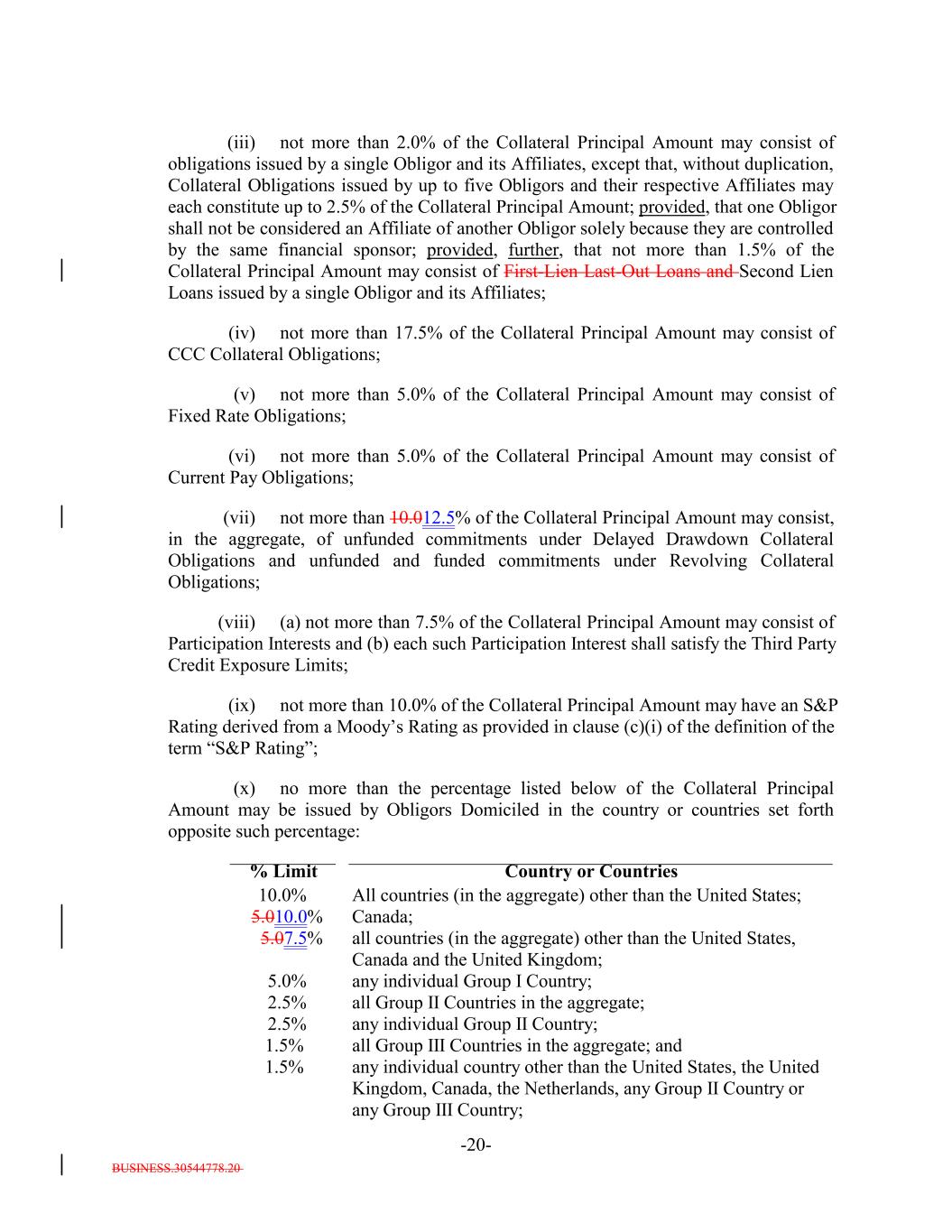 BUSINESS.30544778.20 -20- % Limit 2.5% all Group II Countries in the aggregate; 5.010.0% Country or Countries 2.5% Canada; any individual Group II Country; (iii) not more than 2.0% of the Collateral Principal Amount may consist of obligations issued by a single Obligor and its Affiliates, except that, without duplication, Collateral Obligations issued by up to five Obligors and their respective Affiliates may each constitute up to 2.5% of the Collateral Principal Amount; provided, that one Obligor shall not be considered an Affiliate of another Obligor solely because they are controlled by the same financial sponsor; provided, further, that not more than 1.5% of the Collateral Principal Amount may consist of First-Lien Last-Out Loans and Second Lien Loans issued by a single Obligor and its Affiliates; (iv) not more than 17.5% of the Collateral Principal Amount may consist of CCC Collateral Obligations; (v) not more than 5.0% of the Collateral Principal Amount may consist of Fixed Rate Obligations; (vi) not more than 5.0% of the Collateral Principal Amount may consist of Current Pay Obligations; (vii) not more than 10.012.5% of the Collateral Principal Amount may consist, in the aggregate, of unfunded commitments under Delayed Drawdown Collateral Obligations and unfunded and funded commitments under Revolving Collateral Obligations; (viii) (a) not more than 7.5% of the Collateral Principal Amount may consist of Participation Interests and (b) each such Participation Interest shall satisfy the Third Party Credit Exposure Limits; (ix) not more than 10.0% of the Collateral Principal Amount may have an S&P Rating derived from a Moody’s Rating as provided in clause (c)(i) of the definition of the term “S&P Rating”; (x) no more than the percentage listed below of the Collateral Principal Amount may be issued by Obligors Domiciled in the country or countries set forth opposite such percentage: 1.5% all Group III Countries in the aggregate; and 5.07.5% 1.5% all countries (in the aggregate) other than the United States, Canada and the United Kingdom; any individual country other than the United States, the United Kingdom, Canada, the Netherlands, any Group II Country or any Group III Country; 10.0% 5.0% All countries (in the aggregate) other than the United States; any individual Group I Country;