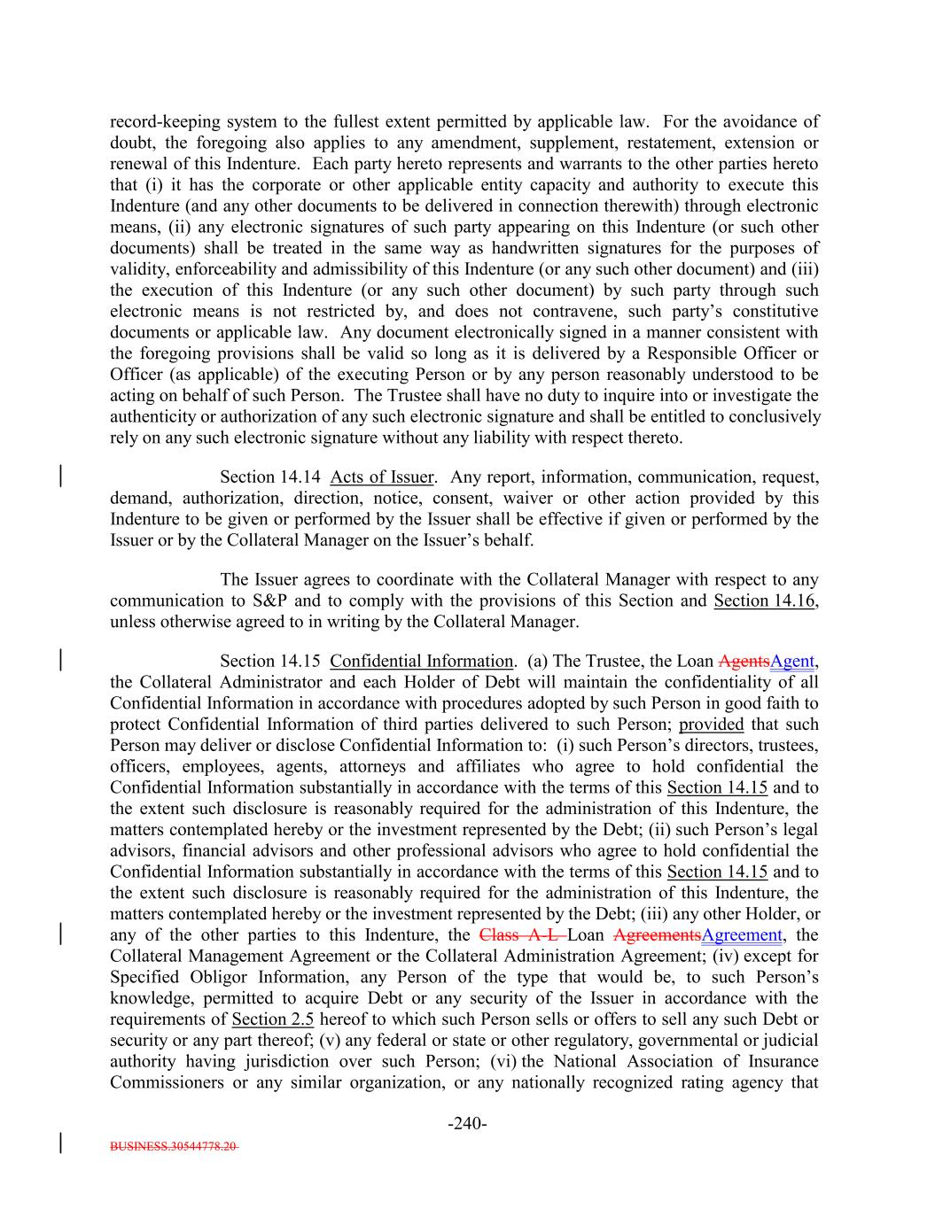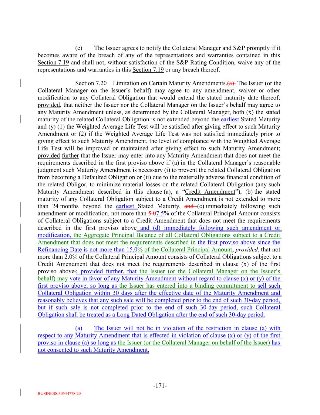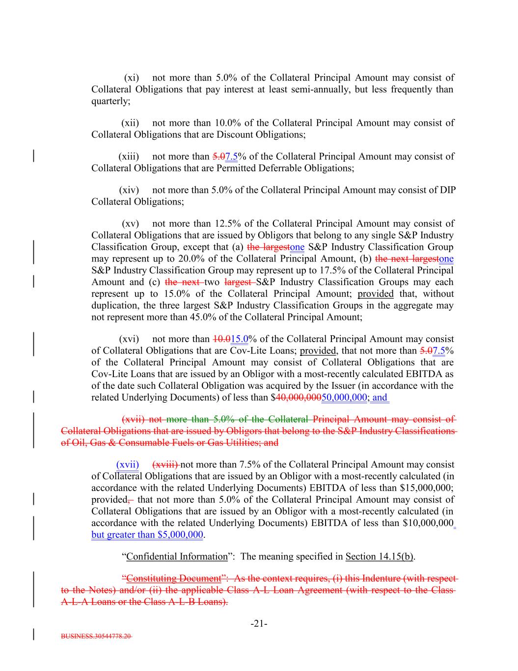BUSINESS.30544778.20 -21- (xi) not more than 5.0% of the Collateral Principal Amount may consist of Collateral Obligations that pay interest at least semi-annually, but less frequently than quarterly; (xii) not more than 10.0% of the Collateral Principal Amount may consist of Collateral Obligations that are Discount Obligations; (xiii) not more than 5.07.5% of the Collateral Principal Amount may consist of Collateral Obligations that are Permitted Deferrable Obligations; (xiv) not more than 5.0% of the Collateral Principal Amount may consist of DIP Collateral Obligations; (xv) not more than 12.5% of the Collateral Principal Amount may consist of Collateral Obligations that are issued by Obligors that belong to any single S&P Industry Classification Group, except that (a) the largestone S&P Industry Classification Group may represent up to 20.0% of the Collateral Principal Amount, (b) the next largestone S&P Industry Classification Group may represent up to 17.5% of the Collateral Principal Amount and (c) the next two largest S&P Industry Classification Groups may each represent up to 15.0% of the Collateral Principal Amount; provided that, without duplication, the three largest S&P Industry Classification Groups in the aggregate may not represent more than 45.0% of the Collateral Principal Amount; (xvi) not more than 10.015.0% of the Collateral Principal Amount may consist of Collateral Obligations that are Cov-Lite Loans; provided, that not more than 5.07.5% of the Collateral Principal Amount may consist of Collateral Obligations that are Cov-Lite Loans that are issued by an Obligor with a most-recently calculated EBITDA as of the date such Collateral Obligation was acquired by the Issuer (in accordance with the related Underlying Documents) of less than $40,000,00050,000,000; and (xvii) not more than 5.0% of the Collateral Principal Amount may consist of Collateral Obligations that are issued by Obligors that belong to the S&P Industry Classifications of Oil, Gas & Consumable Fuels or Gas Utilities; and (xvii) (xviii) not more than 7.5% of the Collateral Principal Amount may consist of Collateral Obligations that are issued by an Obligor with a most-recently calculated (in accordance with the related Underlying Documents) EBITDA of less than $15,000,000; provided, that not more than 5.0% of the Collateral Principal Amount may consist of Collateral Obligations that are issued by an Obligor with a most-recently calculated (in accordance with the related Underlying Documents) EBITDA of less than $10,000,000 but greater than $5,000,000. “Confidential Information”: The meaning specified in Section 14.15(b). “Constituting Document”: As the context requires, (i) this Indenture (with respect to the Notes) and/or (ii) the applicable Class A-L Loan Agreement (with respect to the Class A-L-A Loans or the Class A-L-B Loans).