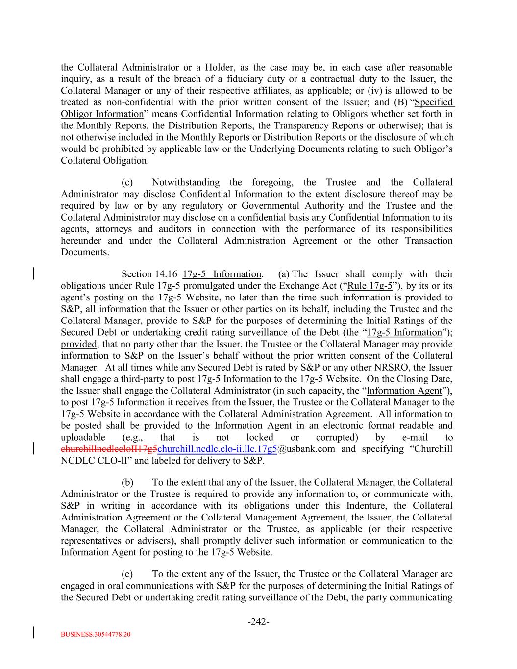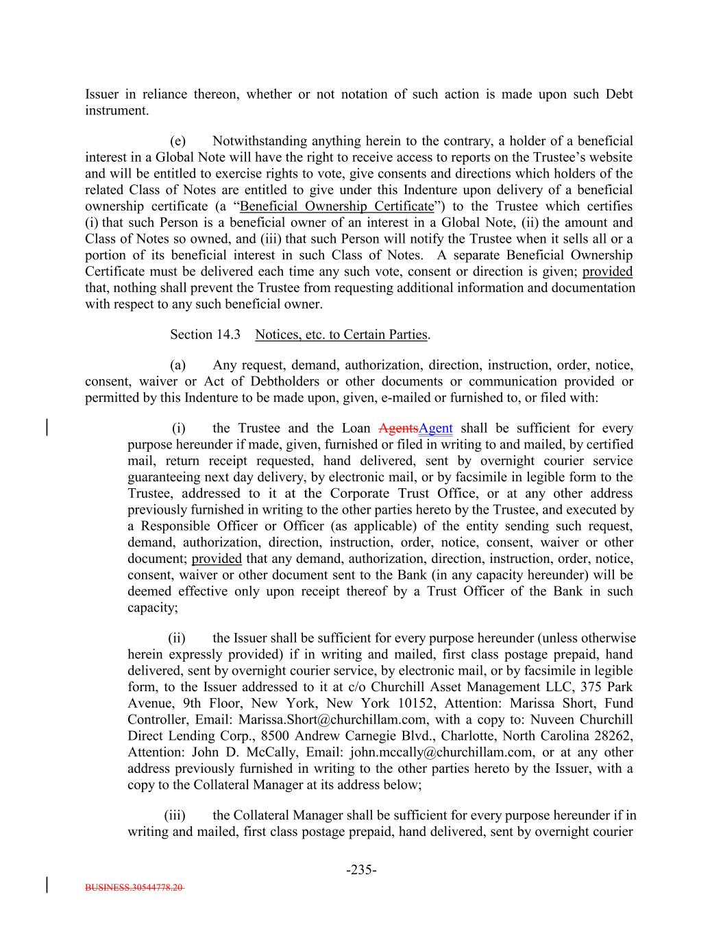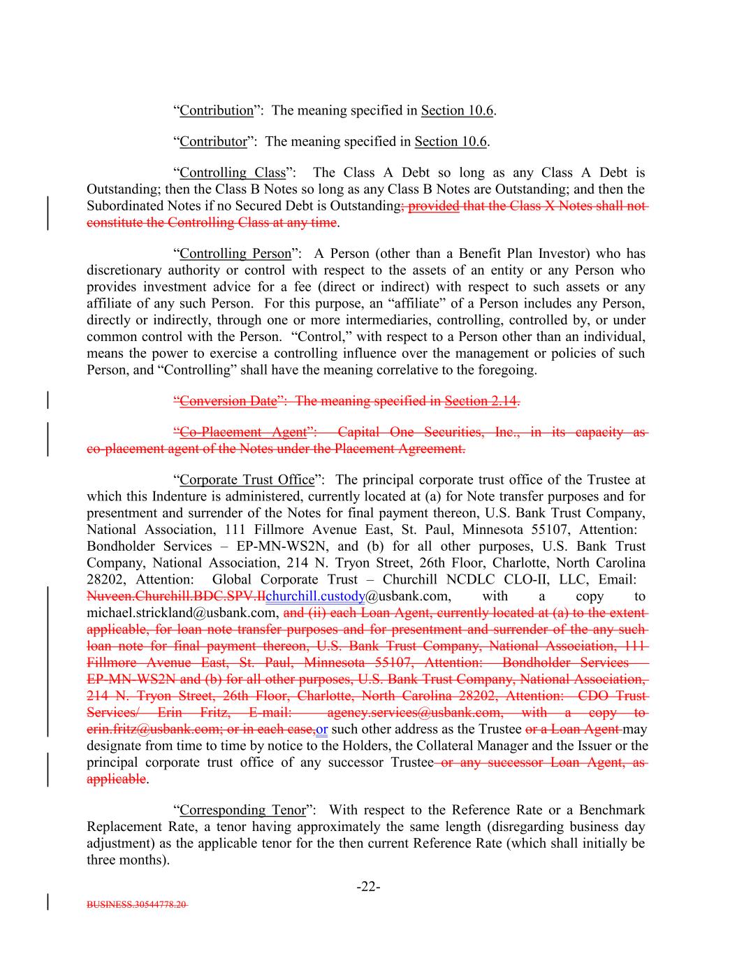 BUSINESS.30544778.20 -22- “Contribution”: The meaning specified in Section 10.6. “Contributor”: The meaning specified in Section 10.6. “Controlling Class”: The Class A Debt so long as any Class A Debt is Outstanding; then the Class B Notes so long as any Class B Notes are Outstanding; and then the Subordinated Notes if no Secured Debt is Outstanding; provided that the Class X Notes shall not constitute the Controlling Class at any time. “Controlling Person”: A Person (other than a Benefit Plan Investor) who has discretionary authority or control with respect to the assets of an entity or any Person who provides investment advice for a fee (direct or indirect) with respect to such assets or any affiliate of any such Person. For this purpose, an “affiliate” of a Person includes any Person, directly or indirectly, through one or more intermediaries, controlling, controlled by, or under common control with the Person. “Control,” with respect to a Person other than an individual, means the power to exercise a controlling influence over the management or policies of such Person, and “Controlling” shall have the meaning correlative to the foregoing. “Conversion Date”: The meaning specified in Section 2.14. “Co-Placement Agent”: Capital One Securities, Inc., in its capacity as co-placement agent of the Notes under the Placement Agreement. “Corporate Trust Office”: The principal corporate trust office of the Trustee at which this Indenture is administered, currently located at (a) for Note transfer purposes and for presentment and surrender of the Notes for final payment thereon, U.S. Bank Trust Company, National Association, 111 Fillmore Avenue East, St. Paul, Minnesota 55107, Attention: Bondholder Services – EP-MN-WS2N, and (b) for all other purposes, U.S. Bank Trust Company, National Association, 214 N. Tryon Street, 26th Floor, Charlotte, North Carolina 28202, Attention: Global Corporate Trust – Churchill NCDLC CLO-II, LLC, Email: Nuveen.Churchill.BDC.SPV.IIchurchill.custody@usbank.com, with a copy to michael.strickland@usbank.com, and (ii) each Loan Agent, currently located at (a) to the extent applicable, for loan note transfer purposes and for presentment and surrender of the any such loan note for final payment thereon, U.S. Bank Trust Company, National Association, 111 Fillmore Avenue East, St. Paul, Minnesota 55107, Attention: Bondholder Services – EP-MN-WS2N and (b) for all other purposes, U.S. Bank Trust Company, National Association, 214 N. Tryon Street, 26th Floor, Charlotte, North Carolina 28202, Attention: CDO Trust Services/ Erin Fritz, E-mail: agency.services@usbank.com, with a copy to erin.fritz@usbank.com; or in each case,or such other address as the Trustee or a Loan Agent may designate from time to time by notice to the Holders, the Collateral Manager and the Issuer or the principal corporate trust office of any successor Trustee or any successor Loan Agent, as applicable. “Corresponding Tenor”: With respect to the Reference Rate or a Benchmark Replacement Rate, a tenor having approximately the same length (disregarding business day adjustment) as the applicable tenor for the then current Reference Rate (which shall initially be three months).