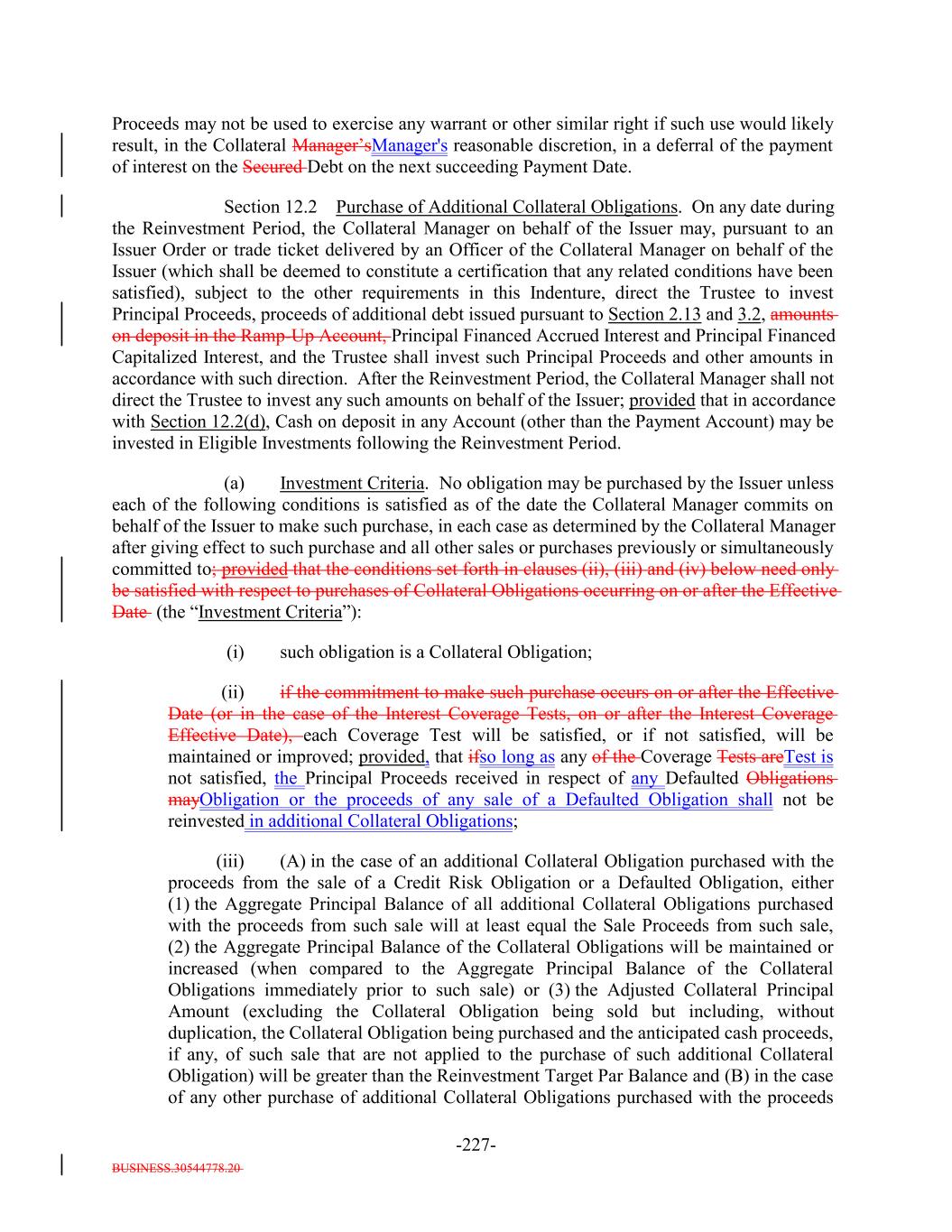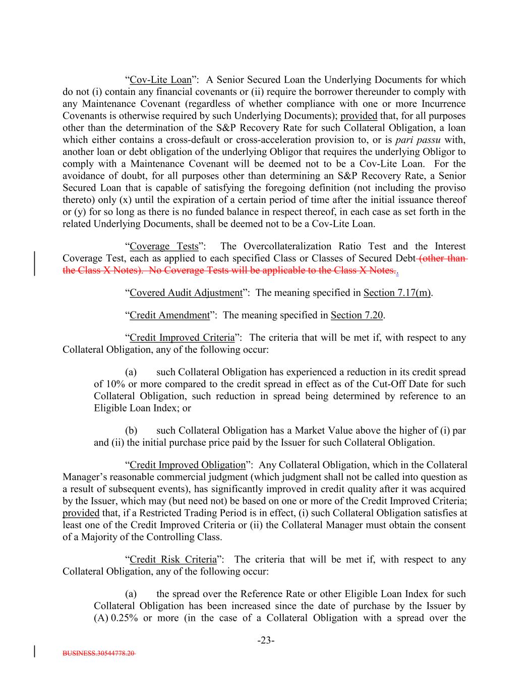 BUSINESS.30544778.20 -23- “Cov-Lite Loan”: A Senior Secured Loan the Underlying Documents for which do not (i) contain any financial covenants or (ii) require the borrower thereunder to comply with any Maintenance Covenant (regardless of whether compliance with one or more Incurrence Covenants is otherwise required by such Underlying Documents); provided that, for all purposes other than the determination of the S&P Recovery Rate for such Collateral Obligation, a loan which either contains a cross-default or cross-acceleration provision to, or is pari passu with, another loan or debt obligation of the underlying Obligor that requires the underlying Obligor to comply with a Maintenance Covenant will be deemed not to be a Cov-Lite Loan. For the avoidance of doubt, for all purposes other than determining an S&P Recovery Rate, a Senior Secured Loan that is capable of satisfying the foregoing definition (not including the proviso thereto) only (x) until the expiration of a certain period of time after the initial issuance thereof or (y) for so long as there is no funded balance in respect thereof, in each case as set forth in the related Underlying Documents, shall be deemed not to be a Cov-Lite Loan. “Coverage Tests”: The Overcollateralization Ratio Test and the Interest Coverage Test, each as applied to each specified Class or Classes of Secured Debt (other than the Class X Notes). No Coverage Tests will be applicable to the Class X Notes.. “Covered Audit Adjustment”: The meaning specified in Section 7.17(m). “Credit Amendment”: The meaning specified in Section 7.20. “Credit Improved Criteria”: The criteria that will be met if, with respect to any Collateral Obligation, any of the following occur: (a) such Collateral Obligation has experienced a reduction in its credit spread of 10% or more compared to the credit spread in effect as of the Cut-Off Date for such Collateral Obligation, such reduction in spread being determined by reference to an Eligible Loan Index; or (b) such Collateral Obligation has a Market Value above the higher of (i) par and (ii) the initial purchase price paid by the Issuer for such Collateral Obligation. “Credit Improved Obligation”: Any Collateral Obligation, which in the Collateral Manager’s reasonable commercial judgment (which judgment shall not be called into question as a result of subsequent events), has significantly improved in credit quality after it was acquired by the Issuer, which may (but need not) be based on one or more of the Credit Improved Criteria; provided that, if a Restricted Trading Period is in effect, (i) such Collateral Obligation satisfies at least one of the Credit Improved Criteria or (ii) the Collateral Manager must obtain the consent of a Majority of the Controlling Class. “Credit Risk Criteria”: The criteria that will be met if, with respect to any Collateral Obligation, any of the following occur: (a) the spread over the Reference Rate or other Eligible Loan Index for such Collateral Obligation has been increased since the date of purchase by the Issuer by (A) 0.25% or more (in the case of a Collateral Obligation with a spread over the