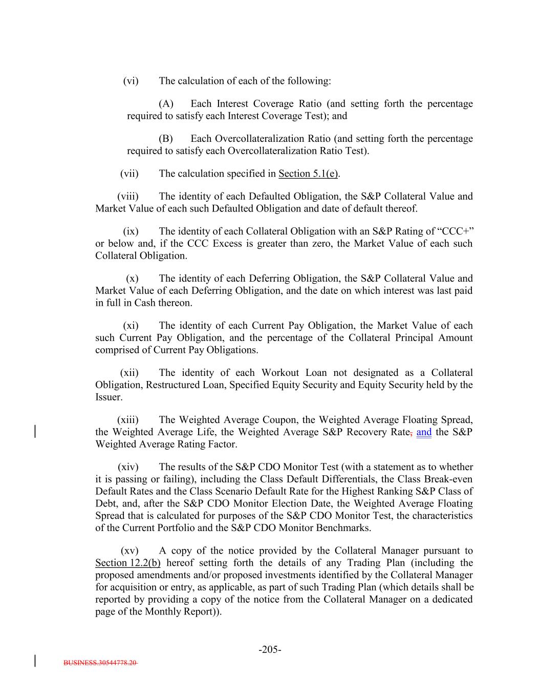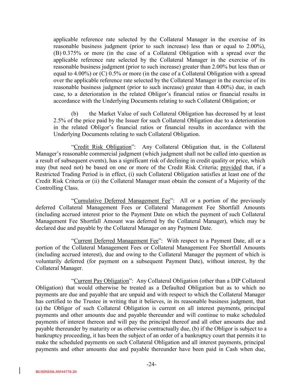 BUSINESS.30544778.20 -24- applicable reference rate selected by the Collateral Manager in the exercise of its reasonable business judgment (prior to such increase) less than or equal to 2.00%), (B) 0.375% or more (in the case of a Collateral Obligation with a spread over the applicable reference rate selected by the Collateral Manager in the exercise of its reasonable business judgment (prior to such increase) greater than 2.00% but less than or equal to 4.00%) or (C) 0.5% or more (in the case of a Collateral Obligation with a spread over the applicable reference rate selected by the Collateral Manager in the exercise of its reasonable business judgment (prior to such increase) greater than 4.00%) due, in each case, to a deterioration in the related Obligor’s financial ratios or financial results in accordance with the Underlying Documents relating to such Collateral Obligation; or (b) the Market Value of such Collateral Obligation has decreased by at least 2.5% of the price paid by the Issuer for such Collateral Obligation due to a deterioration in the related Obligor’s financial ratios or financial results in accordance with the Underlying Documents relating to such Collateral Obligation. “Credit Risk Obligation”: Any Collateral Obligation that, in the Collateral Manager’s reasonable commercial judgment (which judgment shall not be called into question as a result of subsequent events), has a significant risk of declining in credit quality or price, which may (but need not) be based on one or more of the Credit Risk Criteria; provided that, if a Restricted Trading Period is in effect, (i) such Collateral Obligation satisfies at least one of the Credit Risk Criteria or (ii) the Collateral Manager must obtain the consent of a Majority of the Controlling Class. “Cumulative Deferred Management Fee”: All or a portion of the previously deferred Collateral Management Fees or Collateral Management Fee Shortfall Amounts (including accrued interest prior to the Payment Date on which the payment of such Collateral Management Fee Shortfall Amount was deferred by the Collateral Manager), which may be declared due and payable by the Collateral Manager on any Payment Date. “Current Deferred Management Fee”: With respect to a Payment Date, all or a portion of the Collateral Management Fees or Collateral Management Fee Shortfall Amounts (including accrued interest), due and owing to the Collateral Manager the payment of which is voluntarily deferred (for payment on a subsequent Payment Date), without interest, by the Collateral Manager. “Current Pay Obligation”: Any Collateral Obligation (other than a DIP Collateral Obligation) that would otherwise be treated as a Defaulted Obligation but as to which no payments are due and payable that are unpaid and with respect to which the Collateral Manager has certified to the Trustee in writing that it believes, in its reasonable business judgment, that (a) the Obligor of such Collateral Obligation is current on all interest payments, principal payments and other amounts due and payable thereunder and will continue to make scheduled payments of interest thereon and will pay the principal thereof and all other amounts due and payable thereunder by maturity or as otherwise contractually due, (b) if the Obligor is subject to a bankruptcy proceeding, it has been the subject of an order of a bankruptcy court that permits it to make the scheduled payments on such Collateral Obligation and all interest payments, principal payments and other amounts due and payable thereunder have been paid in Cash when due,