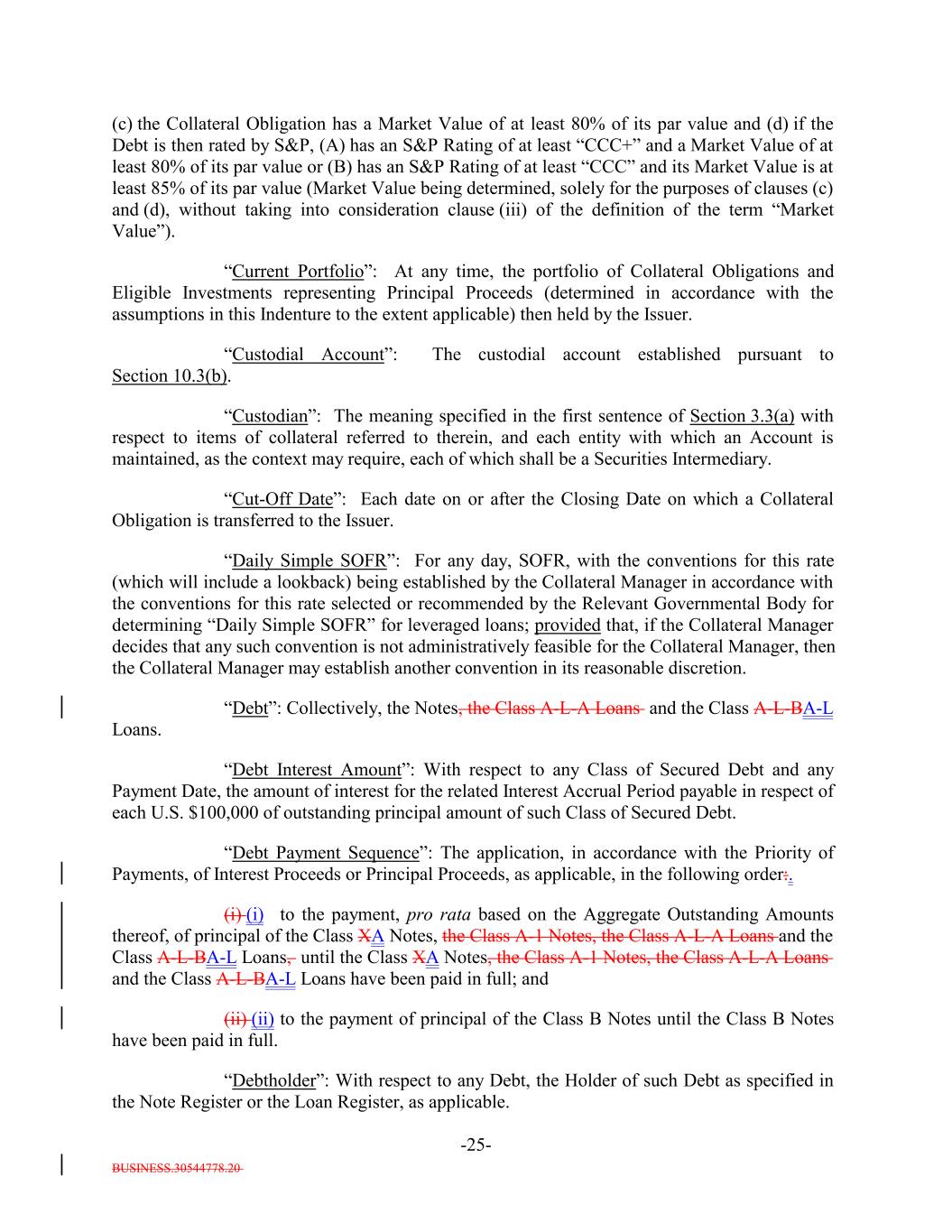 BUSINESS.30544778.20 -25- (c) the Collateral Obligation has a Market Value of at least 80% of its par value and (d) if the Debt is then rated by S&P, (A) has an S&P Rating of at least “CCC+” and a Market Value of at least 80% of its par value or (B) has an S&P Rating of at least “CCC” and its Market Value is at least 85% of its par value (Market Value being determined, solely for the purposes of clauses (c) and (d), without taking into consideration clause (iii) of the definition of the term “Market Value”). “Current Portfolio”: At any time, the portfolio of Collateral Obligations and Eligible Investments representing Principal Proceeds (determined in accordance with the assumptions in this Indenture to the extent applicable) then held by the Issuer. “Custodial Account”: The custodial account established pursuant to Section 10.3(b). “Custodian”: The meaning specified in the first sentence of Section 3.3(a) with respect to items of collateral referred to therein, and each entity with which an Account is maintained, as the context may require, each of which shall be a Securities Intermediary. “Cut-Off Date”: Each date on or after the Closing Date on which a Collateral Obligation is transferred to the Issuer. “Daily Simple SOFR”: For any day, SOFR, with the conventions for this rate (which will include a lookback) being established by the Collateral Manager in accordance with the conventions for this rate selected or recommended by the Relevant Governmental Body for determining “Daily Simple SOFR” for leveraged loans; provided that, if the Collateral Manager decides that any such convention is not administratively feasible for the Collateral Manager, then the Collateral Manager may establish another convention in its reasonable discretion. “Debt”: Collectively, the Notes, the Class A-L-A Loans and the Class A-L-BA-L Loans. “Debt Interest Amount”: With respect to any Class of Secured Debt and any Payment Date, the amount of interest for the related Interest Accrual Period payable in respect of each U.S. $100,000 of outstanding principal amount of such Class of Secured Debt. “Debt Payment Sequence”: The application, in accordance with the Priority of Payments, of Interest Proceeds or Principal Proceeds, as applicable, in the following order:. (i) (i) to the payment, pro rata based on the Aggregate Outstanding Amounts thereof, of principal of the Class XA Notes, the Class A-1 Notes, the Class A-L-A Loans and the Class A-L-BA-L Loans, until the Class XA Notes, the Class A-1 Notes, the Class A-L-A Loans and the Class A-L-BA-L Loans have been paid in full; and (ii) (ii) to the payment of principal of the Class B Notes until the Class B Notes have been paid in full. “Debtholder”: With respect to any Debt, the Holder of such Debt as specified in the Note Register or the Loan Register, as applicable.