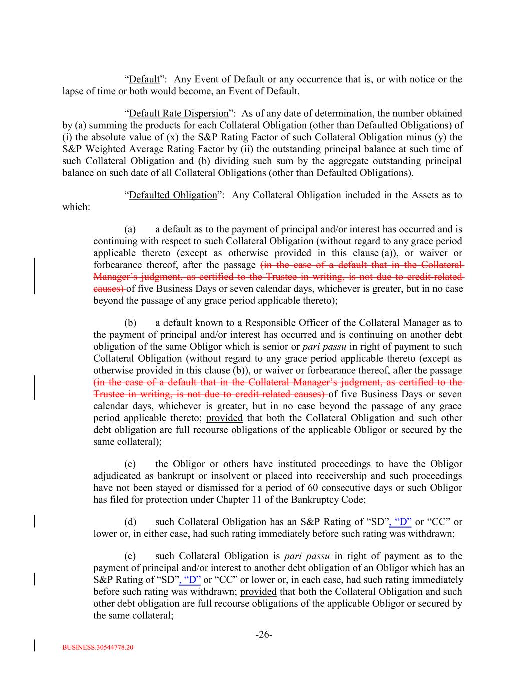 BUSINESS.30544778.20 -26- “Default”: Any Event of Default or any occurrence that is, or with notice or the lapse of time or both would become, an Event of Default. “Default Rate Dispersion”: As of any date of determination, the number obtained by (a) summing the products for each Collateral Obligation (other than Defaulted Obligations) of (i) the absolute value of (x) the S&P Rating Factor of such Collateral Obligation minus (y) the S&P Weighted Average Rating Factor by (ii) the outstanding principal balance at such time of such Collateral Obligation and (b) dividing such sum by the aggregate outstanding principal balance on such date of all Collateral Obligations (other than Defaulted Obligations). “Defaulted Obligation”: Any Collateral Obligation included in the Assets as to which: (a) a default as to the payment of principal and/or interest has occurred and is continuing with respect to such Collateral Obligation (without regard to any grace period applicable thereto (except as otherwise provided in this clause (a)), or waiver or forbearance thereof, after the passage (in the case of a default that in the Collateral Manager’s judgment, as certified to the Trustee in writing, is not due to credit-related causes) of five Business Days or seven calendar days, whichever is greater, but in no case beyond the passage of any grace period applicable thereto); (b) a default known to a Responsible Officer of the Collateral Manager as to the payment of principal and/or interest has occurred and is continuing on another debt obligation of the same Obligor which is senior or pari passu in right of payment to such Collateral Obligation (without regard to any grace period applicable thereto (except as otherwise provided in this clause (b)), or waiver or forbearance thereof, after the passage (in the case of a default that in the Collateral Manager’s judgment, as certified to the Trustee in writing, is not due to credit-related causes) of five Business Days or seven calendar days, whichever is greater, but in no case beyond the passage of any grace period applicable thereto; provided that both the Collateral Obligation and such other debt obligation are full recourse obligations of the applicable Obligor or secured by the same collateral); (c) the Obligor or others have instituted proceedings to have the Obligor adjudicated as bankrupt or insolvent or placed into receivership and such proceedings have not been stayed or dismissed for a period of 60 consecutive days or such Obligor has filed for protection under Chapter 11 of the Bankruptcy Code; (d) such Collateral Obligation has an S&P Rating of “SD”, “D” or “CC” or lower or, in either case, had such rating immediately before such rating was withdrawn; (e) such Collateral Obligation is pari passu in right of payment as to the payment of principal and/or interest to another debt obligation of an Obligor which has an S&P Rating of “SD”, “D” or “CC” or lower or, in each case, had such rating immediately before such rating was withdrawn; provided that both the Collateral Obligation and such other debt obligation are full recourse obligations of the applicable Obligor or secured by the same collateral;