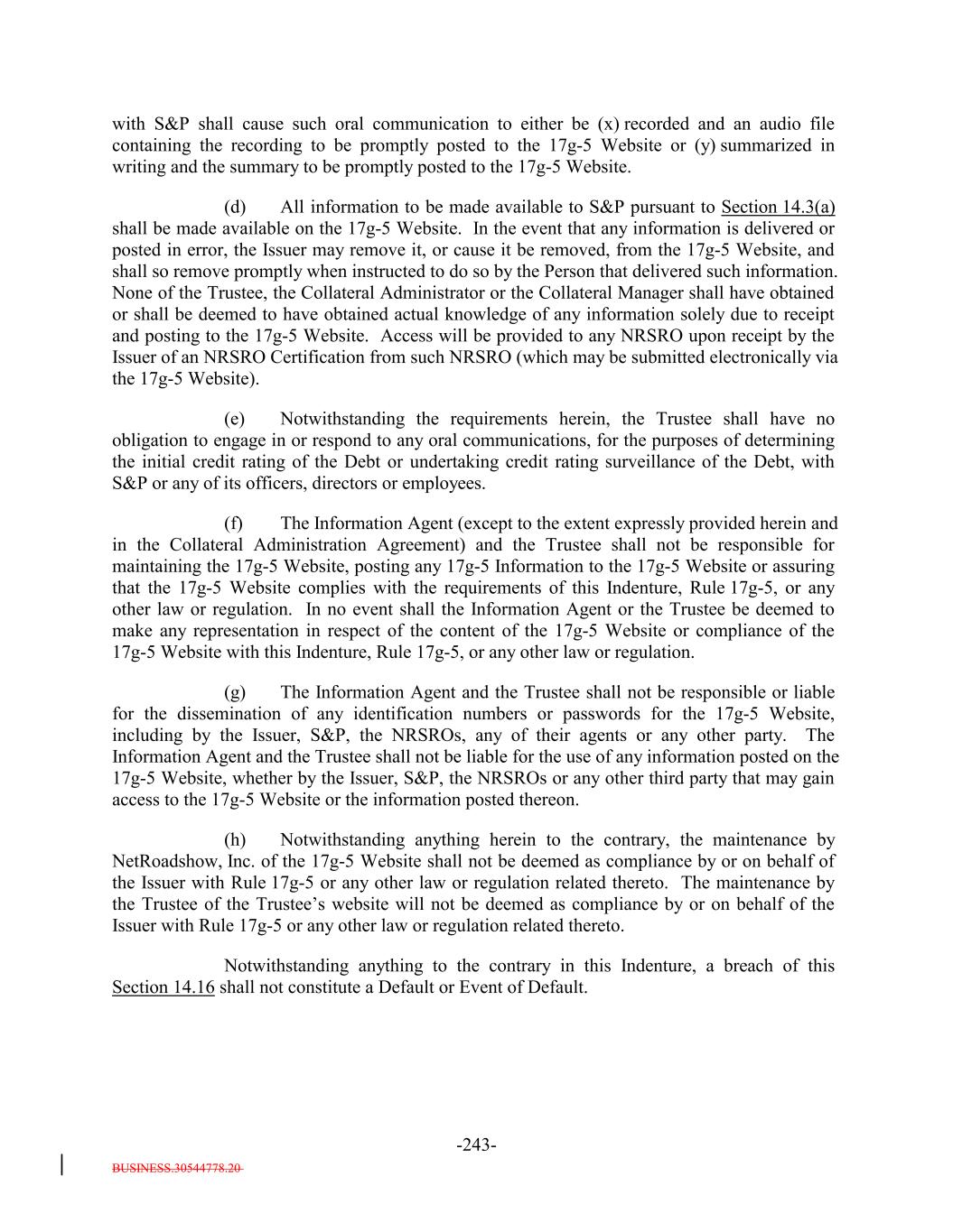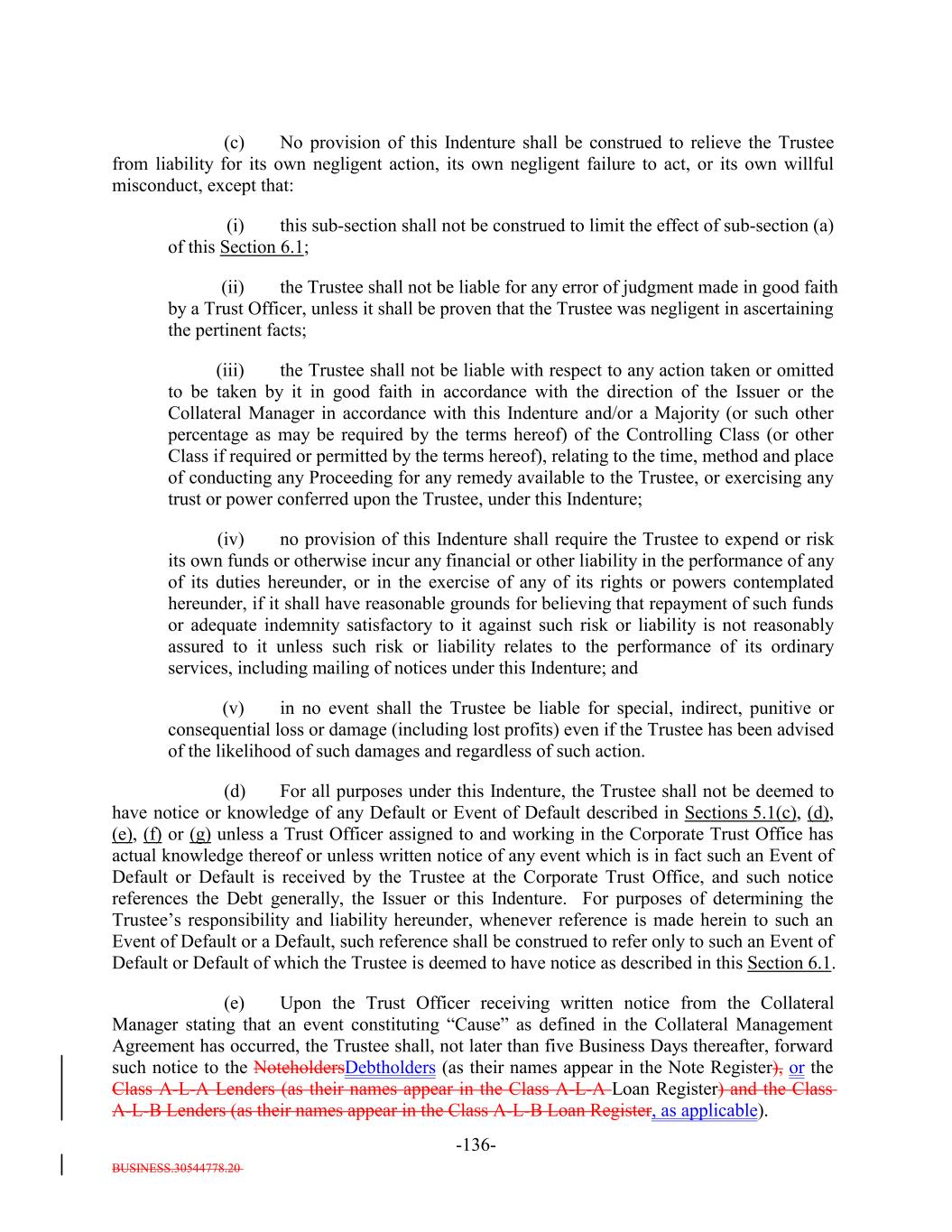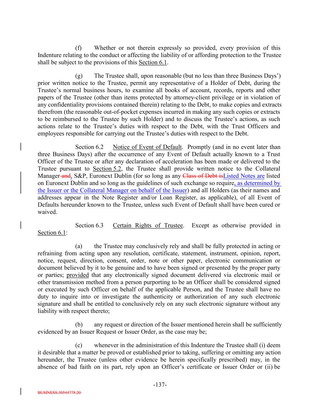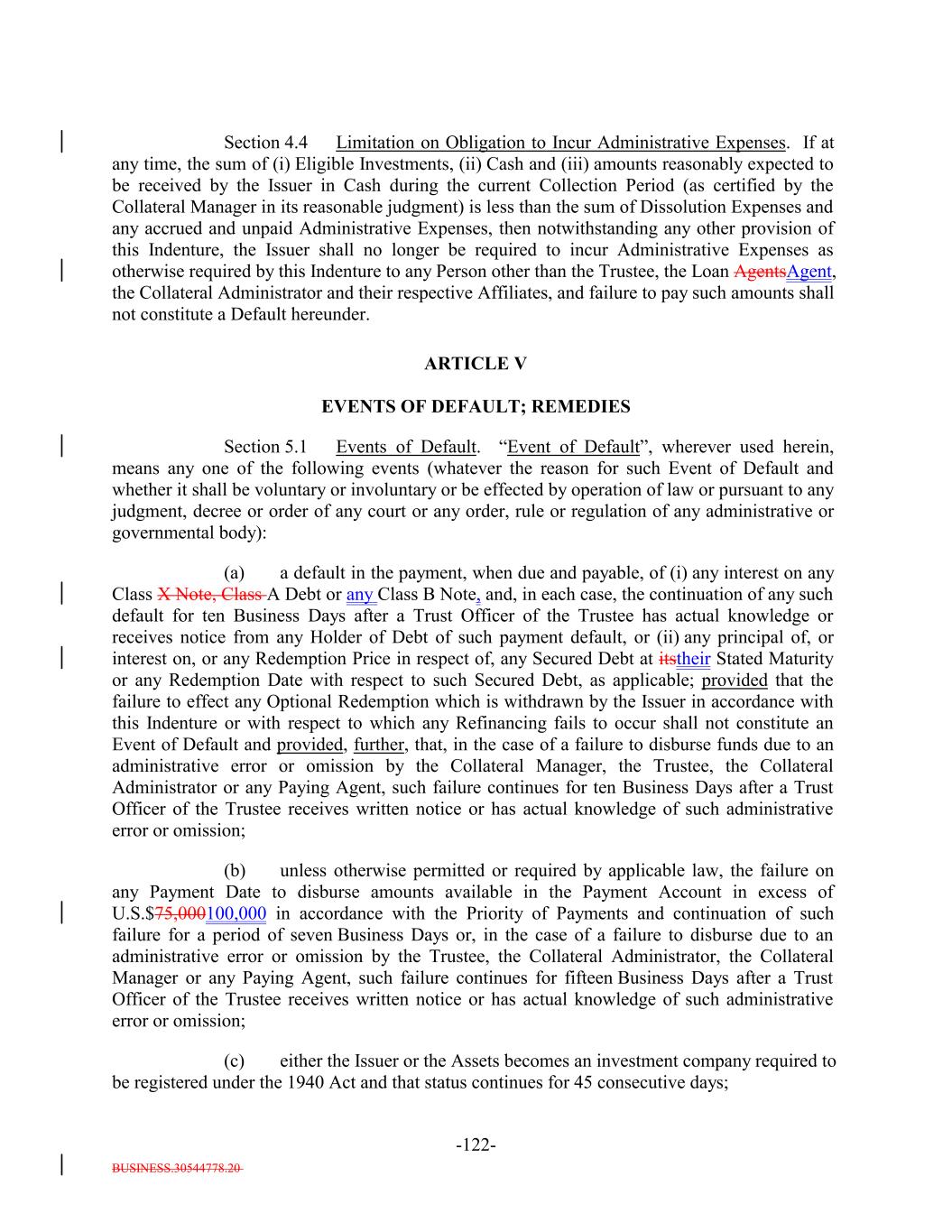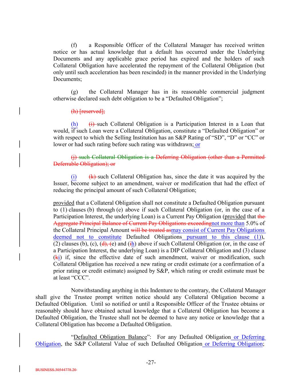BUSINESS.30544778.20 -27- (f) a Responsible Officer of the Collateral Manager has received written notice or has actual knowledge that a default has occurred under the Underlying Documents and any applicable grace period has expired and the holders of such Collateral Obligation have accelerated the repayment of the Collateral Obligation (but only until such acceleration has been rescinded) in the manner provided in the Underlying Documents; (g) the Collateral Manager has in its reasonable commercial judgment otherwise declared such debt obligation to be a “Defaulted Obligation”; (h) [reserved]; (h) (i) such Collateral Obligation is a Participation Interest in a Loan that would, if such Loan were a Collateral Obligation, constitute a “Defaulted Obligation” or with respect to which the Selling Institution has an S&P Rating of “SD”, “D” or “CC” or lower or had such rating before such rating was withdrawn; or (j) such Collateral Obligation is a Deferring Obligation (other than a Permitted Deferrable Obligation); or (i) (k) such Collateral Obligation has, since the date it was acquired by the Issuer, become subject to an amendment, waiver or modification that had the effect of reducing the principal amount of such Collateral Obligation; provided that a Collateral Obligation shall not constitute a Defaulted Obligation pursuant to (1) clauses (b) through (e) above if such Collateral Obligation (or, in the case of a Participation Interest, the underlying Loan) is a Current Pay Obligation (provided that the Aggregate Principal Balance of Current Pay Obligations exceedingnot more than 5.0% of the Collateral Principal Amount will be treated asmay consist of Current Pay Obligations deemed not to constitute Defaulted Obligations pursuant to this clause (1)), (2) clauses (b), (c), (d), (e) and (ih) above if such Collateral Obligation (or, in the case of a Participation Interest, the underlying Loan) is a DIP Collateral Obligation and (3) clause (ki) if, since the effective date of such amendment, waiver or modification, such Collateral Obligation has received a new rating or credit estimate (or a confirmation of a prior rating or credit estimate) assigned by S&P, which rating or credit estimate must be at least “CCC”. Notwithstanding anything in this Indenture to the contrary, the Collateral Manager shall give the Trustee prompt written notice should any Collateral Obligation become a Defaulted Obligation. Until so notified or until a Responsible Officer of the Trustee obtains or reasonably should have obtained actual knowledge that a Collateral Obligation has become a Defaulted Obligation, the Trustee shall not be deemed to have any notice or knowledge that a Collateral Obligation has become a Defaulted Obligation. “Defaulted Obligation Balance”: For any Defaulted Obligation or Deferring Obligation, the S&P Collateral Value of such Defaulted Obligation or Deferring Obligation;