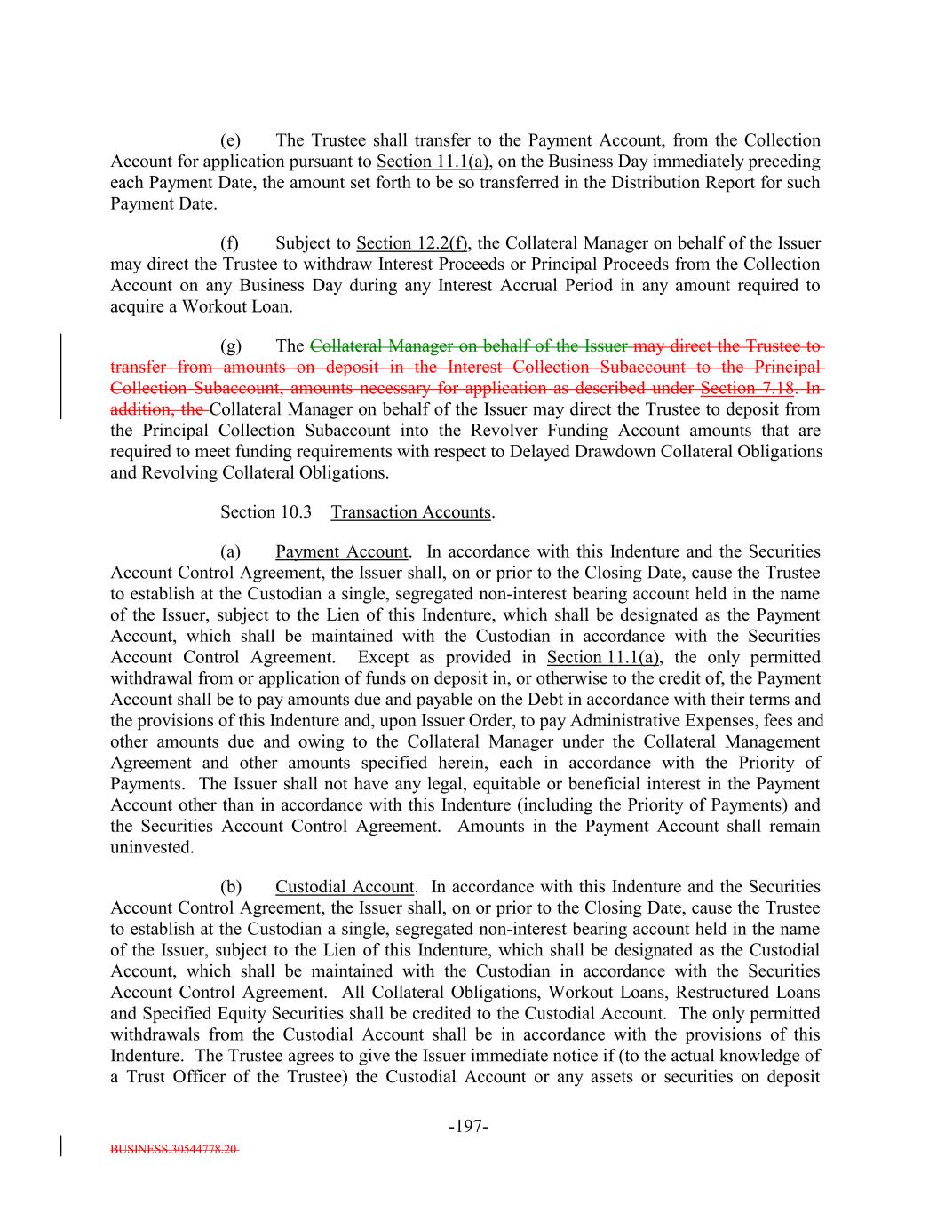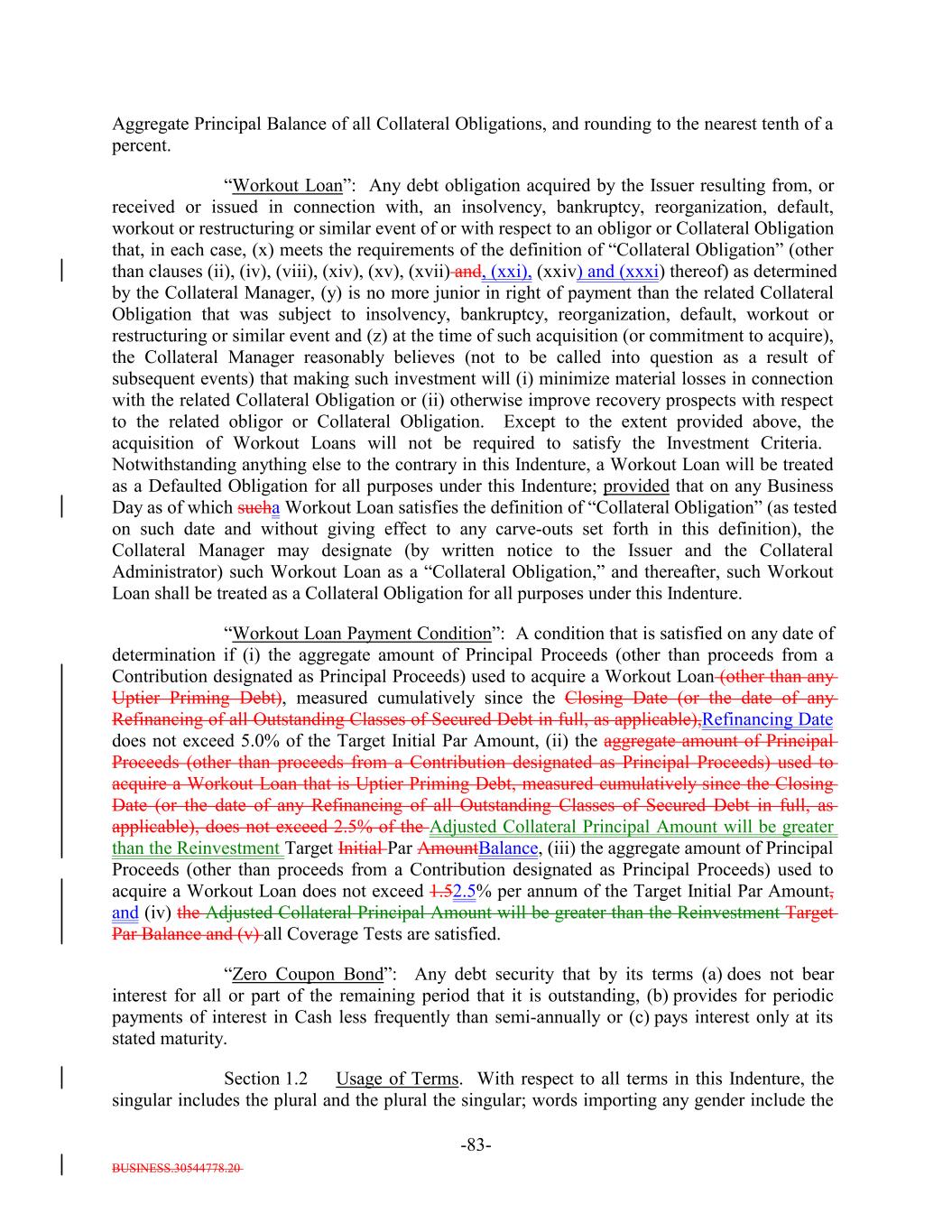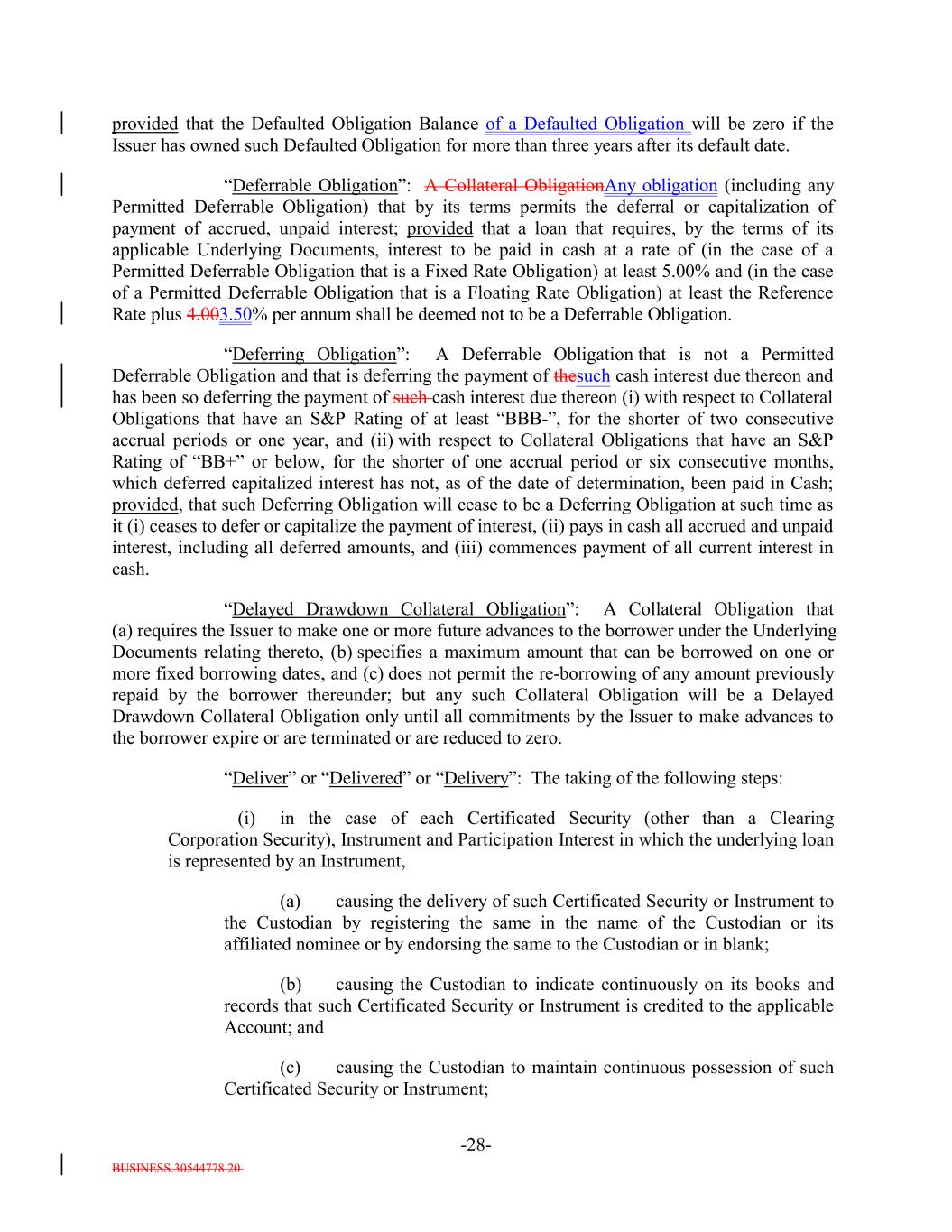 BUSINESS.30544778.20 -28- provided that the Defaulted Obligation Balance of a Defaulted Obligation will be zero if the Issuer has owned such Defaulted Obligation for more than three years after its default date. “Deferrable Obligation”: A Collateral ObligationAny obligation (including any Permitted Deferrable Obligation) that by its terms permits the deferral or capitalization of payment of accrued, unpaid interest; provided that a loan that requires, by the terms of its applicable Underlying Documents, interest to be paid in cash at a rate of (in the case of a Permitted Deferrable Obligation that is a Fixed Rate Obligation) at least 5.00% and (in the case of a Permitted Deferrable Obligation that is a Floating Rate Obligation) at least the Reference Rate plus 4.003.50% per annum shall be deemed not to be a Deferrable Obligation. “Deferring Obligation”: A Deferrable Obligation that is not a Permitted Deferrable Obligation and that is deferring the payment of thesuch cash interest due thereon and has been so deferring the payment of such cash interest due thereon (i) with respect to Collateral Obligations that have an S&P Rating of at least “BBB-”, for the shorter of two consecutive accrual periods or one year, and (ii) with respect to Collateral Obligations that have an S&P Rating of “BB+” or below, for the shorter of one accrual period or six consecutive months, which deferred capitalized interest has not, as of the date of determination, been paid in Cash; provided, that such Deferring Obligation will cease to be a Deferring Obligation at such time as it (i) ceases to defer or capitalize the payment of interest, (ii) pays in cash all accrued and unpaid interest, including all deferred amounts, and (iii) commences payment of all current interest in cash. “Delayed Drawdown Collateral Obligation”: A Collateral Obligation that (a) requires the Issuer to make one or more future advances to the borrower under the Underlying Documents relating thereto, (b) specifies a maximum amount that can be borrowed on one or more fixed borrowing dates, and (c) does not permit the re-borrowing of any amount previously repaid by the borrower thereunder; but any such Collateral Obligation will be a Delayed Drawdown Collateral Obligation only until all commitments by the Issuer to make advances to the borrower expire or are terminated or are reduced to zero. “Deliver” or “Delivered” or “Delivery”: The taking of the following steps: (i) in the case of each Certificated Security (other than a Clearing Corporation Security), Instrument and Participation Interest in which the underlying loan is represented by an Instrument, (a) causing the delivery of such Certificated Security or Instrument to the Custodian by registering the same in the name of the Custodian or its affiliated nominee or by endorsing the same to the Custodian or in blank; (b) causing the Custodian to indicate continuously on its books and records that such Certificated Security or Instrument is credited to the applicable Account; and (c) causing the Custodian to maintain continuous possession of such Certificated Security or Instrument;