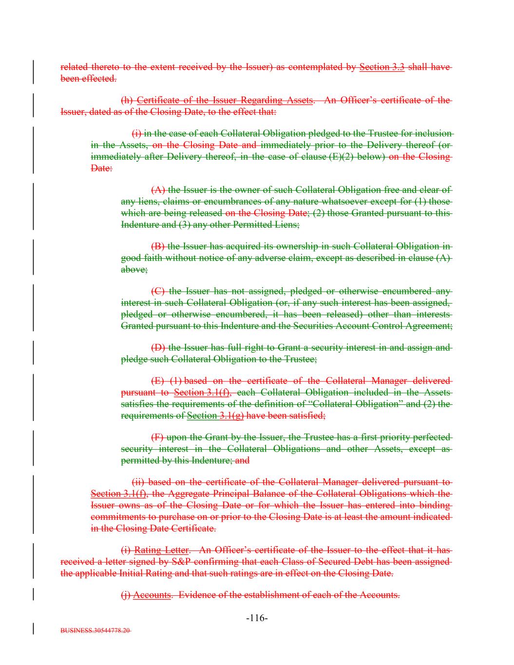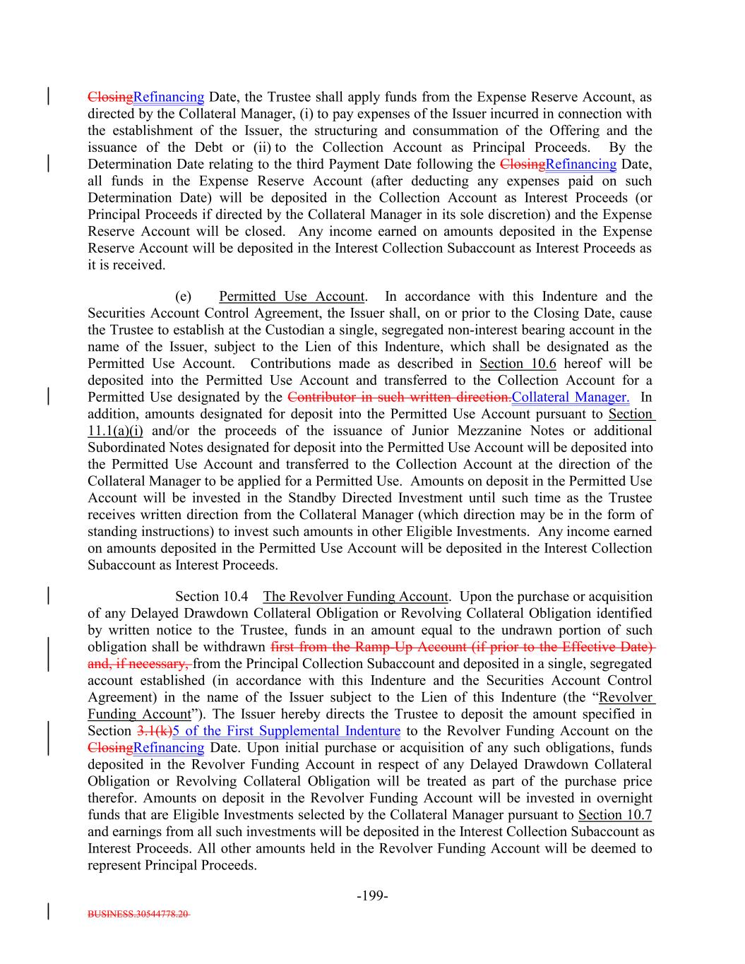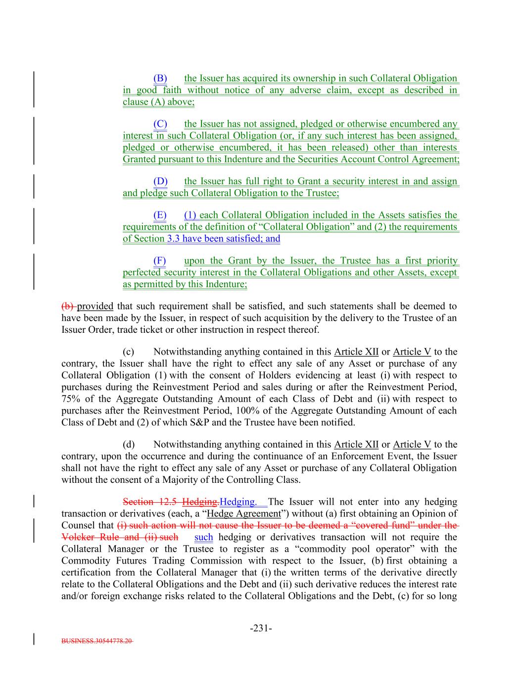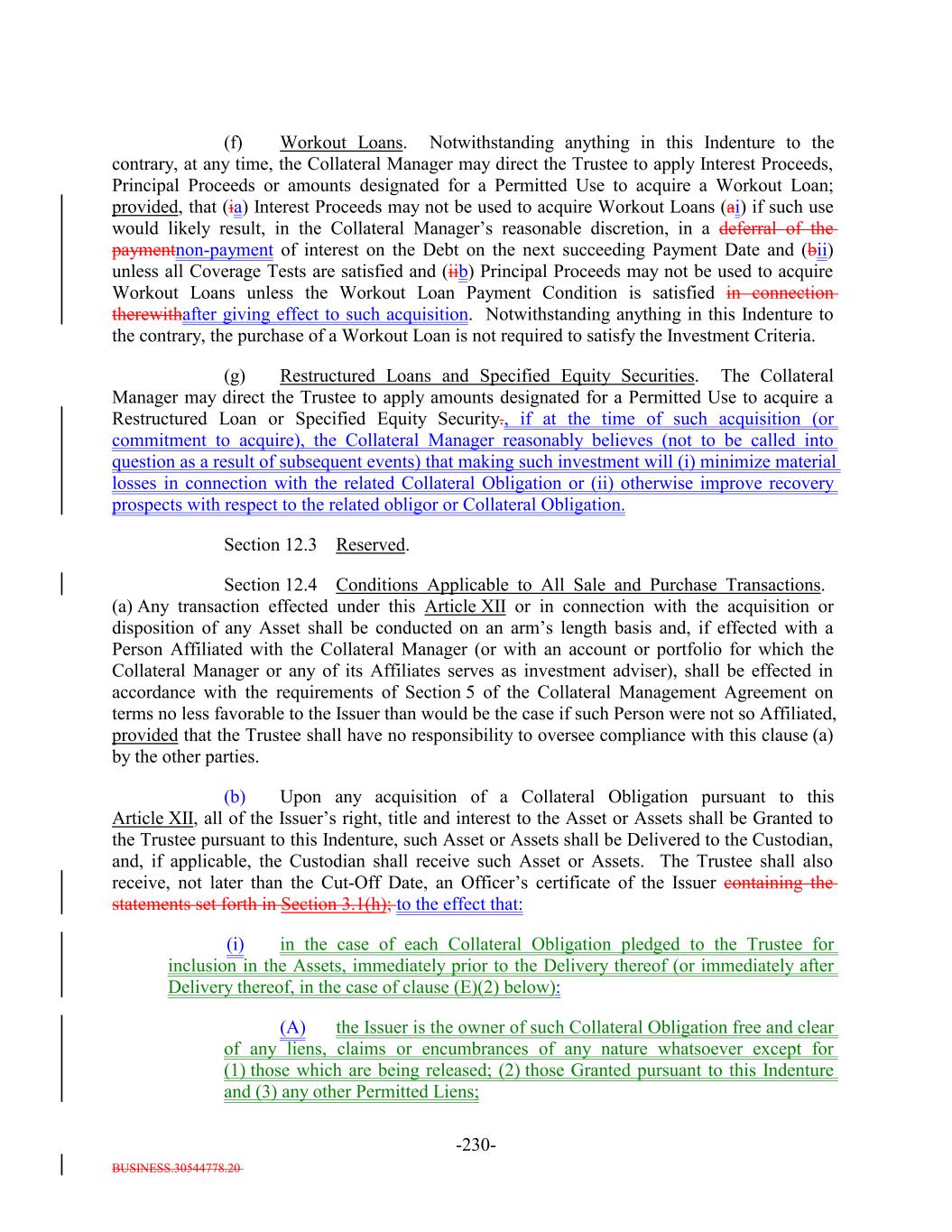 BUSINESS.30544778.20 -28- provided that the Defaulted Obligation Balance of a Defaulted Obligation will be zero if the Issuer has owned such Defaulted Obligation for more than three years after its default date. “Deferrable Obligation”: A Collateral ObligationAny obligation (including any Permitted Deferrable Obligation) that by its terms permits the deferral or capitalization of payment of accrued, unpaid interest; provided that a loan that requires, by the terms of its applicable Underlying Documents, interest to be paid in cash at a rate of (in the case of a Permitted Deferrable Obligation that is a Fixed Rate Obligation) at least 5.00% and (in the case of a Permitted Deferrable Obligation that is a Floating Rate Obligation) at least the Reference Rate plus 4.003.50% per annum shall be deemed not to be a Deferrable Obligation. “Deferring Obligation”: A Deferrable Obligation that is not a Permitted Deferrable Obligation and that is deferring the payment of thesuch cash interest due thereon and has been so deferring the payment of such cash interest due thereon (i) with respect to Collateral Obligations that have an S&P Rating of at least “BBB-”, for the shorter of two consecutive accrual periods or one year, and (ii) with respect to Collateral Obligations that have an S&P Rating of “BB+” or below, for the shorter of one accrual period or six consecutive months, which deferred capitalized interest has not, as of the date of determination, been paid in Cash; provided, that such Deferring Obligation will cease to be a Deferring Obligation at such time as it (i) ceases to defer or capitalize the payment of interest, (ii) pays in cash all accrued and unpaid interest, including all deferred amounts, and (iii) commences payment of all current interest in cash. “Delayed Drawdown Collateral Obligation”: A Collateral Obligation that (a) requires the Issuer to make one or more future advances to the borrower under the Underlying Documents relating thereto, (b) specifies a maximum amount that can be borrowed on one or more fixed borrowing dates, and (c) does not permit the re-borrowing of any amount previously repaid by the borrower thereunder; but any such Collateral Obligation will be a Delayed Drawdown Collateral Obligation only until all commitments by the Issuer to make advances to the borrower expire or are terminated or are reduced to zero. “Deliver” or “Delivered” or “Delivery”: The taking of the following steps: (i) in the case of each Certificated Security (other than a Clearing Corporation Security), Instrument and Participation Interest in which the underlying loan is represented by an Instrument, (a) causing the delivery of such Certificated Security or Instrument to the Custodian by registering the same in the name of the Custodian or its affiliated nominee or by endorsing the same to the Custodian or in blank; (b) causing the Custodian to indicate continuously on its books and records that such Certificated Security or Instrument is credited to the applicable Account; and (c) causing the Custodian to maintain continuous possession of such Certificated Security or Instrument;