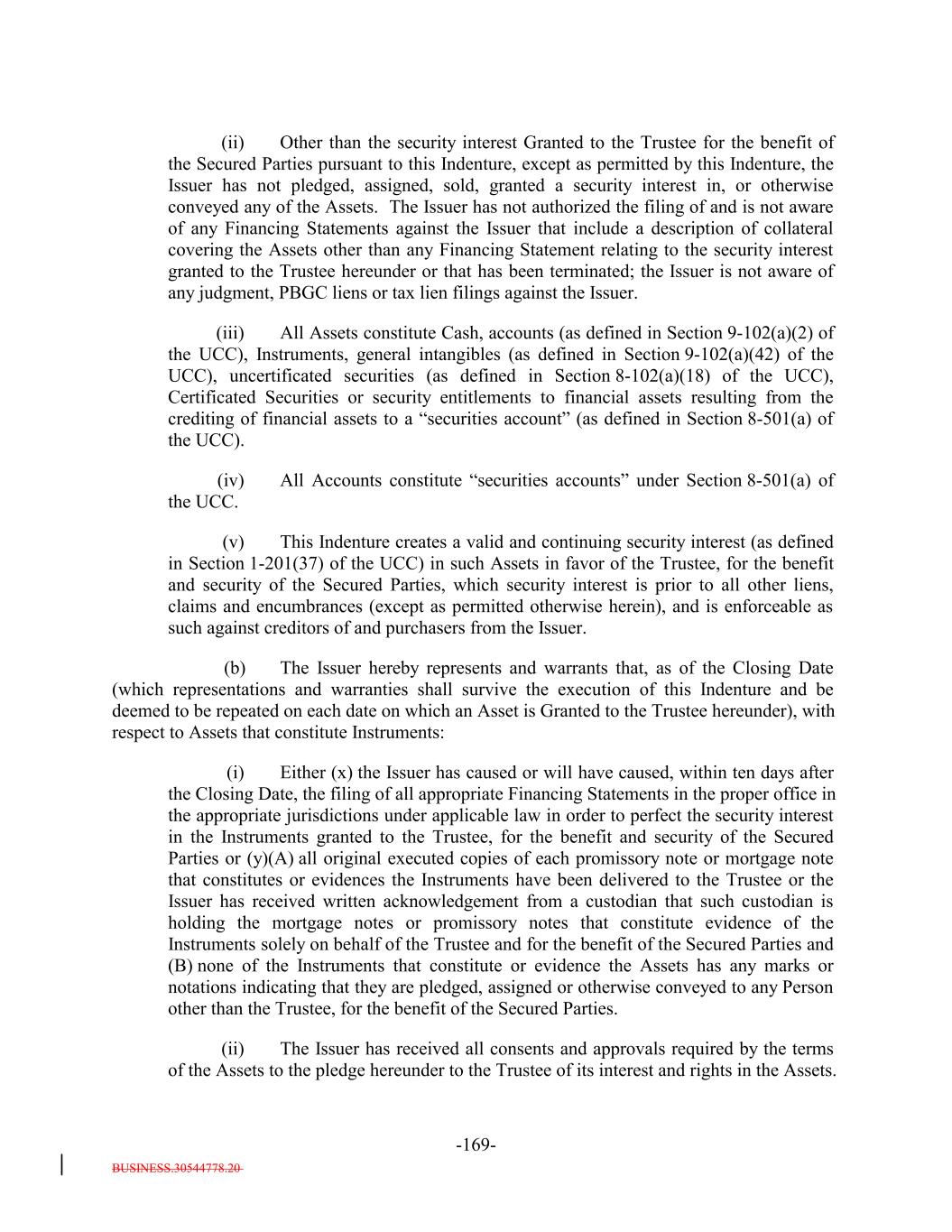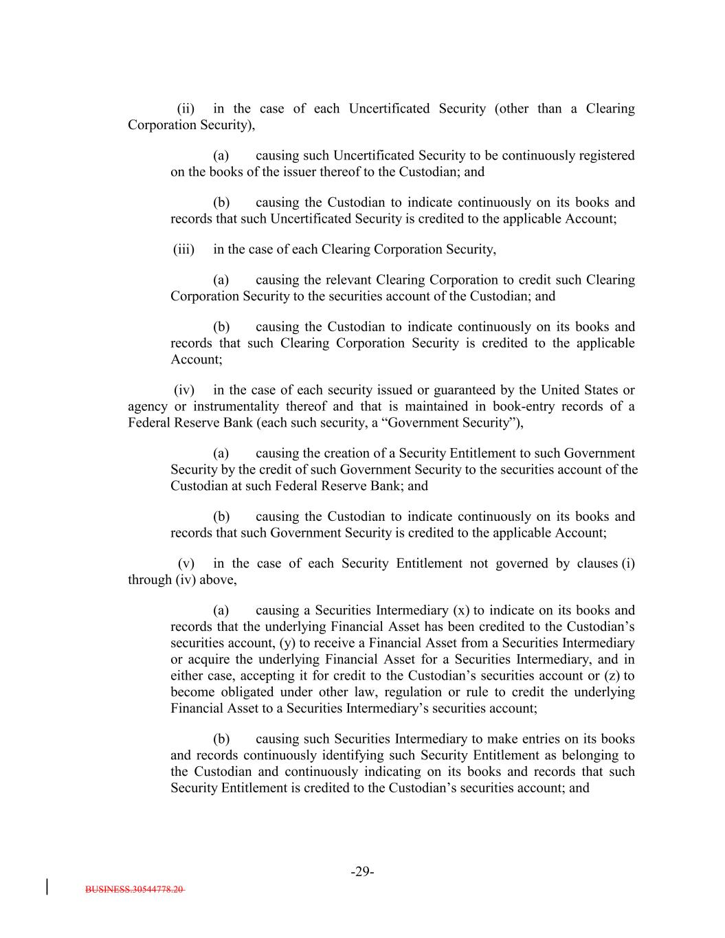 BUSINESS.30544778.20 -29- (ii) in the case of each Uncertificated Security (other than a Clearing Corporation Security), (a) causing such Uncertificated Security to be continuously registered on the books of the issuer thereof to the Custodian; and (b) causing the Custodian to indicate continuously on its books and records that such Uncertificated Security is credited to the applicable Account; (iii) in the case of each Clearing Corporation Security, (a) causing the relevant Clearing Corporation to credit such Clearing Corporation Security to the securities account of the Custodian; and (b) causing the Custodian to indicate continuously on its books and records that such Clearing Corporation Security is credited to the applicable Account; (iv) in the case of each security issued or guaranteed by the United States or agency or instrumentality thereof and that is maintained in book-entry records of a Federal Reserve Bank (each such security, a “Government Security”), (a) causing the creation of a Security Entitlement to such Government Security by the credit of such Government Security to the securities account of the Custodian at such Federal Reserve Bank; and (b) causing the Custodian to indicate continuously on its books and records that such Government Security is credited to the applicable Account; (v) in the case of each Security Entitlement not governed by clauses (i) through (iv) above, (a) causing a Securities Intermediary (x) to indicate on its books and records that the underlying Financial Asset has been credited to the Custodian’s securities account, (y) to receive a Financial Asset from a Securities Intermediary or acquire the underlying Financial Asset for a Securities Intermediary, and in either case, accepting it for credit to the Custodian’s securities account or (z) to become obligated under other law, regulation or rule to credit the underlying Financial Asset to a Securities Intermediary’s securities account; (b) causing such Securities Intermediary to make entries on its books and records continuously identifying such Security Entitlement as belonging to the Custodian and continuously indicating on its books and records that such Security Entitlement is credited to the Custodian’s securities account; and