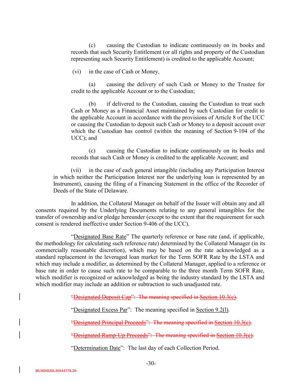 BUSINESS.30544778.20 -30- (c) causing the Custodian to indicate continuously on its books and records that such Security Entitlement (or all rights and property of the Custodian representing such Security Entitlement) is credited to the applicable Account; (vi) in the case of Cash or Money, (a) causing the delivery of such Cash or Money to the Trustee for credit to the applicable Account or to the Custodian; (b) if delivered to the Custodian, causing the Custodian to treat such Cash or Money as a Financial Asset maintained by such Custodian for credit to the applicable Account in accordance with the provisions of Article 8 of the UCC or causing the Custodian to deposit such Cash or Money to a deposit account over which the Custodian has control (within the meaning of Section 9-104 of the UCC); and (c) causing the Custodian to indicate continuously on its books and records that such Cash or Money is credited to the applicable Account; and (vii) in the case of each general intangible (including any Participation Interest in which neither the Participation Interest nor the underlying loan is represented by an Instrument), causing the filing of a Financing Statement in the office of the Recorder of Deeds of the State of Delaware. In addition, the Collateral Manager on behalf of the Issuer will obtain any and all consents required by the Underlying Documents relating to any general intangibles for the transfer of ownership and/or pledge hereunder (except to the extent that the requirement for such consent is rendered ineffective under Section 9-406 of the UCC). “Designated Base Rate” The quarterly reference or base rate (and, if applicable, the methodology for calculating such reference rate) determined by the Collateral Manager (in its commercially reasonable discretion), which may be based on the rate acknowledged as a standard replacement in the leveraged loan market for the Term SOFR Rate by the LSTA and which may include a modifier, as determined by the Collateral Manager, applied to a reference or base rate in order to cause such rate to be comparable to the three month Term SOFR Rate, which modifier is recognized or acknowledged as being the industry standard by the LSTA and which modifier may include an addition or subtraction to such unadjusted rate. “Designated Deposit Cap”: The meaning specified in Section 10.3(c). “Designated Excess Par”: The meaning specified in Section 9.2(l). “Designated Principal Proceeds”: The meaning specified in Section 10.3(c). “Designated Ramp-Up Proceeds”: The meaning specified in Section 10.3(c). “Determination Date”: The last day of each Collection Period.