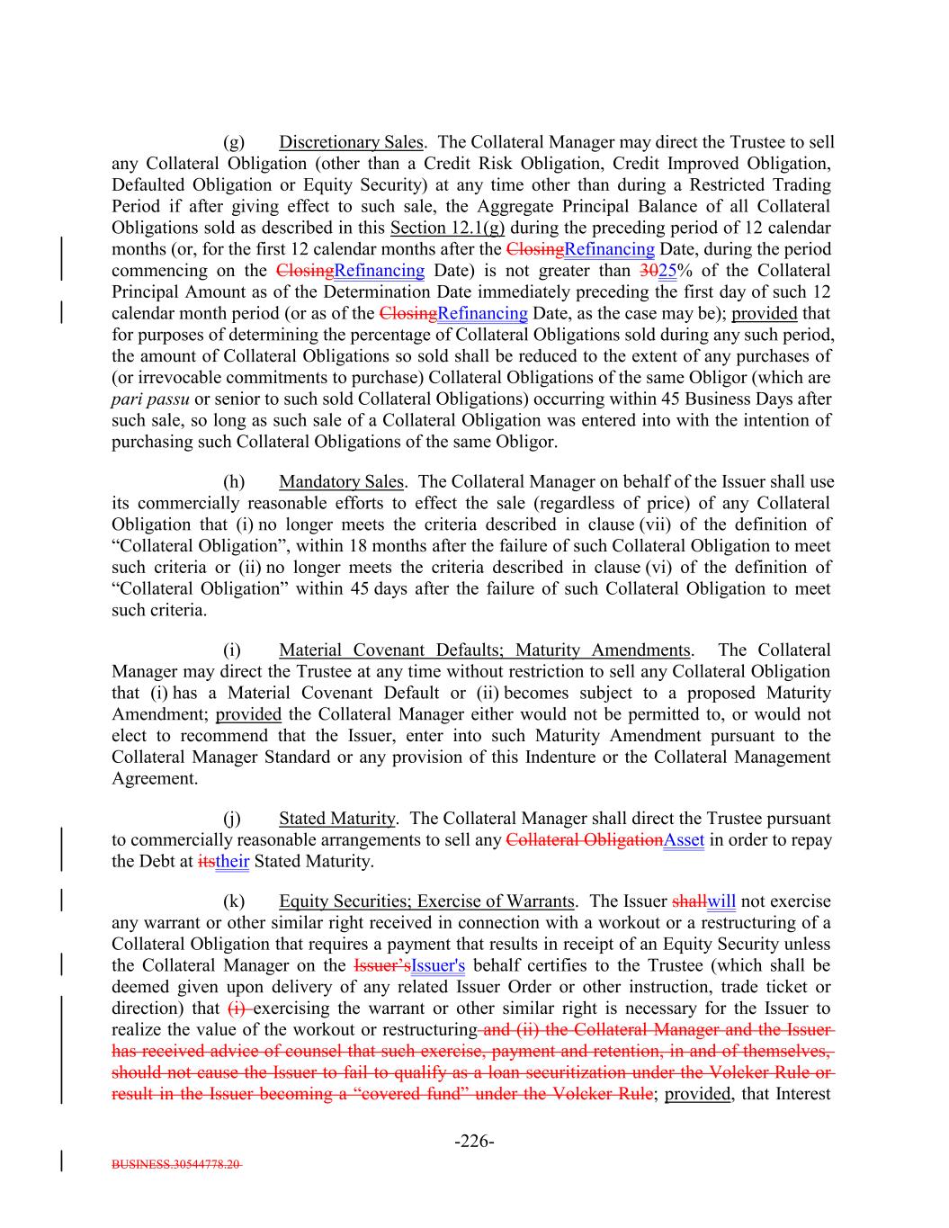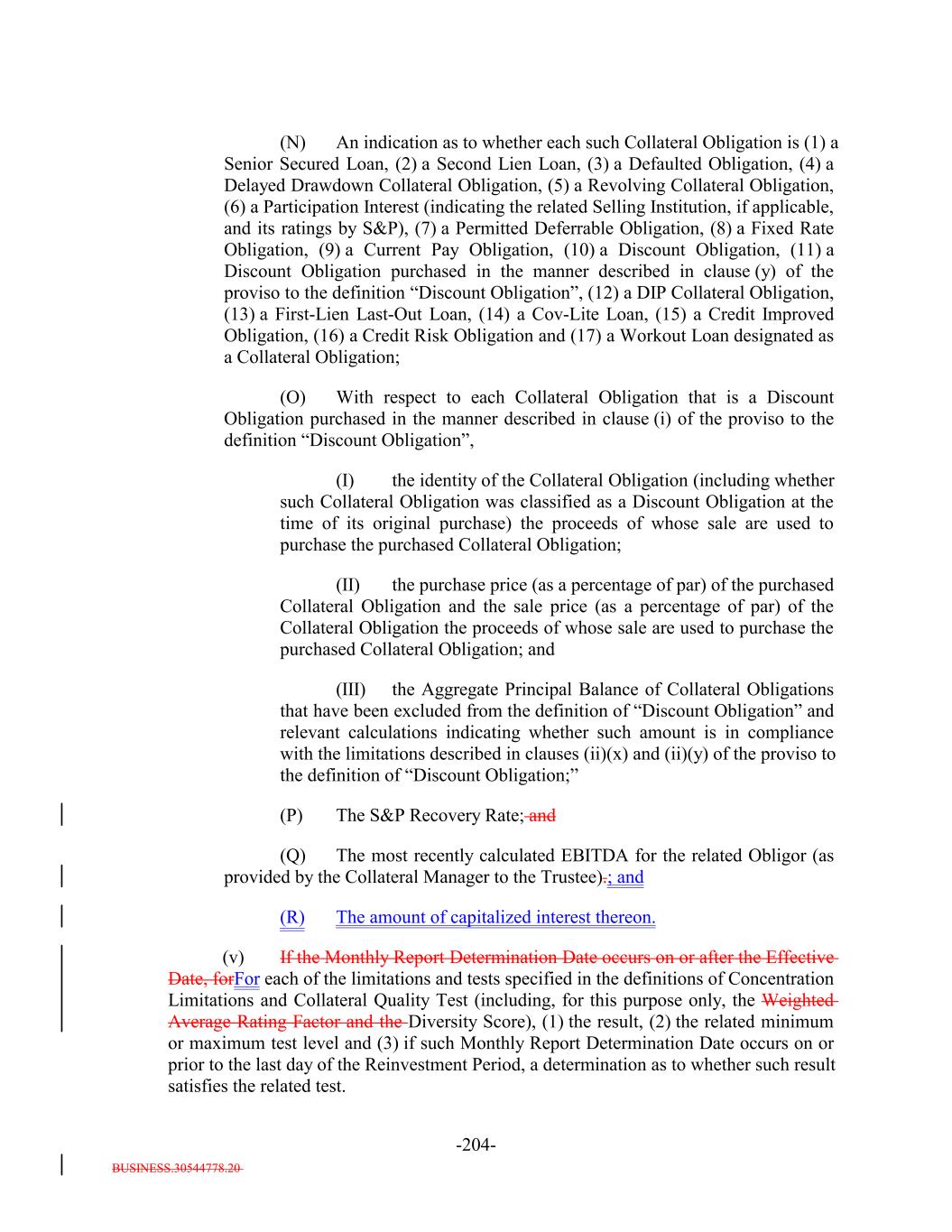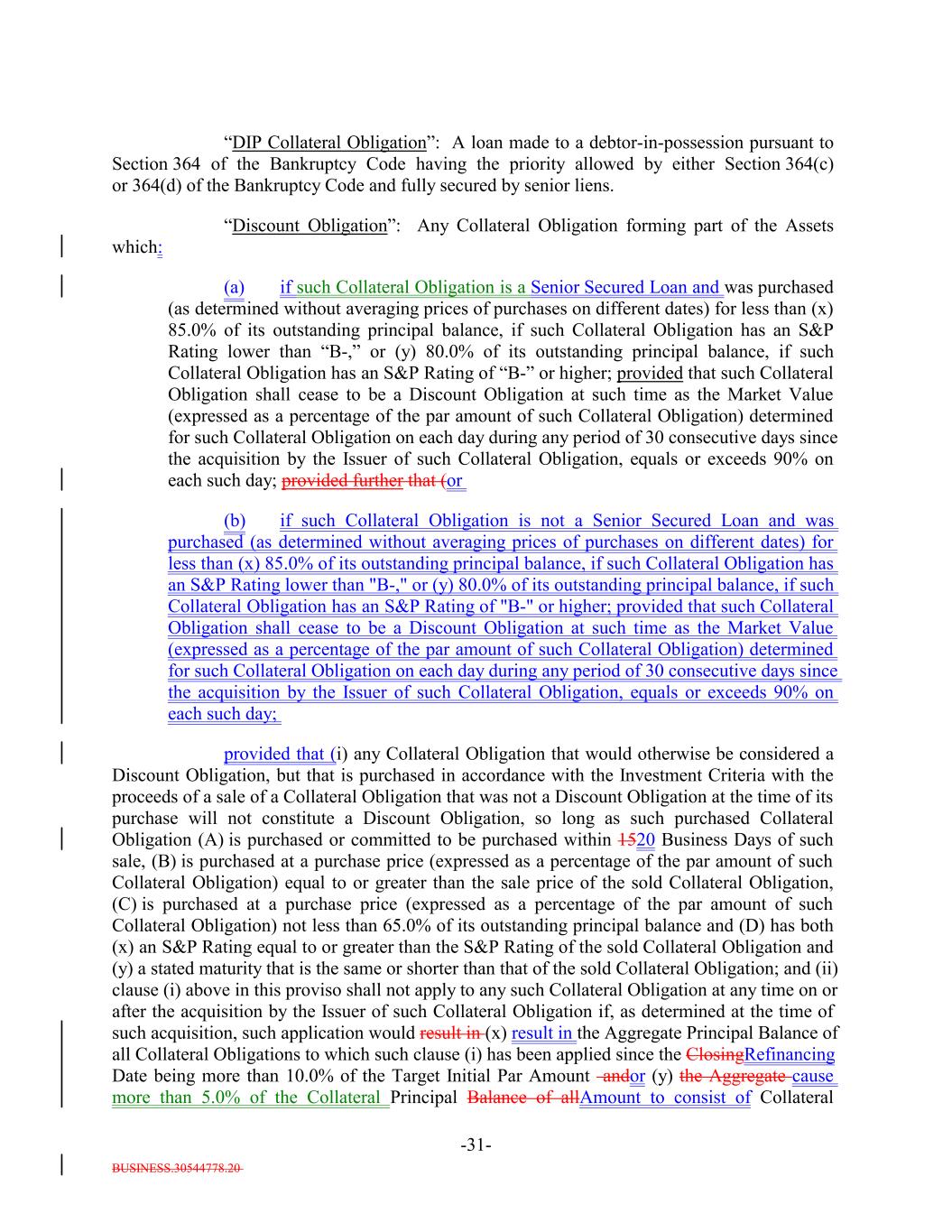 BUSINESS.30544778.20 -31- “DIP Collateral Obligation”: A loan made to a debtor-in-possession pursuant to Section 364 of the Bankruptcy Code having the priority allowed by either Section 364(c) or 364(d) of the Bankruptcy Code and fully secured by senior liens. “Discount Obligation”: Any Collateral Obligation forming part of the Assets which: (a) if such Collateral Obligation is a Senior Secured Loan and was purchased (as determined without averaging prices of purchases on different dates) for less than (x) 85.0% of its outstanding principal balance, if such Collateral Obligation has an S&P Rating lower than “B-,” or (y) 80.0% of its outstanding principal balance, if such Collateral Obligation has an S&P Rating of “B-” or higher; provided that such Collateral Obligation shall cease to be a Discount Obligation at such time as the Market Value (expressed as a percentage of the par amount of such Collateral Obligation) determined for such Collateral Obligation on each day during any period of 30 consecutive days since the acquisition by the Issuer of such Collateral Obligation, equals or exceeds 90% on each such day; provided further that (or (b) if such Collateral Obligation is not a Senior Secured Loan and was purchased (as determined without averaging prices of purchases on different dates) for less than (x) 85.0% of its outstanding principal balance, if such Collateral Obligation has an S&P Rating lower than "B-," or (y) 80.0% of its outstanding principal balance, if such Collateral Obligation has an S&P Rating of "B-" or higher; provided that such Collateral Obligation shall cease to be a Discount Obligation at such time as the Market Value (expressed as a percentage of the par amount of such Collateral Obligation) determined for such Collateral Obligation on each day during any period of 30 consecutive days since the acquisition by the Issuer of such Collateral Obligation, equals or exceeds 90% on each such day; provided that (i) any Collateral Obligation that would otherwise be considered a Discount Obligation, but that is purchased in accordance with the Investment Criteria with the proceeds of a sale of a Collateral Obligation that was not a Discount Obligation at the time of its purchase will not constitute a Discount Obligation, so long as such purchased Collateral Obligation (A) is purchased or committed to be purchased within 1520 Business Days of such sale, (B) is purchased at a purchase price (expressed as a percentage of the par amount of such Collateral Obligation) equal to or greater than the sale price of the sold Collateral Obligation, (C) is purchased at a purchase price (expressed as a percentage of the par amount of such Collateral Obligation) not less than 65.0% of its outstanding principal balance and (D) has both (x) an S&P Rating equal to or greater than the S&P Rating of the sold Collateral Obligation and (y) a stated maturity that is the same or shorter than that of the sold Collateral Obligation; and (ii) clause (i) above in this proviso shall not apply to any such Collateral Obligation at any time on or after the acquisition by the Issuer of such Collateral Obligation if, as determined at the time of such acquisition, such application would result in (x) result in the Aggregate Principal Balance of all Collateral Obligations to which such clause (i) has been applied since the ClosingRefinancing Date being more than 10.0% of the Target Initial Par Amount andor (y) the Aggregate cause more than 5.0% of the Collateral Principal Balance of allAmount to consist of Collateral