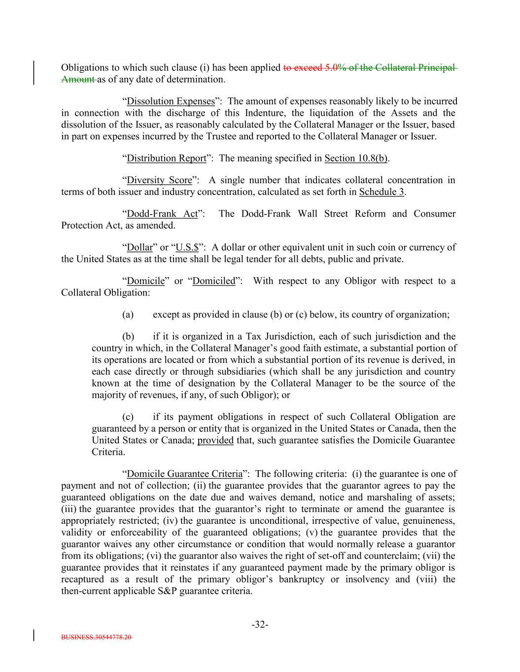 BUSINESS.30544778.20 -32- Obligations to which such clause (i) has been applied to exceed 5.0% of the Collateral Principal Amount as of any date of determination. “Dissolution Expenses”: The amount of expenses reasonably likely to be incurred in connection with the discharge of this Indenture, the liquidation of the Assets and the dissolution of the Issuer, as reasonably calculated by the Collateral Manager or the Issuer, based in part on expenses incurred by the Trustee and reported to the Collateral Manager or Issuer. “Distribution Report”: The meaning specified in Section 10.8(b). “Diversity Score”: A single number that indicates collateral concentration in terms of both issuer and industry concentration, calculated as set forth in Schedule 3. “Dodd-Frank Act”: The Dodd-Frank Wall Street Reform and Consumer Protection Act, as amended. “Dollar” or “U.S.$”: A dollar or other equivalent unit in such coin or currency of the United States as at the time shall be legal tender for all debts, public and private. “Domicile” or “Domiciled”: With respect to any Obligor with respect to a Collateral Obligation: (a) except as provided in clause (b) or (c) below, its country of organization; (b) if it is organized in a Tax Jurisdiction, each of such jurisdiction and the country in which, in the Collateral Manager’s good faith estimate, a substantial portion of its operations are located or from which a substantial portion of its revenue is derived, in each case directly or through subsidiaries (which shall be any jurisdiction and country known at the time of designation by the Collateral Manager to be the source of the majority of revenues, if any, of such Obligor); or (c) if its payment obligations in respect of such Collateral Obligation are guaranteed by a person or entity that is organized in the United States or Canada, then the United States or Canada; provided that, such guarantee satisfies the Domicile Guarantee Criteria. “Domicile Guarantee Criteria”: The following criteria: (i) the guarantee is one of payment and not of collection; (ii) the guarantee provides that the guarantor agrees to pay the guaranteed obligations on the date due and waives demand, notice and marshaling of assets; (iii) the guarantee provides that the guarantor’s right to terminate or amend the guarantee is appropriately restricted; (iv) the guarantee is unconditional, irrespective of value, genuineness, validity or enforceability of the guaranteed obligations; (v) the guarantee provides that the guarantor waives any other circumstance or condition that would normally release a guarantor from its obligations; (vi) the guarantor also waives the right of set-off and counterclaim; (vii) the guarantee provides that it reinstates if any guaranteed payment made by the primary obligor is recaptured as a result of the primary obligor’s bankruptcy or insolvency and (viii) the then-current applicable S&P guarantee criteria.