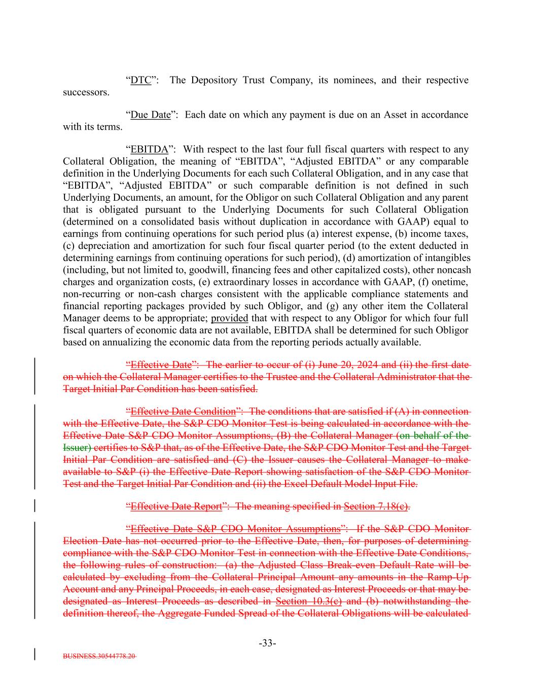 BUSINESS.30544778.20 -33- “DTC”: The Depository Trust Company, its nominees, and their respective successors. “Due Date”: Each date on which any payment is due on an Asset in accordance with its terms. “EBITDA”: With respect to the last four full fiscal quarters with respect to any Collateral Obligation, the meaning of “EBITDA”, “Adjusted EBITDA” or any comparable definition in the Underlying Documents for each such Collateral Obligation, and in any case that “EBITDA”, “Adjusted EBITDA” or such comparable definition is not defined in such Underlying Documents, an amount, for the Obligor on such Collateral Obligation and any parent that is obligated pursuant to the Underlying Documents for such Collateral Obligation (determined on a consolidated basis without duplication in accordance with GAAP) equal to earnings from continuing operations for such period plus (a) interest expense, (b) income taxes, (c) depreciation and amortization for such four fiscal quarter period (to the extent deducted in determining earnings from continuing operations for such period), (d) amortization of intangibles (including, but not limited to, goodwill, financing fees and other capitalized costs), other noncash charges and organization costs, (e) extraordinary losses in accordance with GAAP, (f) onetime, non-recurring or non-cash charges consistent with the applicable compliance statements and financial reporting packages provided by such Obligor, and (g) any other item the Collateral Manager deems to be appropriate; provided that with respect to any Obligor for which four full fiscal quarters of economic data are not available, EBITDA shall be determined for such Obligor based on annualizing the economic data from the reporting periods actually available. “Effective Date”: The earlier to occur of (i) June 20, 2024 and (ii) the first date on which the Collateral Manager certifies to the Trustee and the Collateral Administrator that the Target Initial Par Condition has been satisfied. “Effective Date Condition”: The conditions that are satisfied if (A) in connection with the Effective Date, the S&P CDO Monitor Test is being calculated in accordance with the Effective Date S&P CDO Monitor Assumptions, (B) the Collateral Manager (on behalf of the Issuer) certifies to S&P that, as of the Effective Date, the S&P CDO Monitor Test and the Target Initial Par Condition are satisfied and (C) the Issuer causes the Collateral Manager to make available to S&P (i) the Effective Date Report showing satisfaction of the S&P CDO Monitor Test and the Target Initial Par Condition and (ii) the Excel Default Model Input File. “Effective Date Report”: The meaning specified in Section 7.18(c). “Effective Date S&P CDO Monitor Assumptions”: If the S&P CDO Monitor Election Date has not occurred prior to the Effective Date, then, for purposes of determining compliance with the S&P CDO Monitor Test in connection with the Effective Date Conditions, the following rules of construction: (a) the Adjusted Class Break-even Default Rate will be calculated by excluding from the Collateral Principal Amount any amounts in the Ramp-Up Account and any Principal Proceeds, in each case, designated as Interest Proceeds or that may be designated as Interest Proceeds as described in Section 10.3(c) and (b) notwithstanding the definition thereof, the Aggregate Funded Spread of the Collateral Obligations will be calculated