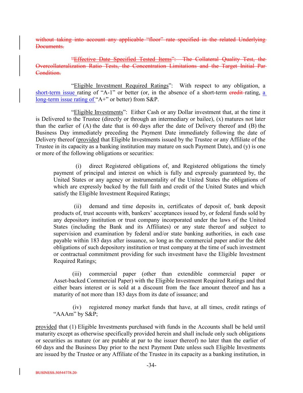 BUSINESS.30544778.20 -34- without taking into account any applicable “floor” rate specified in the related Underlying Documents. “Effective Date Specified Tested Items”: The Collateral Quality Test, the Overcollateralization Ratio Tests, the Concentration Limitations and the Target Initial Par Condition. “Eligible Investment Required Ratings”: With respect to any obligation, a short-term issue rating of “A-1” or better (or, in the absence of a short-term credit rating, a long-term issue rating of “A+” or better) from S&P. “Eligible Investments”: Either Cash or any Dollar investment that, at the time it is Delivered to the Trustee (directly or through an intermediary or bailee), (x) matures not later than the earlier of (A) the date that is 60 days after the date of Delivery thereof and (B) the Business Day immediately preceding the Payment Date immediately following the date of Delivery thereof (provided that Eligible Investments issued by the Trustee or any Affiliate of the Trustee in its capacity as a banking institution may mature on such Payment Date), and (y) is one or more of the following obligations or securities: (i) direct Registered obligations of, and Registered obligations the timely payment of principal and interest on which is fully and expressly guaranteed by, the United States or any agency or instrumentality of the United States the obligations of which are expressly backed by the full faith and credit of the United States and which satisfy the Eligible Investment Required Ratings; (ii) demand and time deposits in, certificates of deposit of, bank deposit products of, trust accounts with, bankers’ acceptances issued by, or federal funds sold by any depository institution or trust company incorporated under the laws of the United States (including the Bank and its Affiliates) or any state thereof and subject to supervision and examination by federal and/or state banking authorities, in each case payable within 183 days after issuance, so long as the commercial paper and/or the debt obligations of such depository institution or trust company at the time of such investment or contractual commitment providing for such investment have the Eligible Investment Required Ratings; (iii) commercial paper (other than extendible commercial paper or Asset-backed Commercial Paper) with the Eligible Investment Required Ratings and that either bears interest or is sold at a discount from the face amount thereof and has a maturity of not more than 183 days from its date of issuance; and (iv) registered money market funds that have, at all times, credit ratings of “AAAm” by S&P; provided that (1) Eligible Investments purchased with funds in the Accounts shall be held until maturity except as otherwise specifically provided herein and shall include only such obligations or securities as mature (or are putable at par to the issuer thereof) no later than the earlier of 60 days and the Business Day prior to the next Payment Date unless such Eligible Investments are issued by the Trustee or any Affiliate of the Trustee in its capacity as a banking institution, in